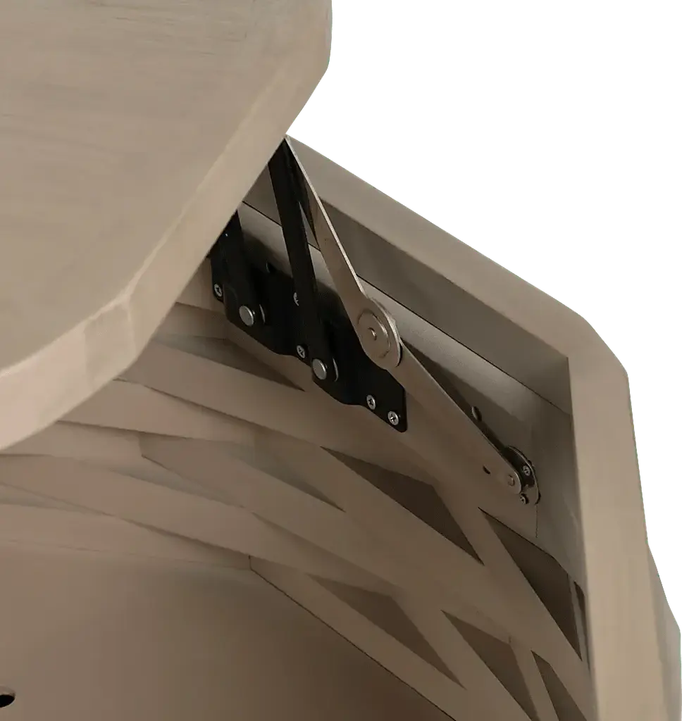The Hookmart tan cocktail table is crafted from solid bayur wood, featuring a warm tan/beige stained finish that enhances its natural grain. Its unique body design mimics stacked, interwoven layers, creating a sculptural and textured effect. The smooth, circular top highlights a subtle radial wood pattern, adding to its artisanal appeal. Designed for both style and function, the lift-top mechanism provides concealed storage. Arriving fully assembled, this piece brings organic elegance to any space.