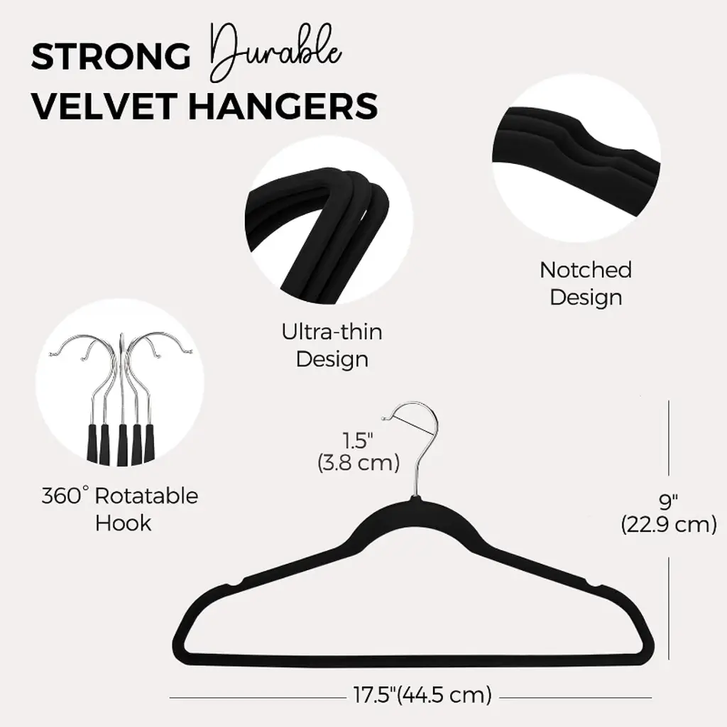 The HOUSE DAY Black Velvet Hangers offer a blend of functionality and elegance for your wardrobe needs. These hangers are made from high-grade ABS plastic, capable of holding up to 11lbs, making them suitable for a variety of clothing including heavy coats and suits. The soft velvet material is gentle on both skin and garments, preventing damage and ensuring your clothes remain wrinkle-free. Each hanger measures 17.5"L x 1/4"W x 9"H, featuring a non-slip design with a specially developed shoulder line and grooves for hanging items with thin straps. The ultra-thin structure maximizes closet space by up to 75%, and a 360-degree swivel metal hook facilitates easy sorting and access to your clothes.