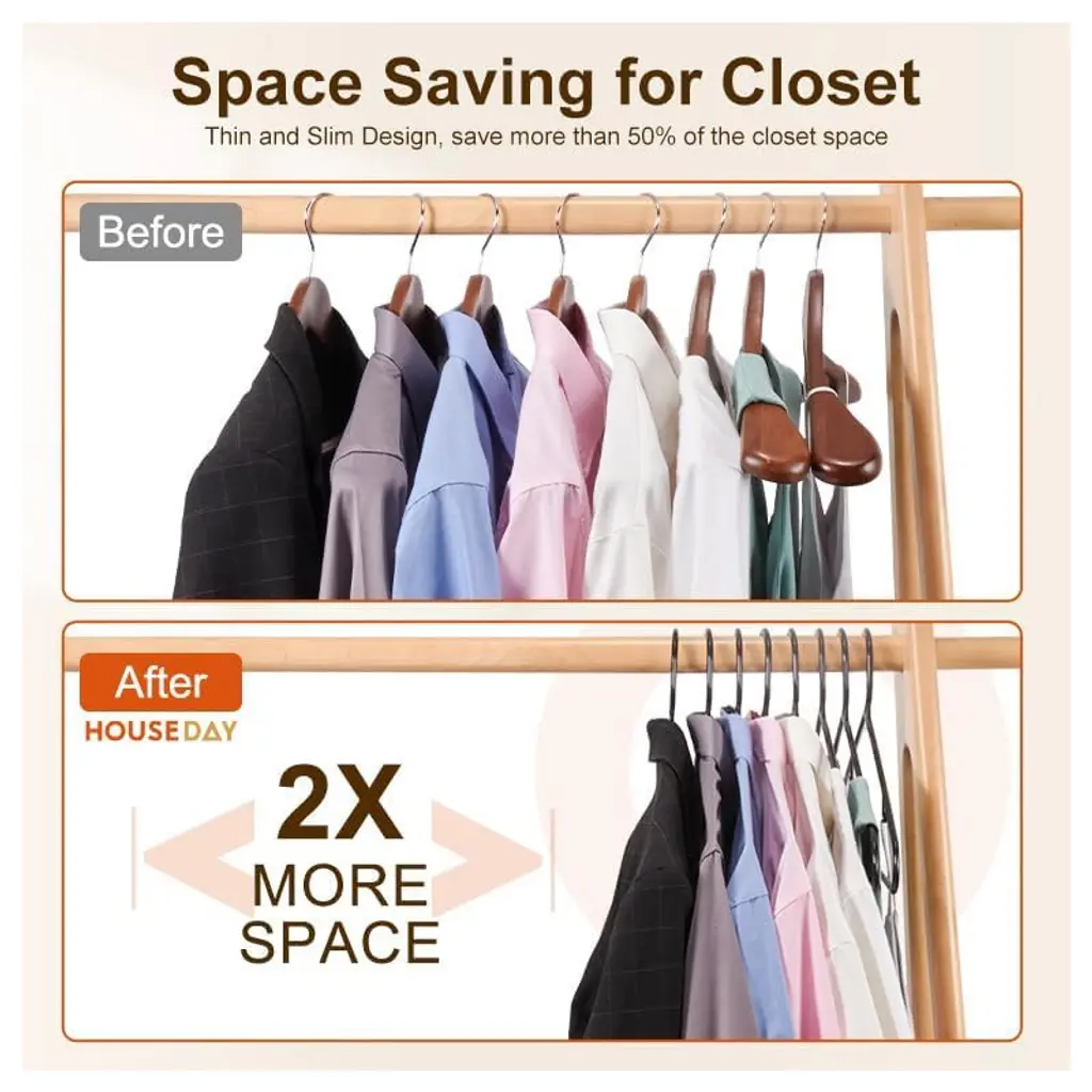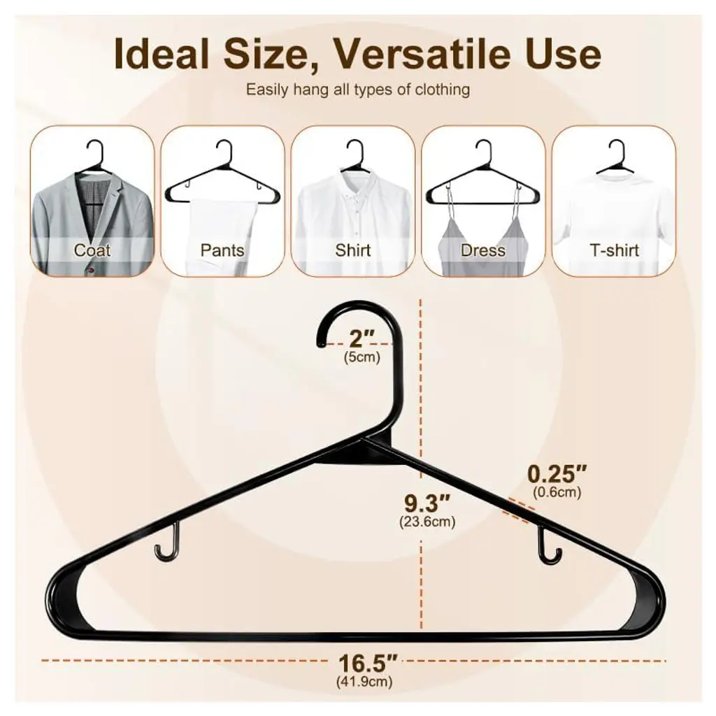 The HOUSE DAY Black Plastic Hangers are a practical and efficient choice for your clothing organization needs. Made from durable plastic, these hangers are designed to be both strong and flexible, ideal for lightweight garments without risking damage or unwanted creases. Each hanger measures 16.4” in length and 9.3” in height, with a slim profile of ¼” thickness, making them suitable for adult-sized clothing including shirts, jackets, and pants. The smooth-edged design ensures that clothes remain mark-free, while their durable construction simplifies wardrobe organization. This pack includes 60 odor-free black plastic hangers, ready to use straight out of the box.