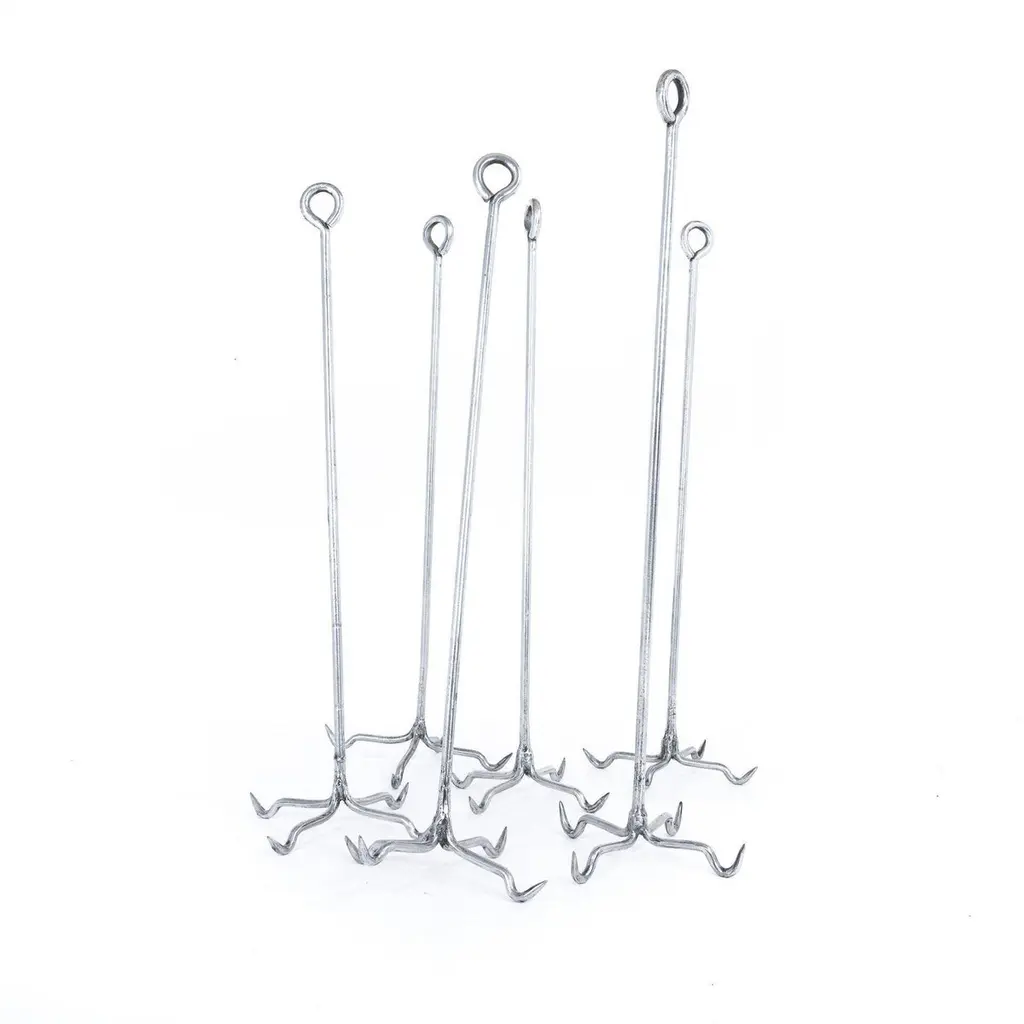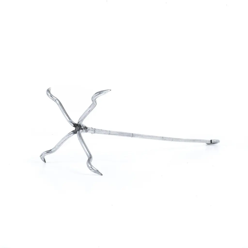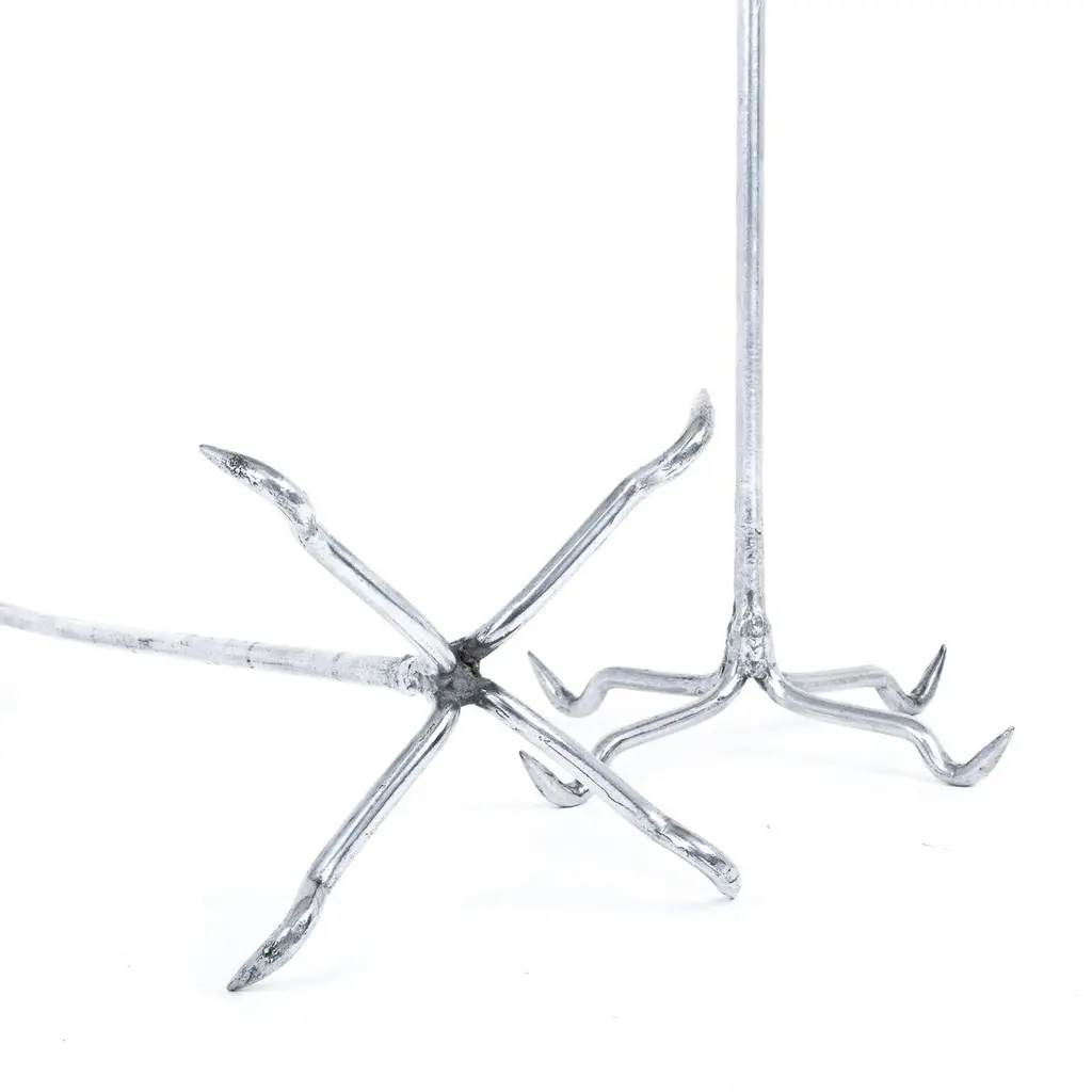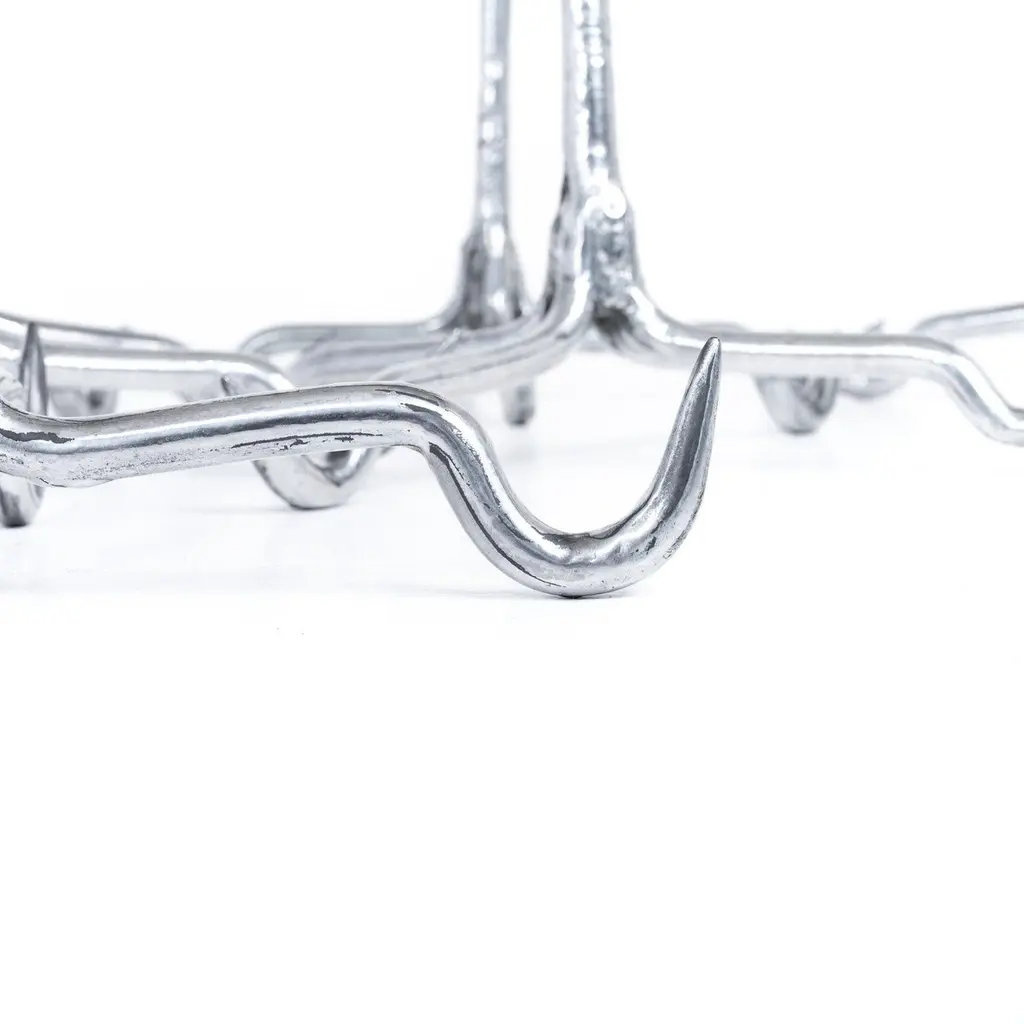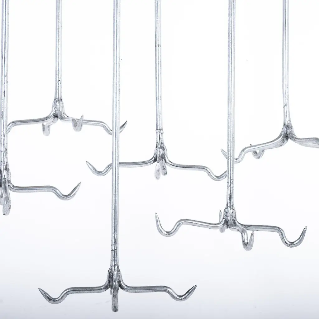 Huge reclaimed Slaughterhouse meat hooks15 Available priced per hook.XXL 4 way vintage meat hooks salvaged from a former slaughterhouse.British circa 1940.Fabulous decorative item which can be used as a feature to hang lighting and decorative objects and also a great window display item.Will fit easily to a rail made from regular 33.7mm galvanised tube and tube clamp fittings.Technical Details.Measures: Height Between 1300mm - 1600mmWidth Between 450mm - 600mmWeight 11 kgColour / Materials Polished SteelOur original vintage items are reclaimed from industrial & public settings and due to the nature of their original life have received wear and tear creating the wonderful individual character of our pieces.We have tried our upmost to offer a true reflection of the product you will receive through our product photography.