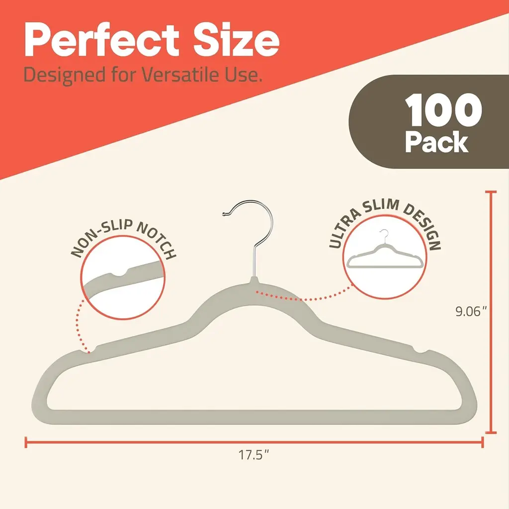 Discover the ultimate solution to your closet organization with our hangers Engineered with a robust recycled ABS construction, a smooth ivory velvet finish, and a sturdy metal hook, these hangers are designed to handle up to 10 lbs effortlessly—perfect for both everyday wear and heavy-duty garments. The non-slip velvet surface ensures your clothes remain securely in place, preserving their shape and eliminating unwanted creases. With a 360° swivel hook for effortless access and adjustment, you'll enjoy quick and easy organization every morning. Our ultra-thin, space-saving hangers maximize your closet capacity, making it easier than ever to achieve a neat and organized wardrobe. The sleek, modern design not only elevates the aesthetic of your space but also contributes to an efficient, frustration-free hanging experience. Whether you’re refreshing your closet at home or outfitting a dorm room, these versatile velvet hangers provide the perfect blend of durability, functionality, and style for all your clothing needs.