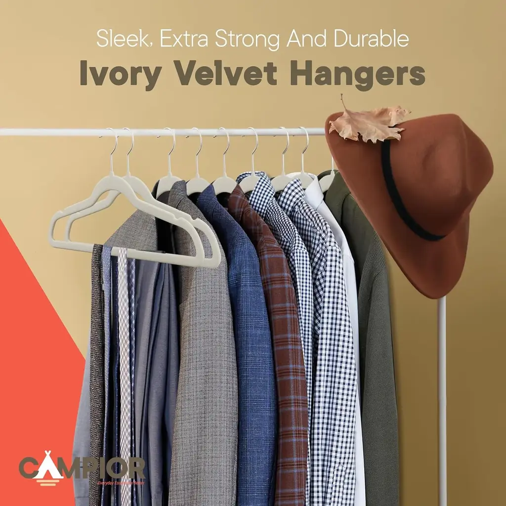 Discover the ultimate solution to your closet organization with our hangers Engineered with a robust recycled ABS construction, a smooth ivory velvet finish, and a sturdy metal hook, these hangers are designed to handle up to 10 lbs effortlessly—perfect for both everyday wear and heavy-duty garments. The non-slip velvet surface ensures your clothes remain securely in place, preserving their shape and eliminating unwanted creases. With a 360° swivel hook for effortless access and adjustment, you'll enjoy quick and easy organization every morning. Our ultra-thin, space-saving hangers maximize your closet capacity, making it easier than ever to achieve a neat and organized wardrobe. The sleek, modern design not only elevates the aesthetic of your space but also contributes to an efficient, frustration-free hanging experience. Whether you’re refreshing your closet at home or outfitting a dorm room, these versatile velvet hangers provide the perfect blend of durability, functionality, and style for all your clothing needs.