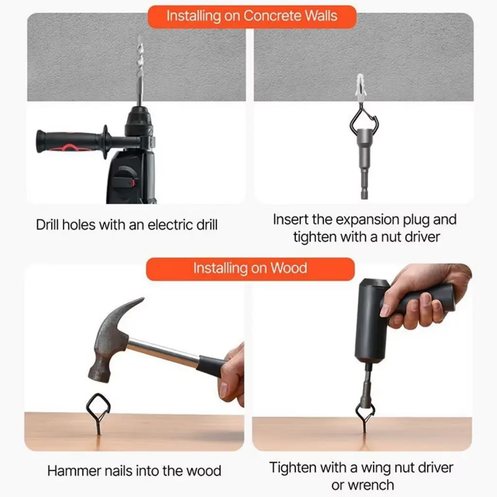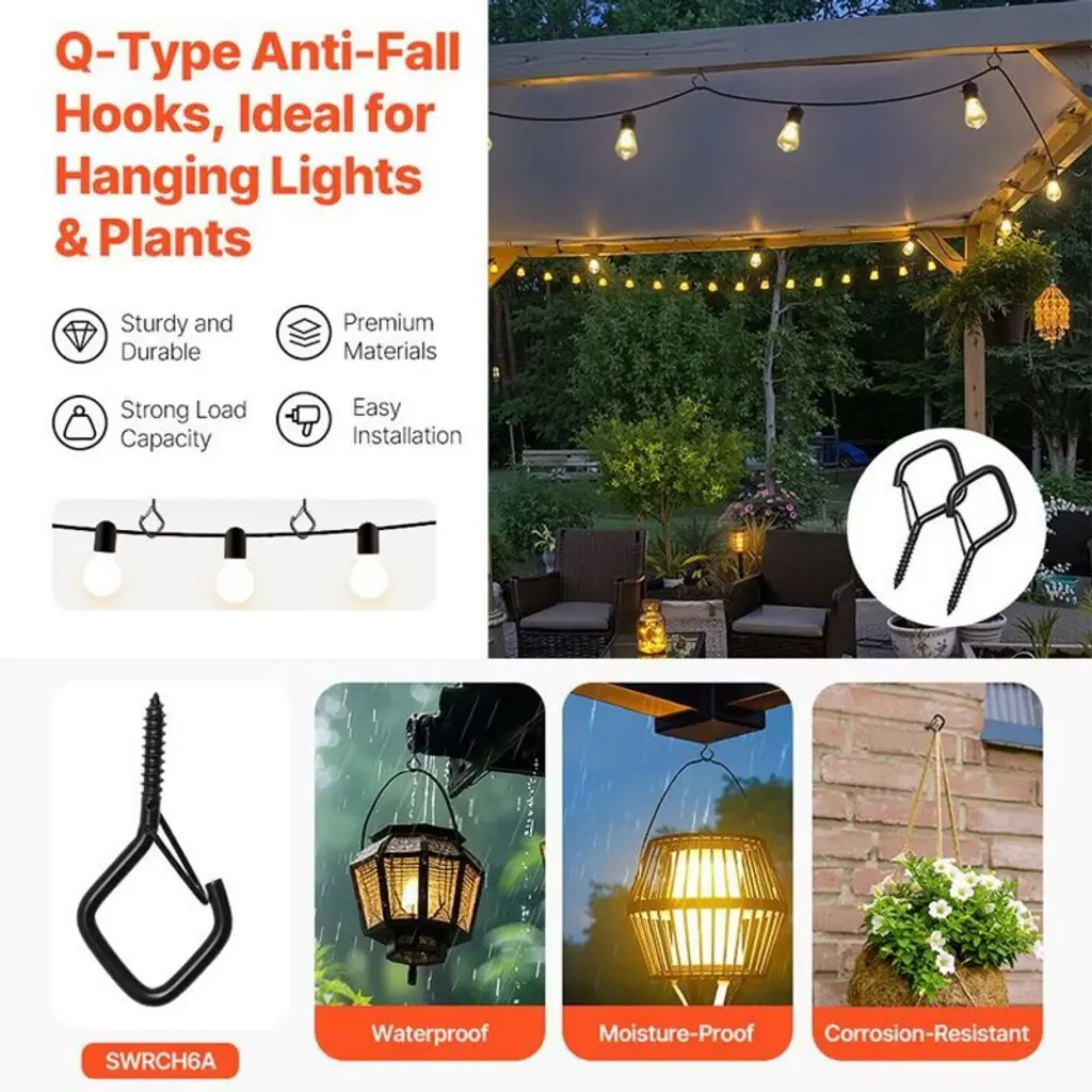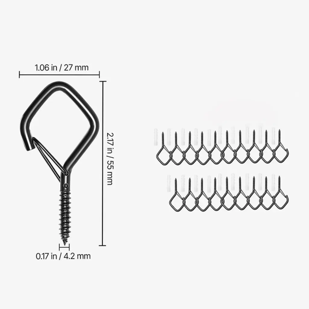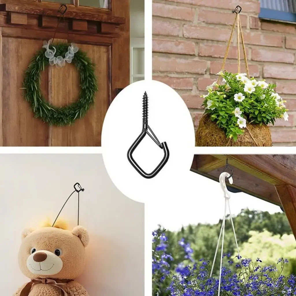 Upgrade your storage and hanging solutions with these heavy-duty Q-Type Screw Hooks. Featuring a stable Q-shaped structure, each hook supports up to 40 lbs, offering superior strength compared to regular hooks. The built-in security lock keeps items safely in place, even in windy conditions, making them ideal for both indoor and outdoor use. Crafted from rust-resistant metal with a special anti-corrosion coating, these hooks are built to withstand rain, humidity, and long-term use. Easy to install on wood, concrete, or other surfaces, they are perfect for patios, balconies, kitchens, and workshops. A reliable, space-saving solution for organizing and decorating your home with style and efficiency.