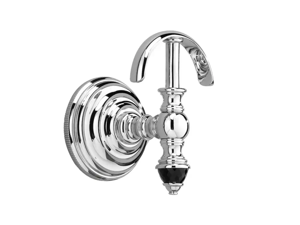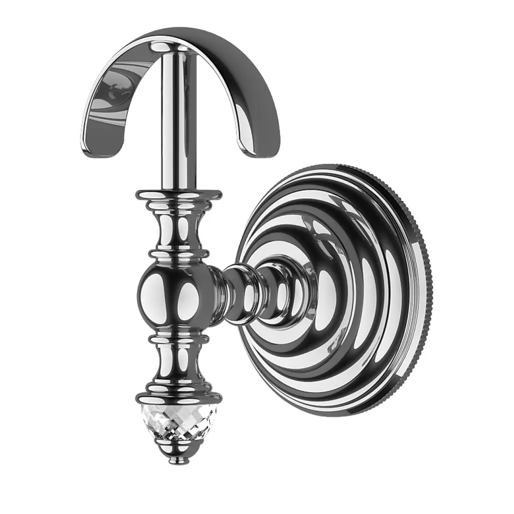 JUBILEE is an elegant brass robe hook characterized by its refined wall coupler with hexagonal base, inspired by a clear retro style.In this splendid new collection, Jubilee is characterized by a meticulously crafted, decò design: the expression of an authentic luxury item that is waning with the passing of time. The collection comprises: three-hole washbasin and bidet taps, single-hole for bidet, wall-mounted bathtub tap unit, deck-mounted bathtub tap unit (also with four holes), free standing legs, three-hole bath mixer and three-hole shower mixer with plate. Additionally, the Dual Control thermostatic shower mixer, with a practical dual controller for regulating temperature and water pressure, adds the finishing touch to the collection. The Jubilee collection is produced in a fused brass in the following finishes: chrome, light gold and polished nickel. The new series of accessories, which are compatible with the Jubilee tap collection, adds the finishing touch in bathroom sophistication. Reflecting the brand’s unmistakeable style, the Jubilee collection stands out for the high quality of the materials and finishes used and for its expert craftsmanship. Jubilee comprises the full range of Accessories: ceramic glass holder, soap dish, towel ring, toilet roll holder, extra-light glass shelf, toilet brush holder and towel rail. The accessories are made in turned brass and fine white ceramic with the following finishes: chrome, light gold and polished nickel.