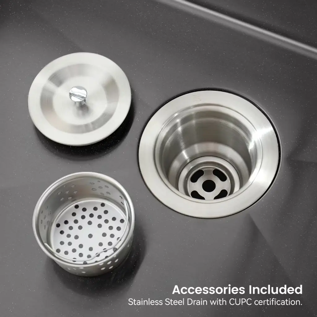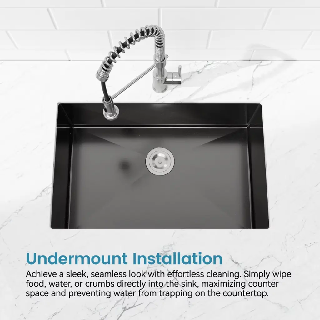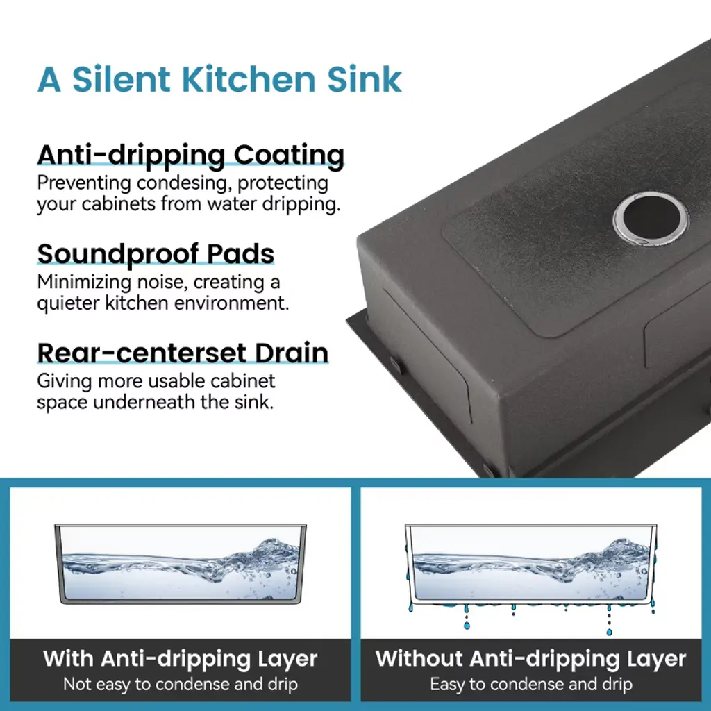 Crafted from premium 304 stainless steel with a sustainable brushed finish, this kitchen sink offers exceptional durability, corrosion resistance, and a sleek, modern look that elevates any space. Its spacious single bowl design provides ample room for dishwashing and food prep, while the undermount installation ensures a seamless and easy-to-clean surface. Built with gauge 20 steel and sound-absorbing layers, it delivers long-lasting strength and a quieter kitchen environment. Drain grooves ensure smooth water flow, and the special coating prevents dripping and protects your cabinetry from moisture damage. Rounded corners add both safety and cleaning convenience, while the included US-standard drain and hooks enhance everyday usability.