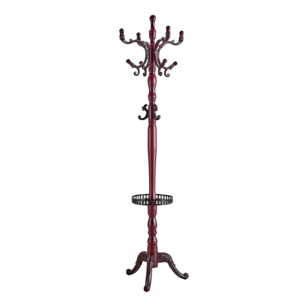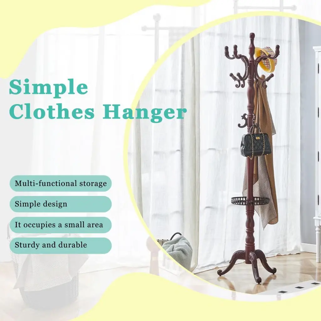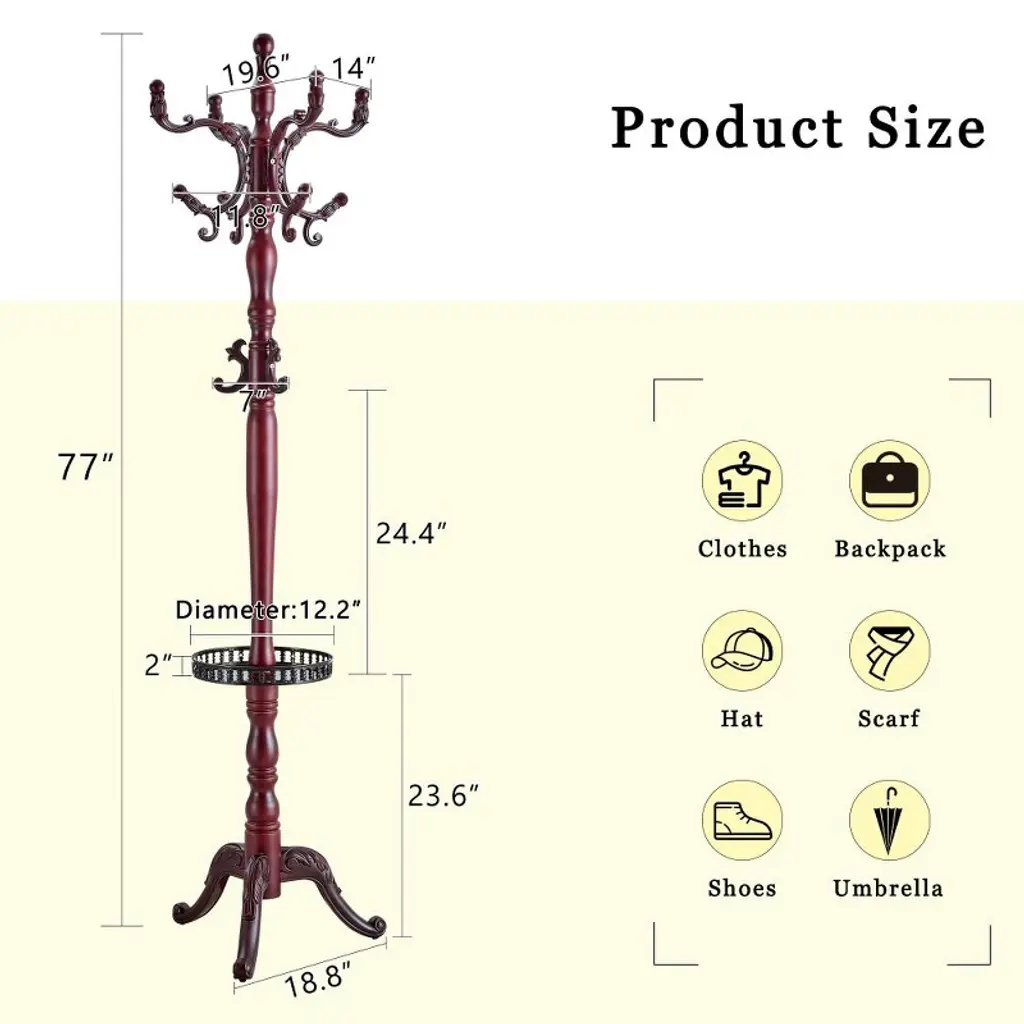 Elevate your entryway or bedroom with this modern minimalist floor-standing coat rack, designed to offer both style and practicality. Standing at 77 inches tall with a sleek 12.2-inch stainless steel base, it blends seamlessly into contemporary interiors while saving floor space. Crafted from natural solid wood and paired with durable resin hooks and feet, it provides a sturdy yet lightweight structure for everyday use. The built-in tray at the top is ideal for storing keys, wallets, and other small essentials, while multiple hooks accommodate coats, hats, and bags. With its dual color options—natural wood and dark walnut—it complements a wide range of home decor styles. Easy to assemble and supported by responsive customer service, this coat rack is the perfect fusion of form and function.