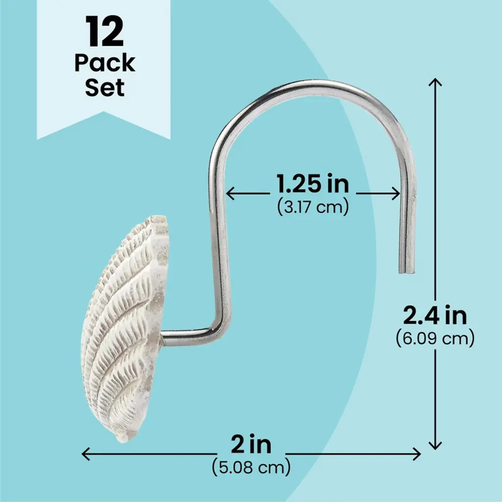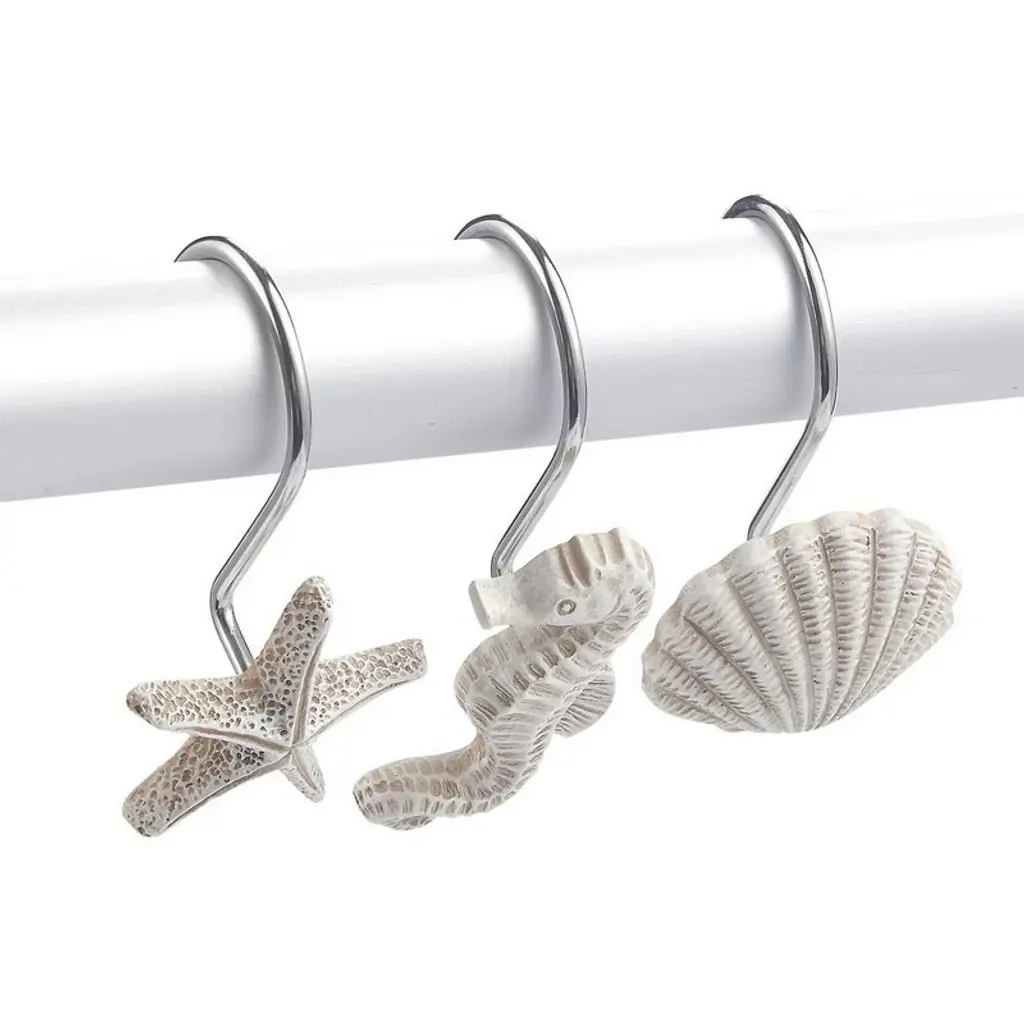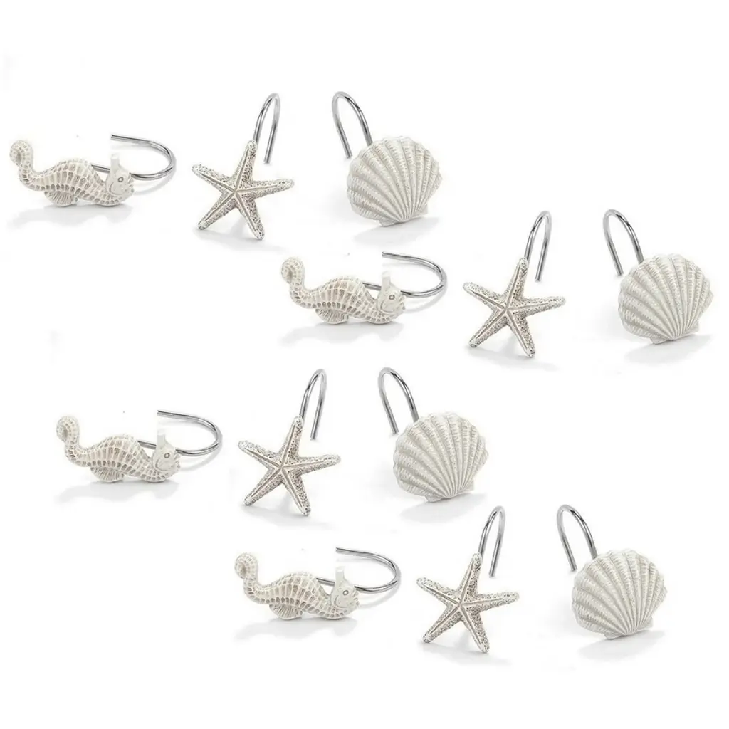 Enhance your bathroom's ambiance with these nautical shower curtain hooks. This set of 12 exquisite hooks is the perfect addition to your beach, nautical, or sea-themed decor, effortlessly creating a coordinated theme throughout your bathroom. Immerse yourself in the captivating charm of the assorted starfish, seashell, and seahorse designs adorning these decorative hooks. Not only are they visually appealing, but they also serve a functional purpose. Effortlessly loop your shower curtain through the starfish-shaped hooks and hang them onto any curved or straight curtain rod, instantly transforming your shower area into an oceanic haven. Crafted with meticulous attention to detail, each nautical shower curtain hook measures 2 x 2.4 inches, with a diameter of 1.25 inches. Their sturdy construction helps to ensure long-lasting durability, allowing you to enjoy their beauty and functionality for years to come. Revitalize your bathroom decor with these starfish shower curtain hooks that will enable you to elevate your shower experience and indulge in the beauty of the deep blue sea every day.