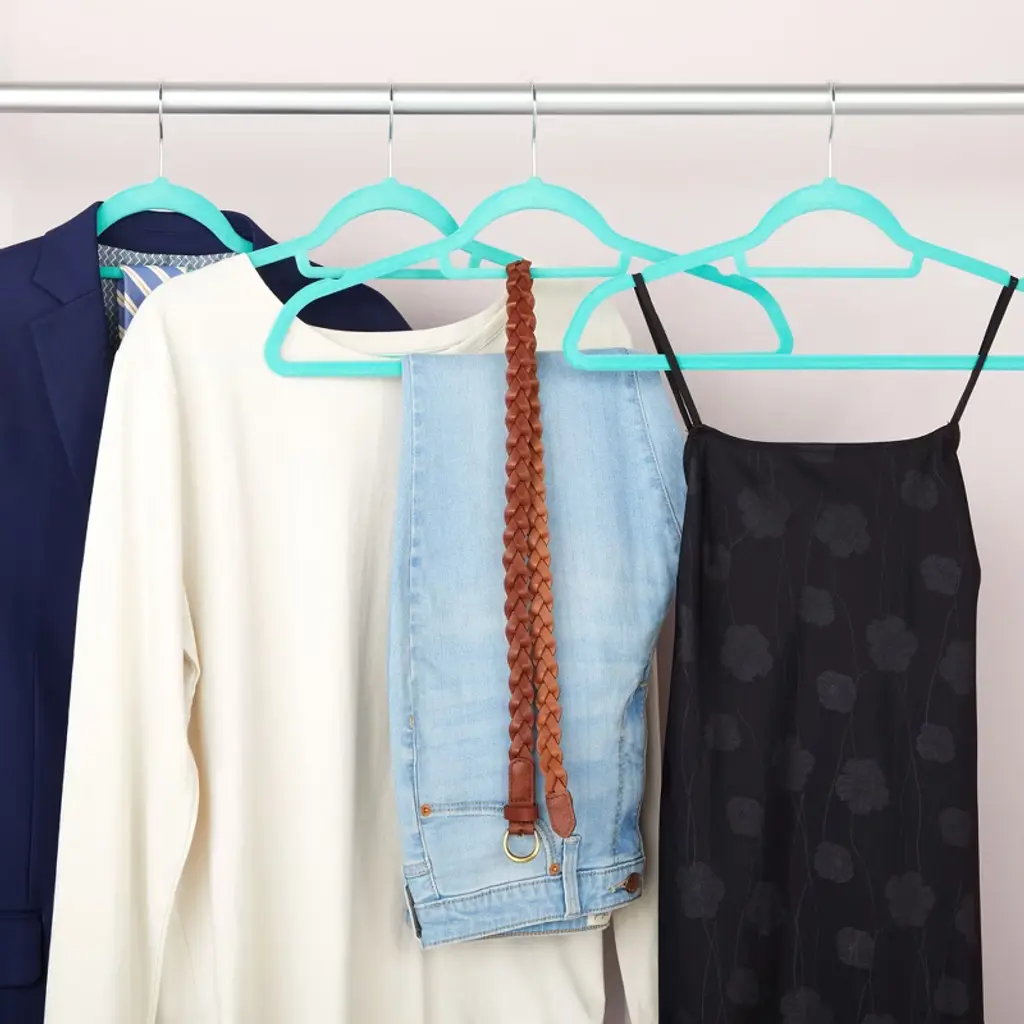 Save valuable space in your closet, armoire, or wardrobe with our velvet hangers 50 pack featuring cascading hooks. Designed with a small accessory bar and notched shoulders, these non-slip hangers will keep delicate camisoles, undergarments, gowns, and dresses securely in place. No more rummaging through your messy closet; our slim velvet hangers each have a small hook in the center, allowing you to hang multiple graphic t-shirts, tank tops, and tank tops at once! The velvet shirt hangers measure 18 x 9.2 x 0.2 inches with a slim design that allows you to maximize your closet space. These teal clothes hangers velvet material makes accessing clothing simple and easy! They can also be used in shopping boutiques, small apartment closets, and small armoires. Plus, the velvet material is soft and gentle on your most delicate clothing. Today, you can transform your cluttered closet into a haven of organization with our non slip hangers 50 pack! Finally, you can spend your time on the things that truly matter, knowing that your clothes are perfectly hung and easily accessible. When your closet space is in order, you'll feel a sense of calm and clarity that extends beyond your wardrobe. An organized space is the first step towards an organized life, and with our velvet pants hangers, you can take that first step!