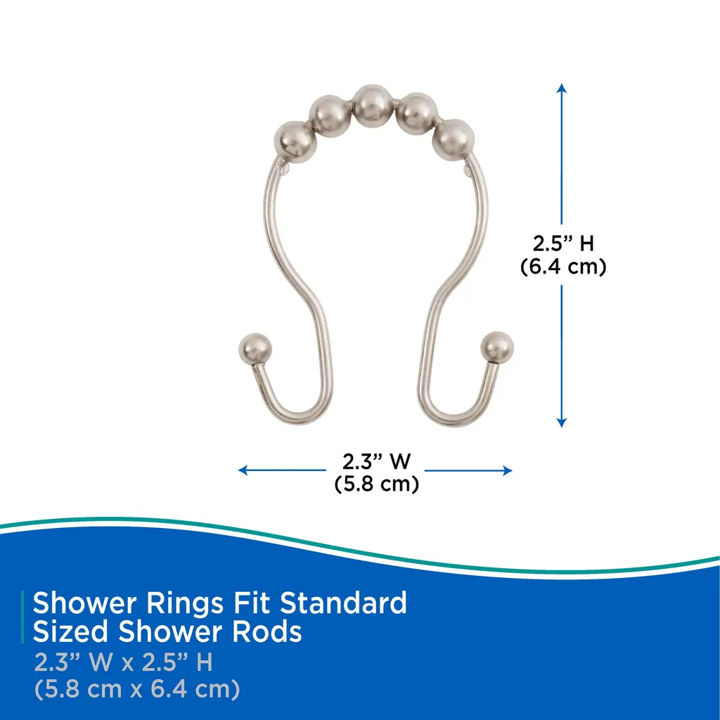 This set of twelve Kenney Beaded Roller Shower Curtain Double Hooks are designed to coordinate with many bathroom hardware finishes. With an additional hook on the back, use these to hang both a shower liner and a shower curtain separately, making it easy to remove or replace either. The beads help the hooks to glide effortlessly over your shower rod. Each package includes 12 double hooks, fitting all standard shower liners and rods.
