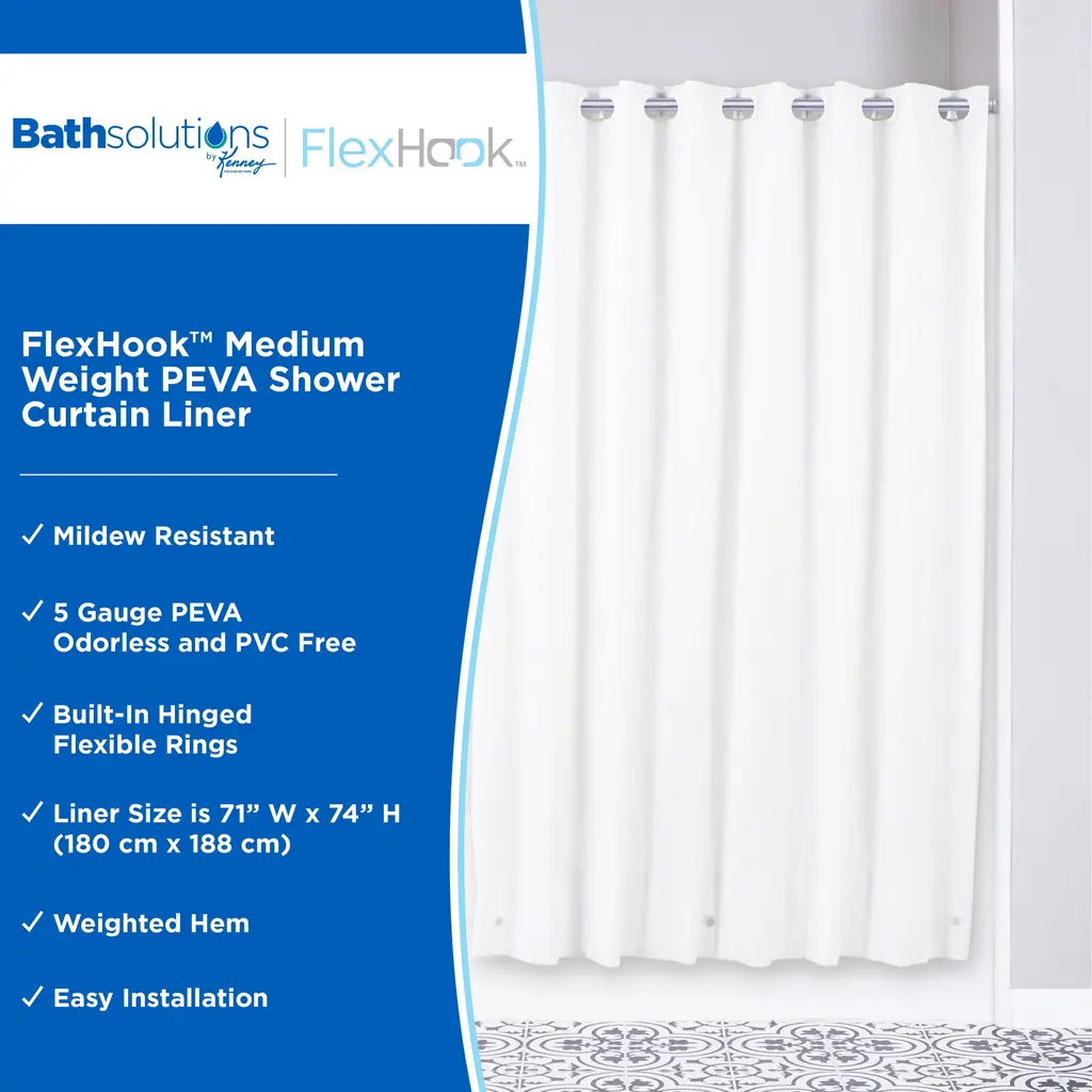 Kenney Flexhook Medium Weight Peva Shower Curtain Liner, 71" W X 74" H - White