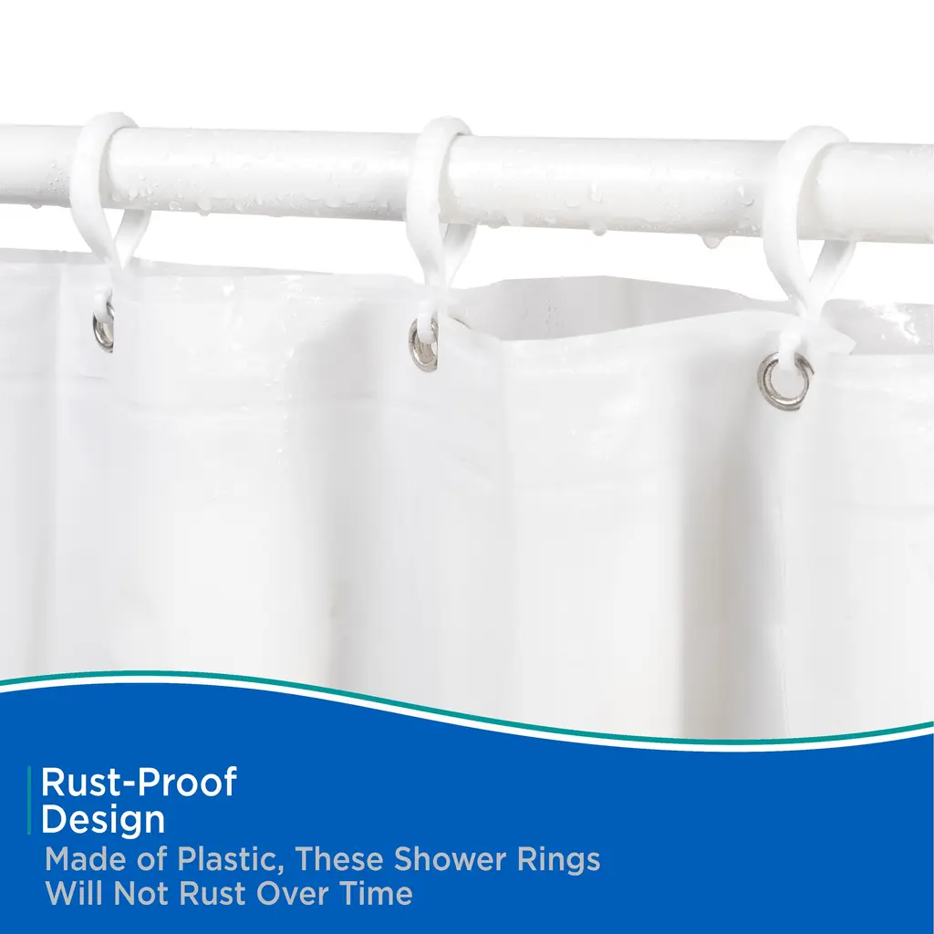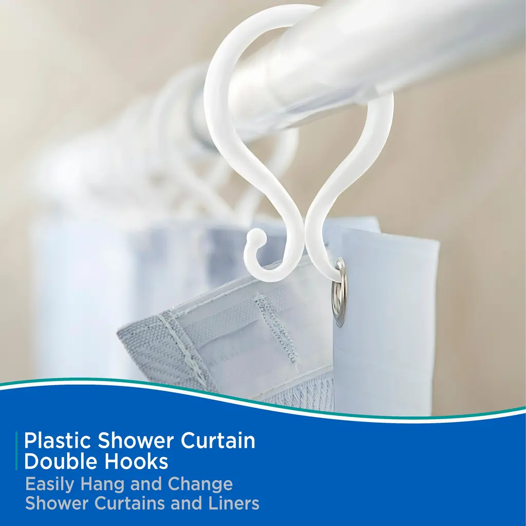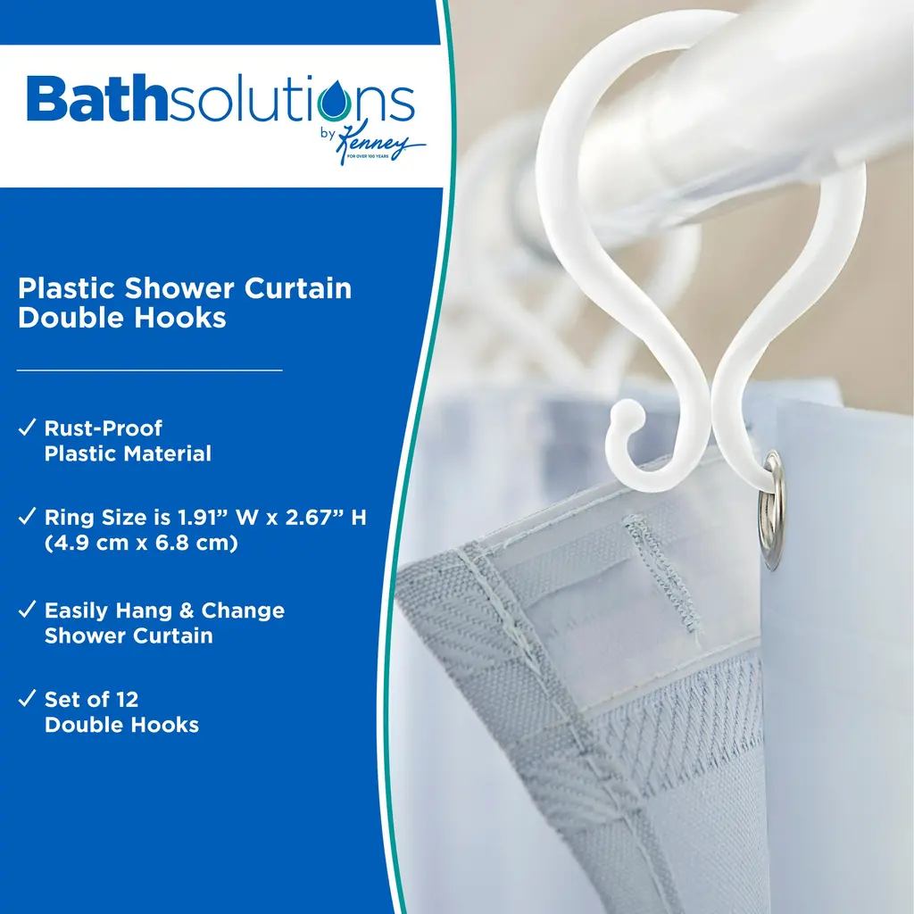 This set of twelve Kenney Shower Curtain Double Hooks come in several base colors to coordinate with many bathroom hardware finishes. Made of plastic, these shower curtain hooks will not rust in your bath. With an additional hook on the back, use these to hang both a shower liner and a shower curtain separately, making it easy to remove or replace either. Each package includes 12 double hooks, fitting all standard shower liners and rods.