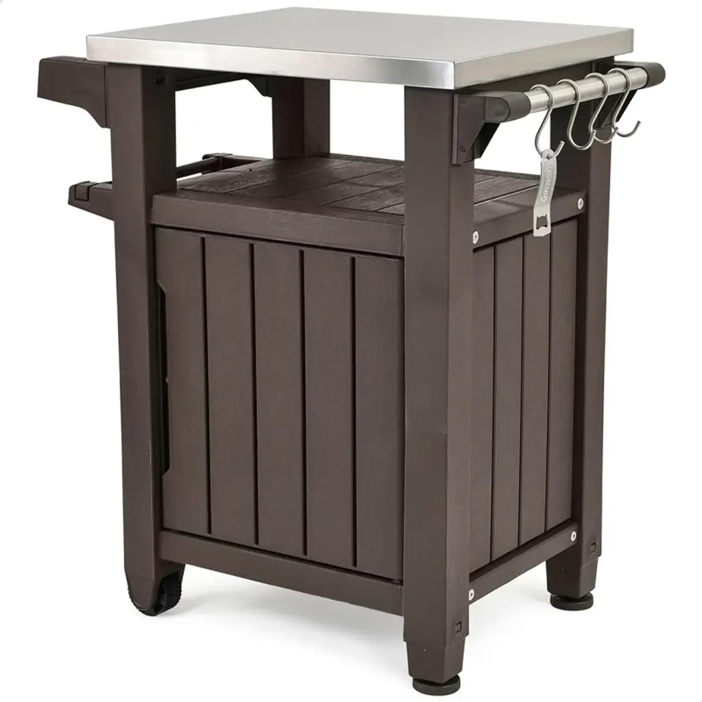 Keter Unity 40 Gallon Portable Weatherproof Outdoor Grill Table Cart With Stainless Steel Countertop, Hook Storage Hangers, And Sidebars, Gray