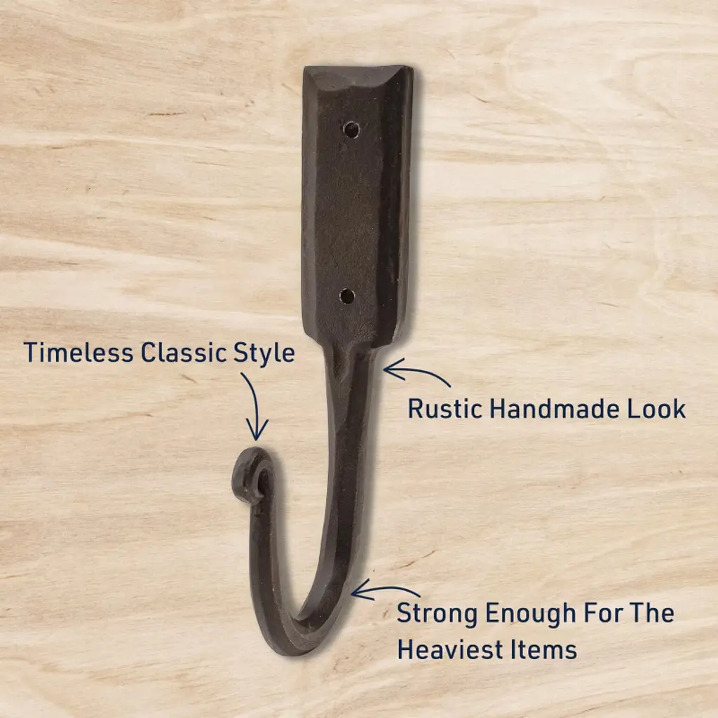 Heavy duty hanging tasks are no match for these Black Coat Hooks by Kings County Tools. These decorative wall hooks are rustic by design, individually hammered by blacksmiths in iron forges, which gives each coat hook its own unique character. The artistry involved in the process of making these wall mount coat hooks shows in the hammer marks, beveled edges, and elegantly curled hook heads, which also function to prevent catches or tears. These rustic wall hooks lend a unique farmhouse feel to your home decor while meeting your kitchen, bathroom, or entryway storage needs. Kings County Tools is your source for unique storage solutions with quality you can count on.