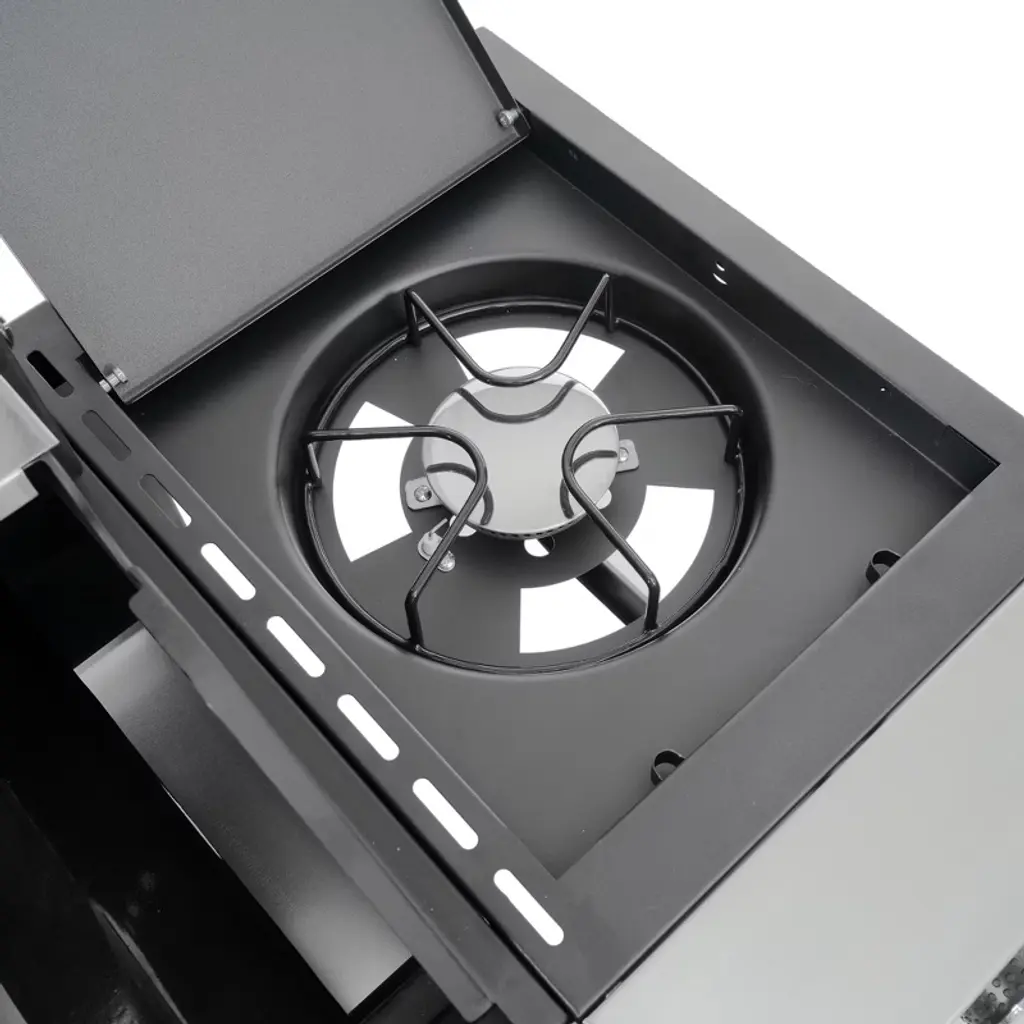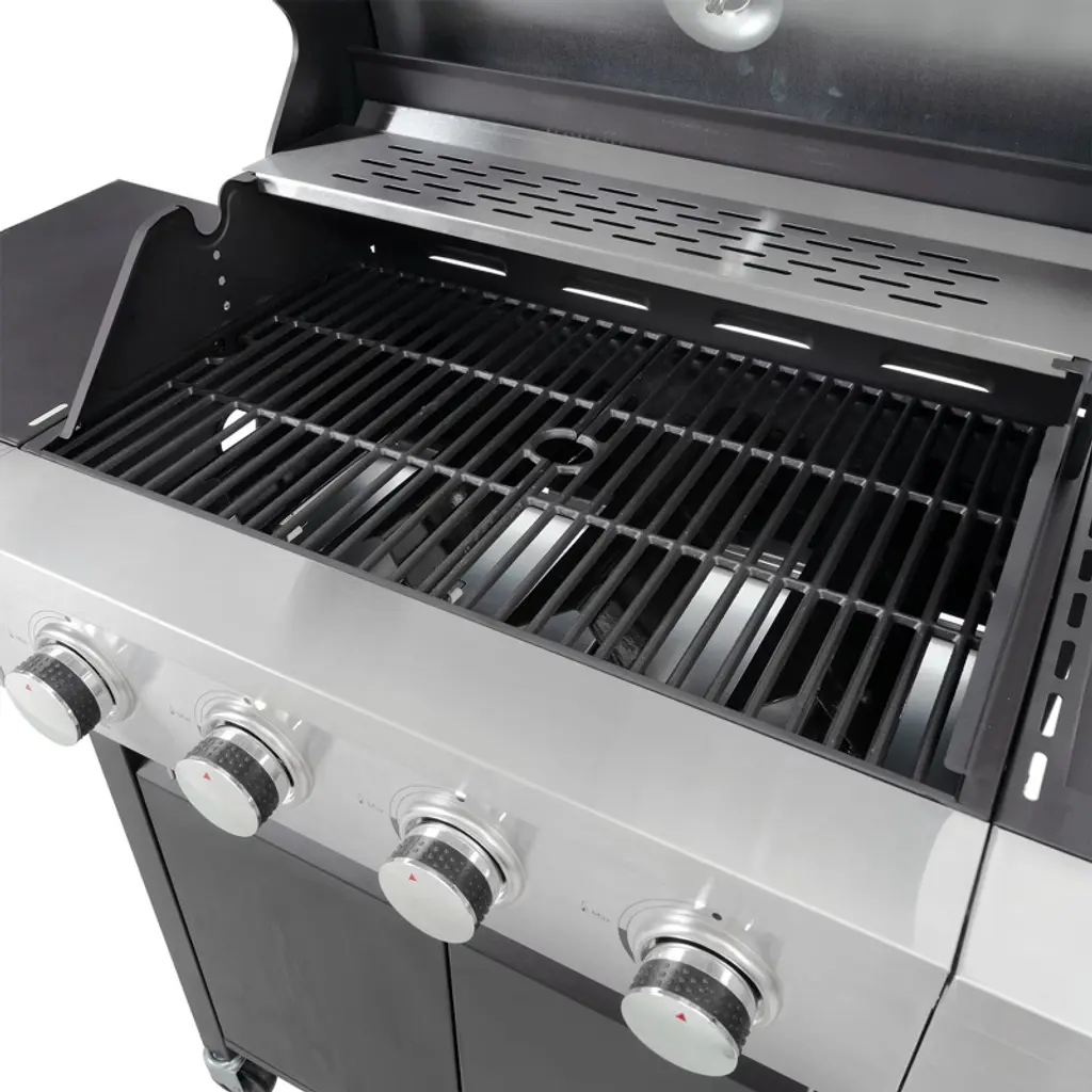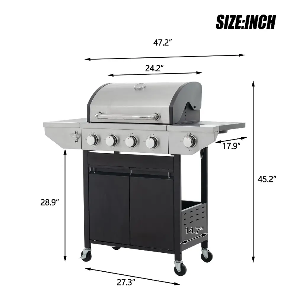Cook like a pro with this powerful 4-burner propane grill delivering a total of 46,500 BTUs, including a dedicated side burner perfect for preparing side dishes. Each burner ignites independently, allowing precise control over cooking temperatures to suit a variety of ingredients. The grill features durable stainless steel construction with 0.8mm thick 430-grade steel, a black powder-coated cabinet, and a galvanized lining for long-lasting performance. Equipped with a built-in round thermometer on the lid and a stainless steel control panel, this grill ensures easy monitoring and operation. Cooking grates made of cast iron are built to resist rust and cracking while flame tamers promote even heat distribution across the entire surface. Four wheels—two directional and two locking—offer smooth mobility and secure placement. Sized at 47.2" x 17.9" x 45.2", it’s the ideal centerpiece for any patio or garden barbecue.