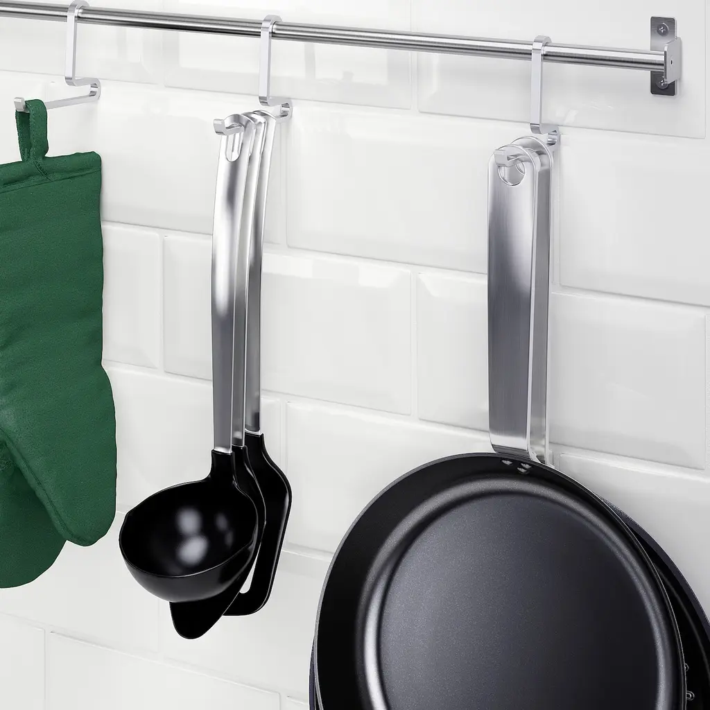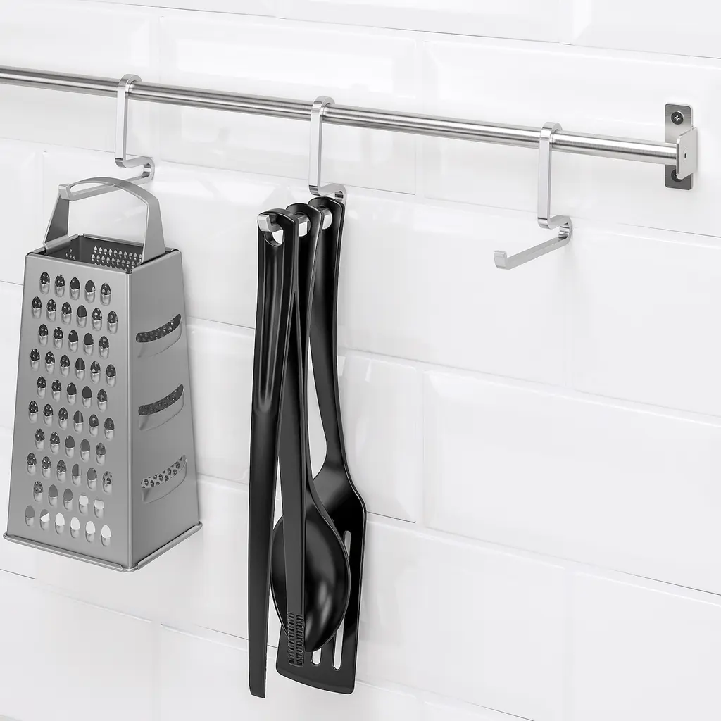 KUNGSFORS Hook - stainless steel. The clean shape means that you can hang several kitchen utensils on the same hook, so you can store them more efficiently and get more countertop space. Use the hooks to store your kitchenware on the wall and fit more into your cabinets and drawers.