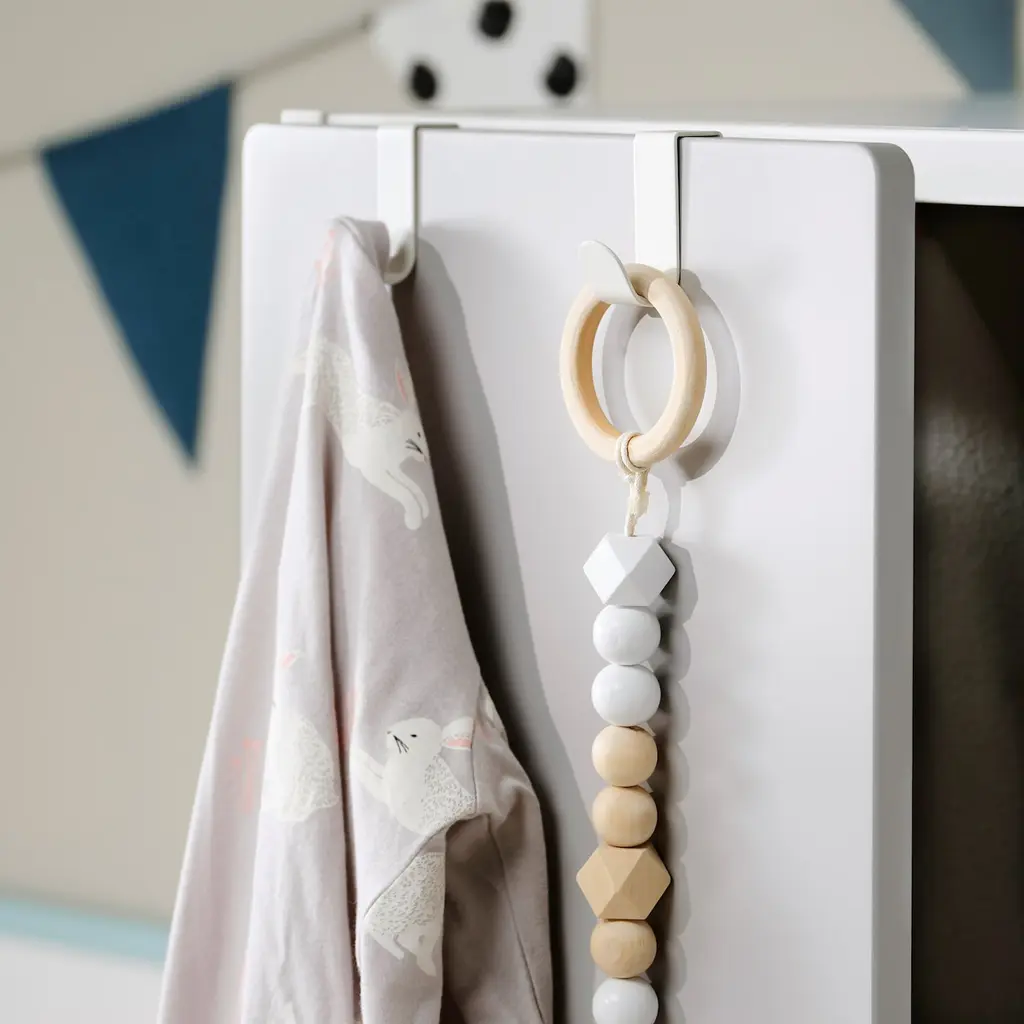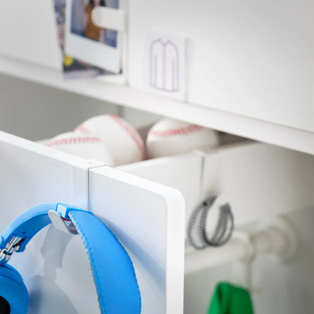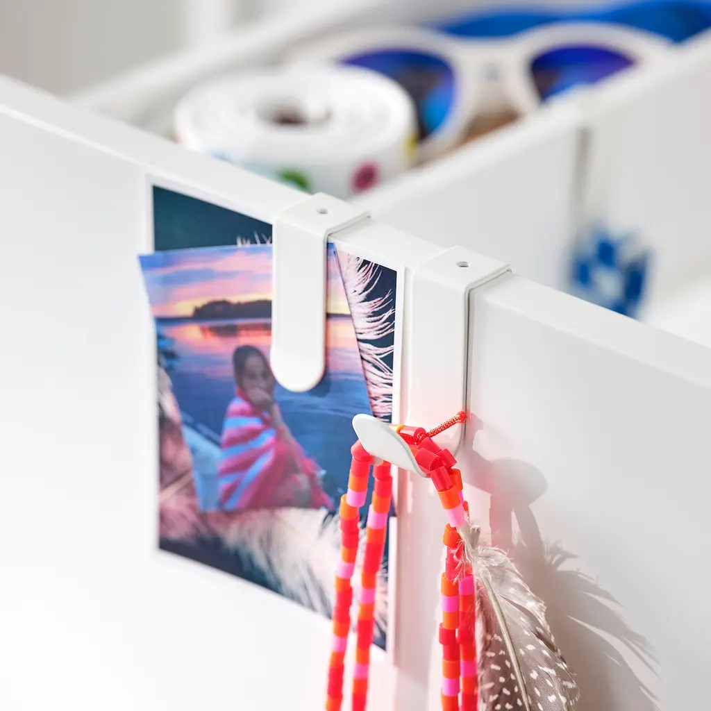 LÄTTHET Hook and clip. A smart solution with a hook for clothes or bags and a clip for pictures and drawings that makes the room feel more personal. Use every surface – this hook and clamp can be used on the outside and inside of SMÅSTAD doors, pull-out storage and drawer fronts.