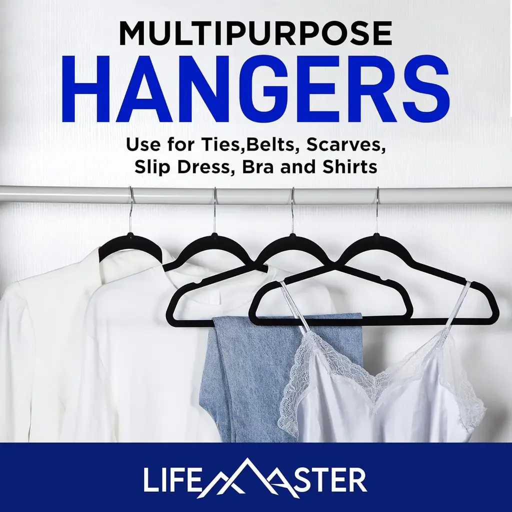 Lifemaster Velvet Clothes Hangers – With 360 Degree Swivel Hook And Non-Slip Shoulder Notch, Holds Up To 10 Lbs, Black - Pack Of 10