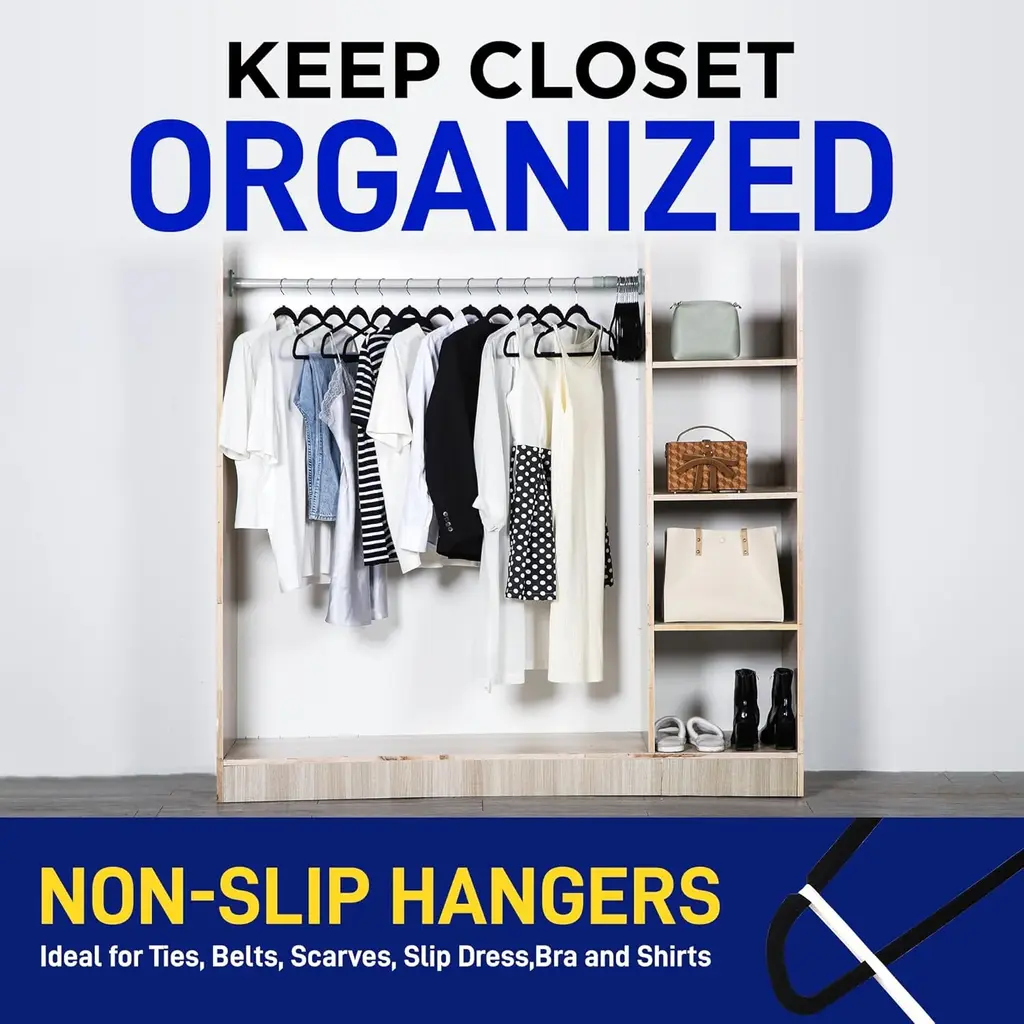 Upgrade your wardrobe with Lifemaster Velvet Clothes Hangers—a perfect blend of style, durability, and functionality for your wardrobe. Crafted with lightweight yet reinforced recycled ABS, these hangers are designed to securely support everything from delicate dresses to heavy coats. With their 360-degree swivel hook, accessing your clothes from any angle is effortless, making wardrobe organization smooth and hassle-free. The hangers feature smart shoulder notches that ensure even items with thin straps stay in place, providing a versatile solution for hanging dresses, bras, and skirts. The high-quality black color velvet finish not only adds an elegant touch but also helps maintain the shape of your clothes, preventing wrinkles and keeping them looking fresh. Available in a convenient, these hangers are ideal for upgrading your closet space. Measuring 17’’ x 0.24’’ x 9.06’’, they offer the perfect size for a variety of garments, making them an essential addition to any wardrobe. Keep your clothes organized and in top condition with Lifemaster Velvet Clothes Hangers.