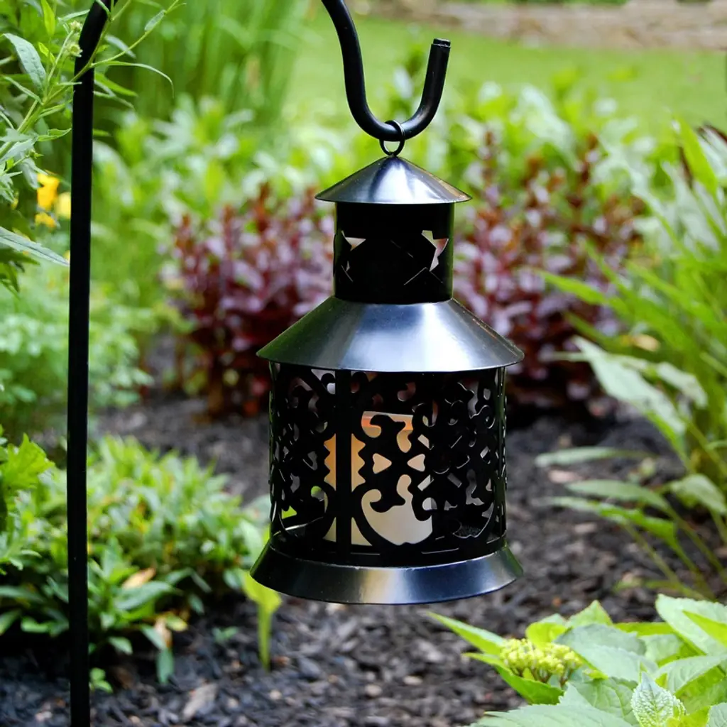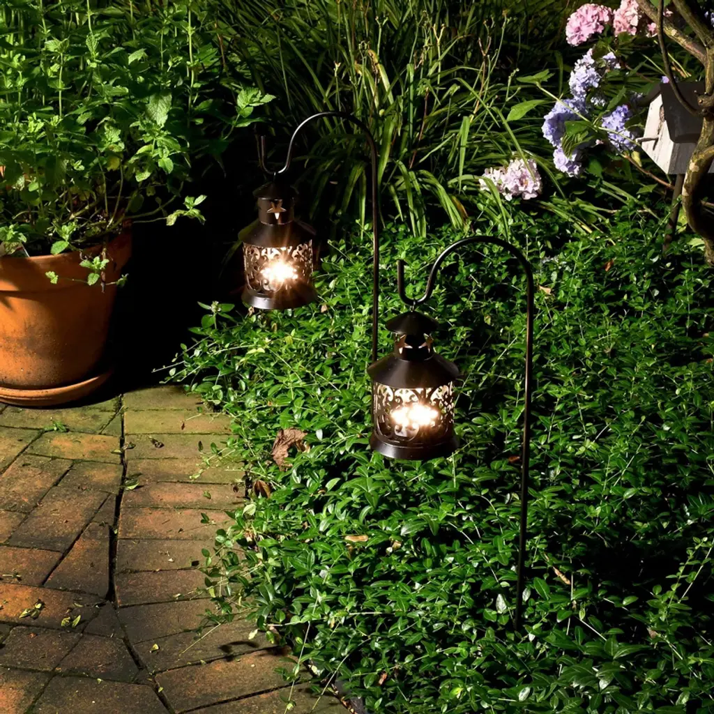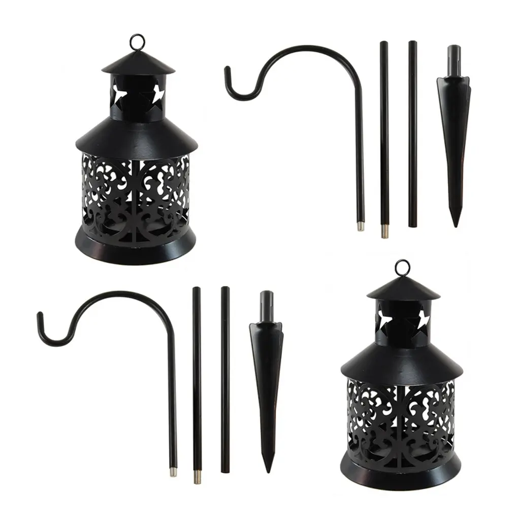 This set of two enchanting metal lanterns hung from shepherd’s hooks adds style and dimension to your outdoor décor. The lanterns have a detailed star and swirl cut out design that allows the light source to shine through. The shepherd’s hooks come in four pieces for compact storage and are very easy to assemble. The lanterns can be used without the shepherd’s hooks as tabletop lanterns. Use with a candle or LED light (not included).