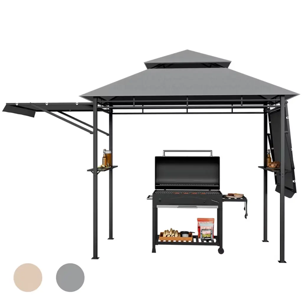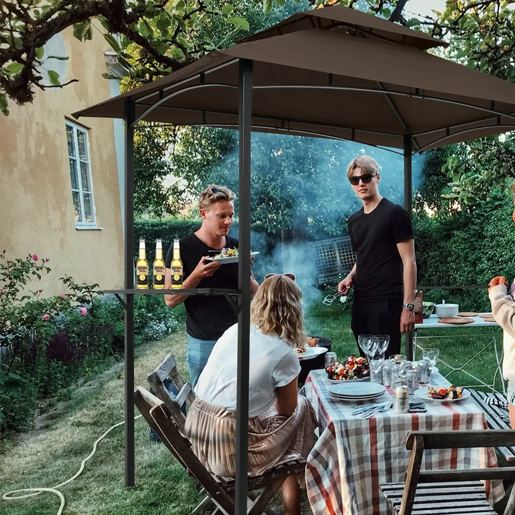 This grill gazebo designed for all-season use, the powder coated metal frame effortlessly withstands rusting, erosion and untimely wear, while the canopy top helps to block out UV rays and keeps you comfortable even in the summer heat. Completed with a double-tiered top for smoke ventilation and wind resistance. This grill gazebo is suitable for your barbecue,outdoor cooking and other party,expand your patio or courtyard space to meet your every need.