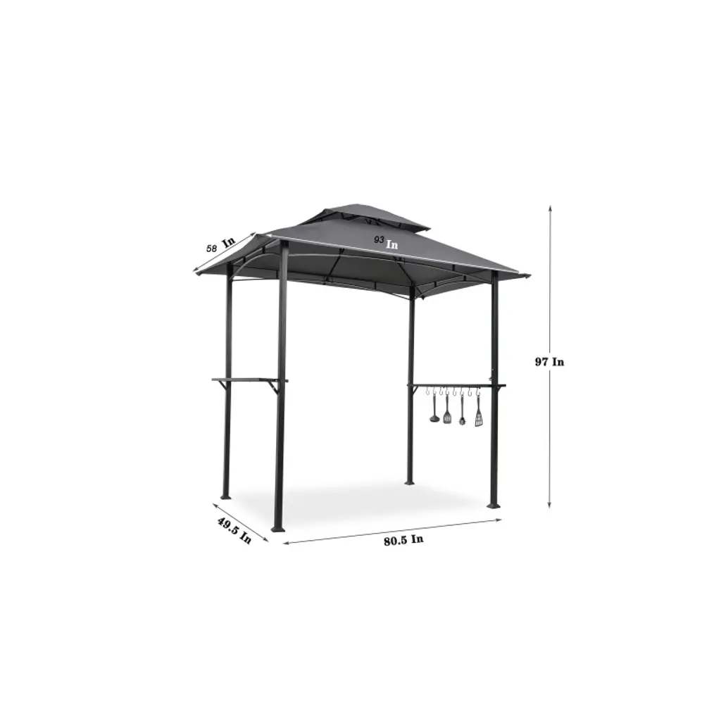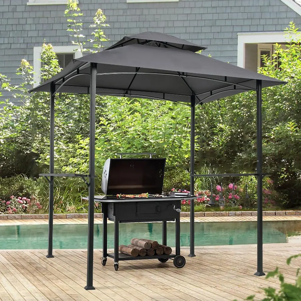 This grill gazebo designed for all-season use, the powder coated metal frame effortlessly withstands rusting, erosion and untimely wear, while the canopy top helps to block out UV rays and keeps you comfortable even in the summer heat. Completed with a double-tiered top for smoke ventilation and wind resistance. This grill gazebo is suitable for your barbecue,outdoor cooking and other party,expand your patio or courtyard space to meet your every need.