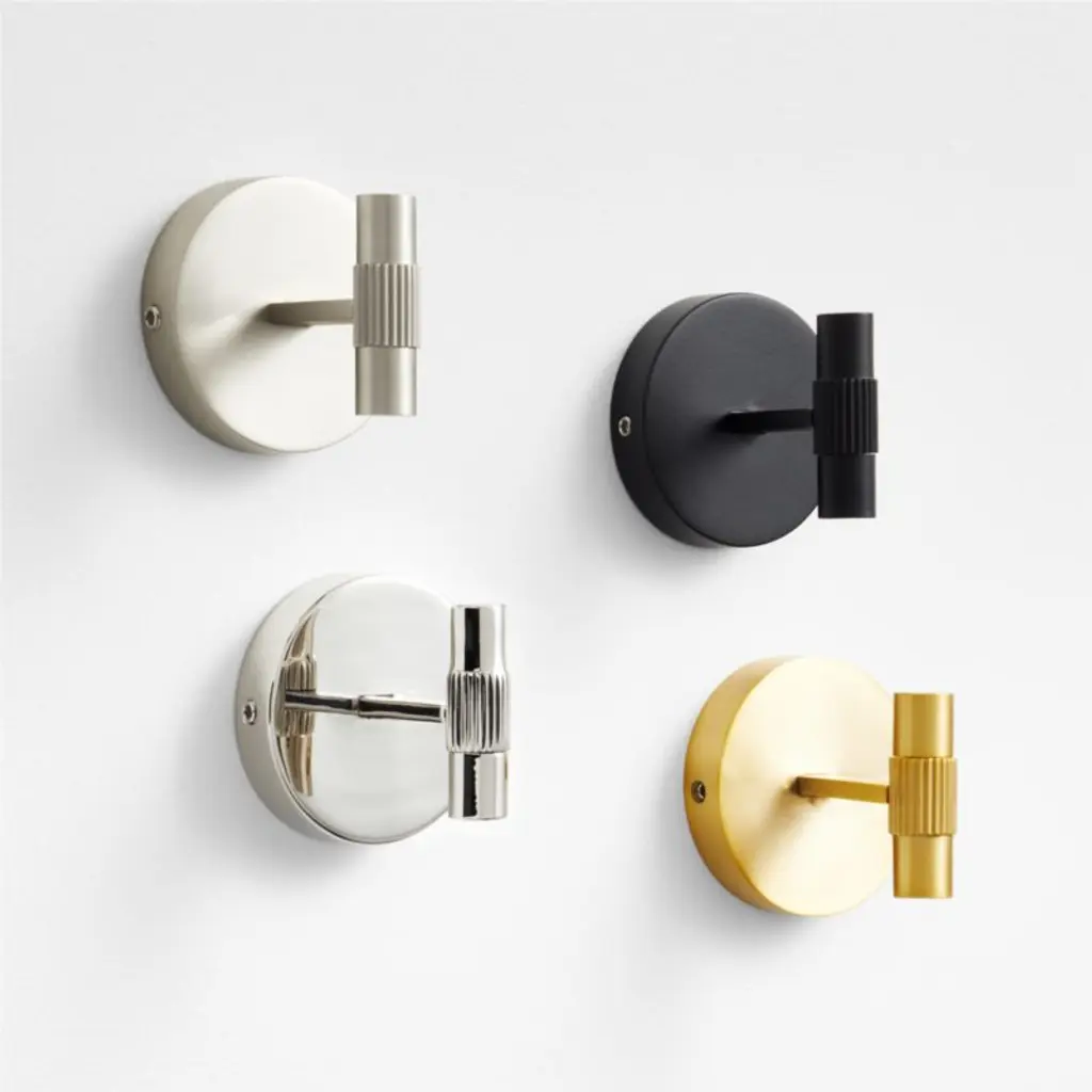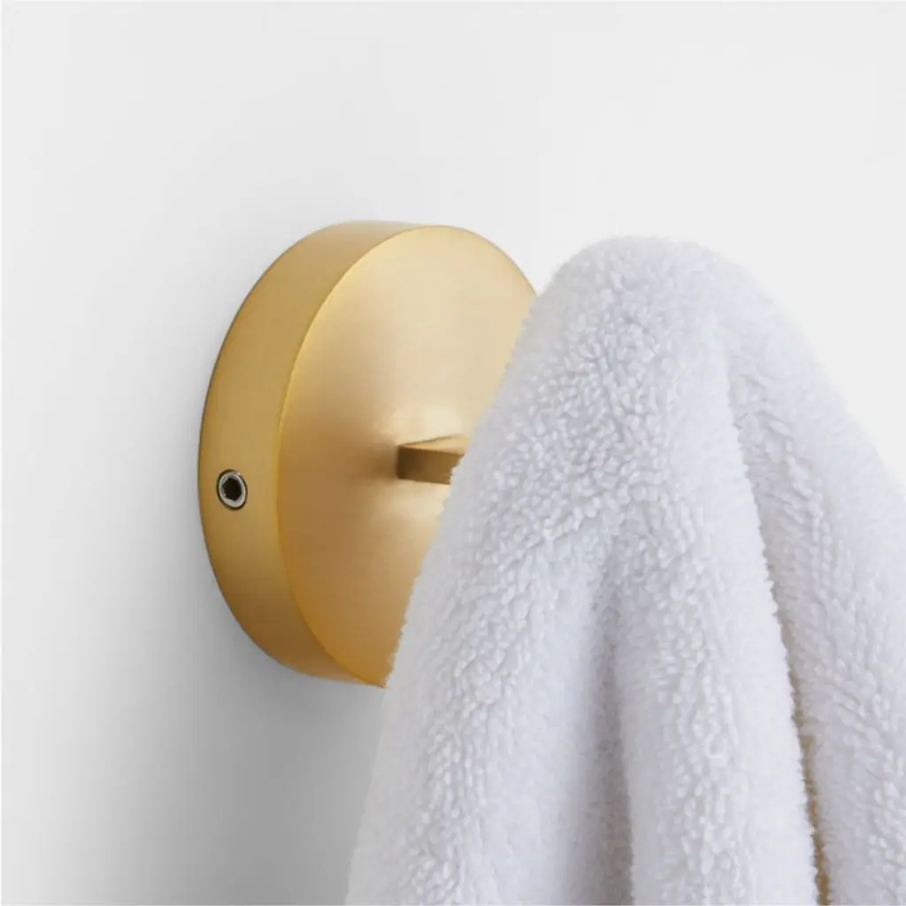 Sometimes it's the small things that pull a room together. That's why we've designed a hardware collection with modern silhouettes, clean lines and a touch of tradition to give your bathroom that perfect finishing touch. Made of brushed brass, the towel hook lends industrial chic to a minimalist design. Anchored by an oversized round mount, the hook comprises a flat bar ending in a vertical cylinder accented with a fluted band for a touch of texture. The hook easily mounts on the wall with included hardware.