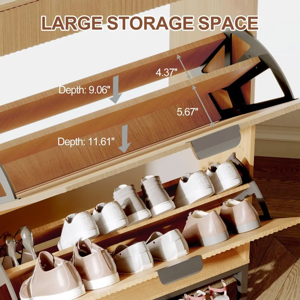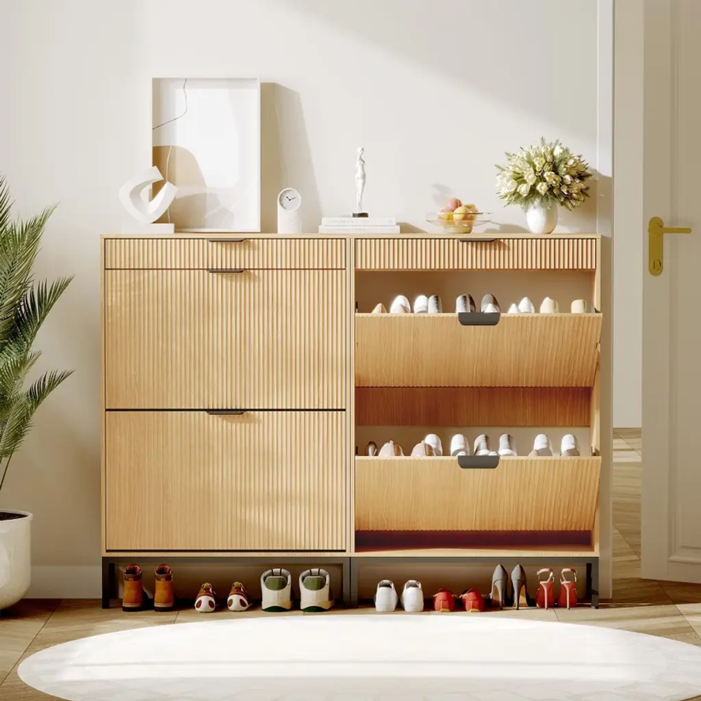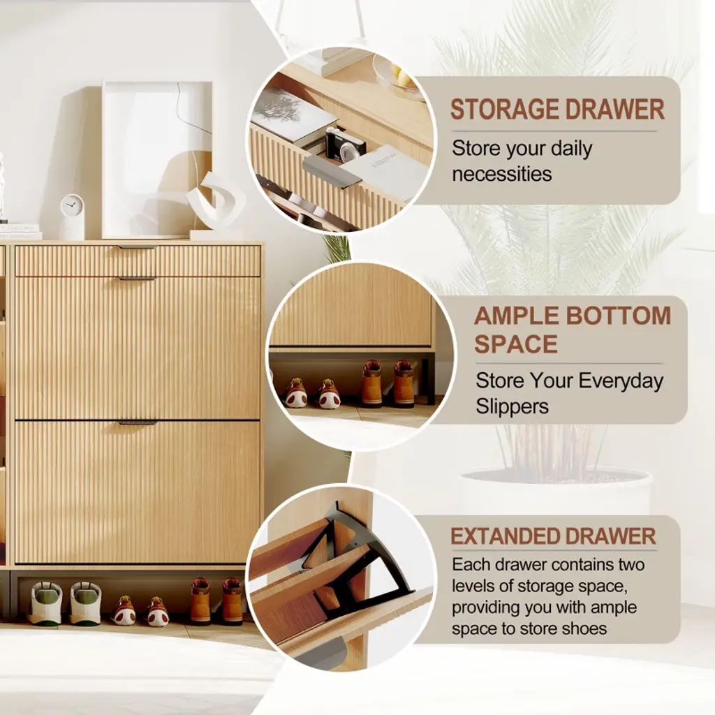 Elevate your entryway with this slim fluted shoe cabinet that combines smart storage with contemporary design. Featuring 2 flip-up drawers + 1 pull-out drawer + wall-mounted hook, this space-saving organizer provides versatile storage for 8-12 pairs of shoes while occupying minimal floor space. The wooden fluted front adds elegant texture, while black metal legs create a modern floating effect. Perfect for apartments and small homes, its compact 11.8" depth fits snugly in narrow hallways. The ventilated flip drawers allow easy access to frequently worn shoes, while the deeper pull-out drawer stores bulkier footwear. Includes all tools for quick 15-minute assembly.