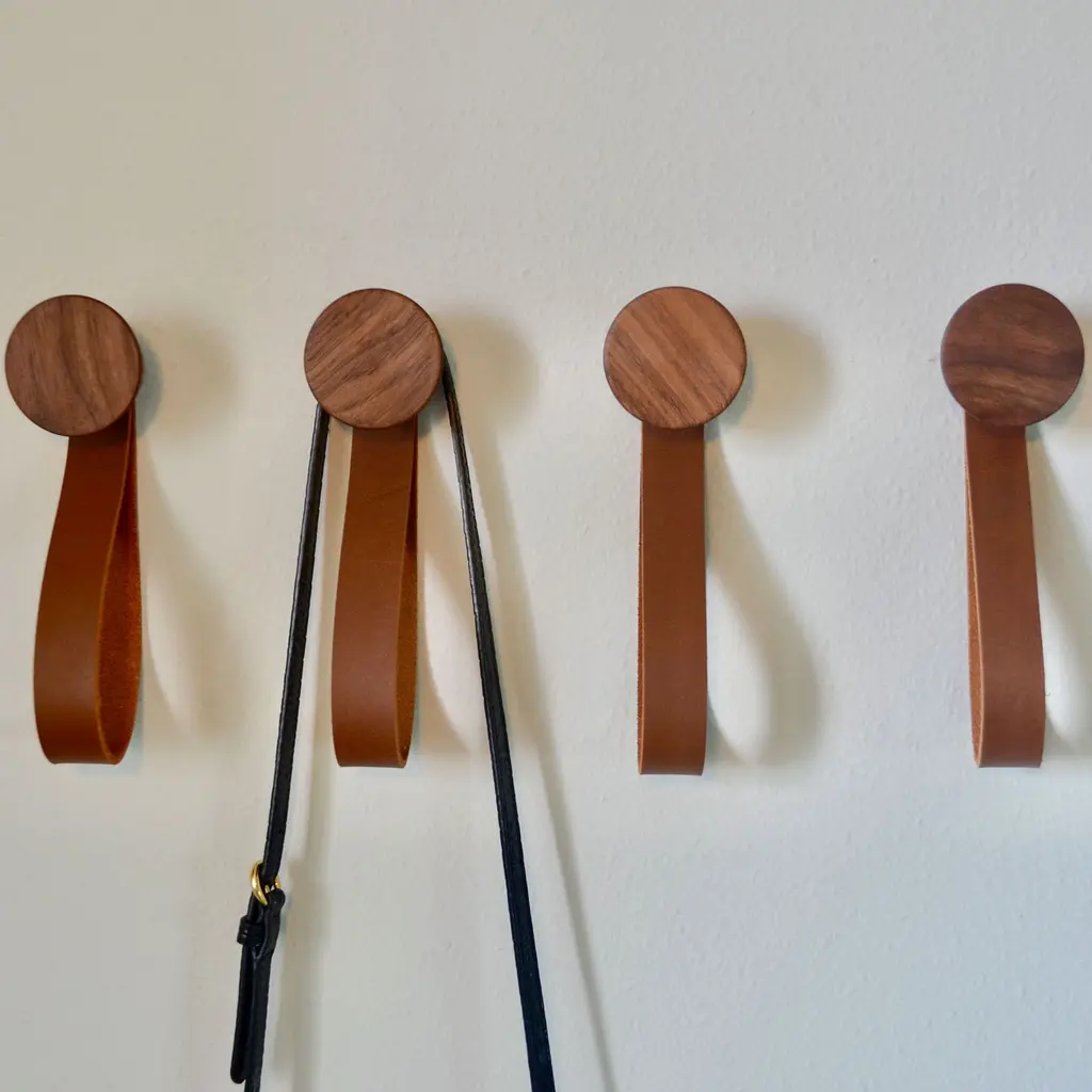 Modern solution for an entryway or bedroom. Easy to install and made to last. A handsome mix of wood & brown leather.