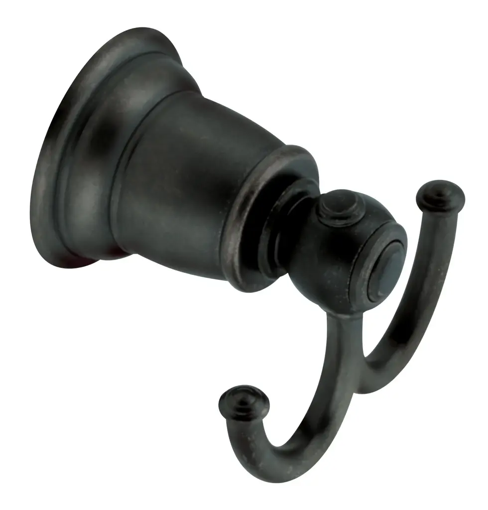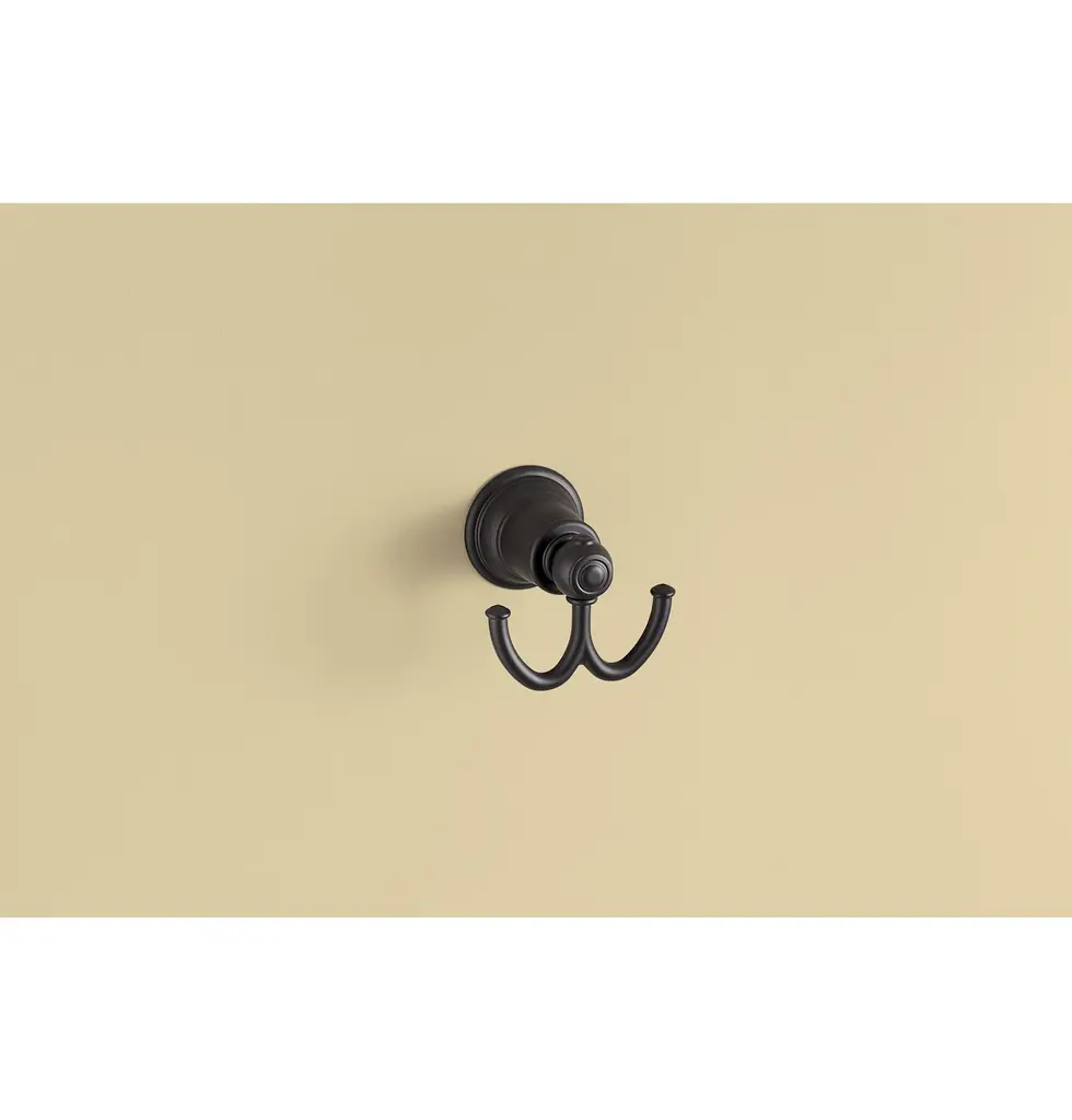 With classic Kingsley, each understated detail--like decorative hot/cold temperature inlays, simple lever handles and arched spout--comes together to create enduring, stand-out style.Features:Antique-inspired wrought iron finish gives your space a highly traditional feelDouble robe hookIncluded template and mounting hardware take the guesswork out of installationMetal mounting post for extra securityCorrosion resistantLimited lifetime warrantySpecifications:Collection: KingsleyFinish: Wrought IronLength (in.): 3.8Width (in.): 3.6Height (in.): 2.7