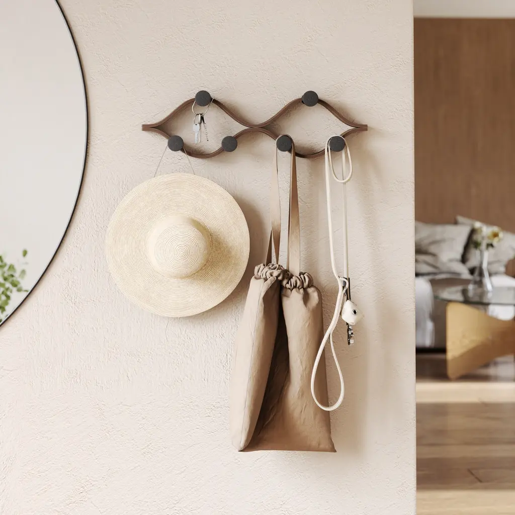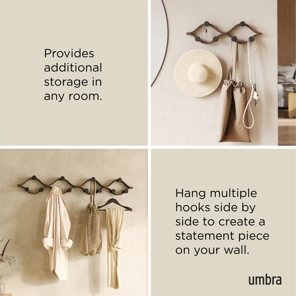 A unique bent wood curvature offers a sleek, modern aesthetic that complements any décor. Maximize your space with six available hooks, giving you plenty of options for hanging hats, coats, scarves, and more. This wall hook is created from renewable wood sources, ensuring that your stylish home addition is also kind to the environment. Part of a larger collection, this piece coordinates with our best-selling Montage Shelf to create a cohesive, curated look in your home.