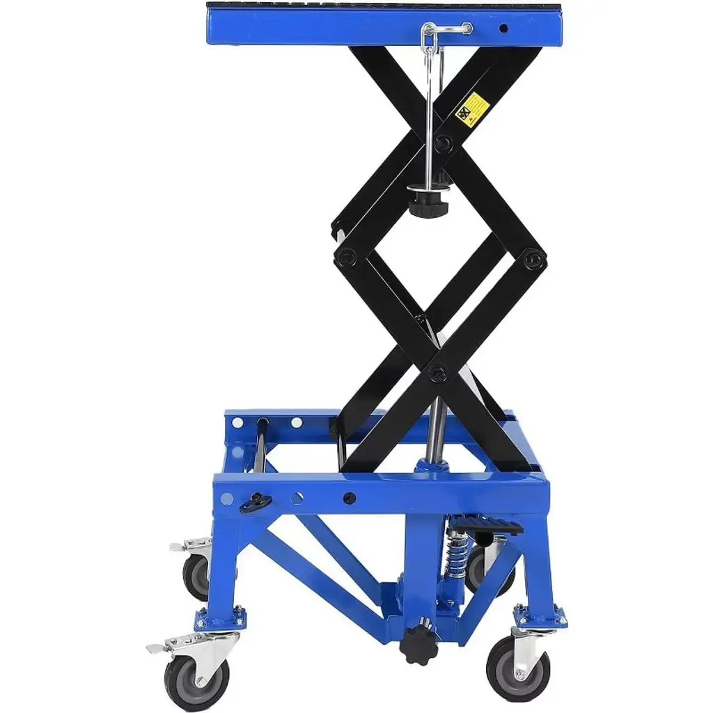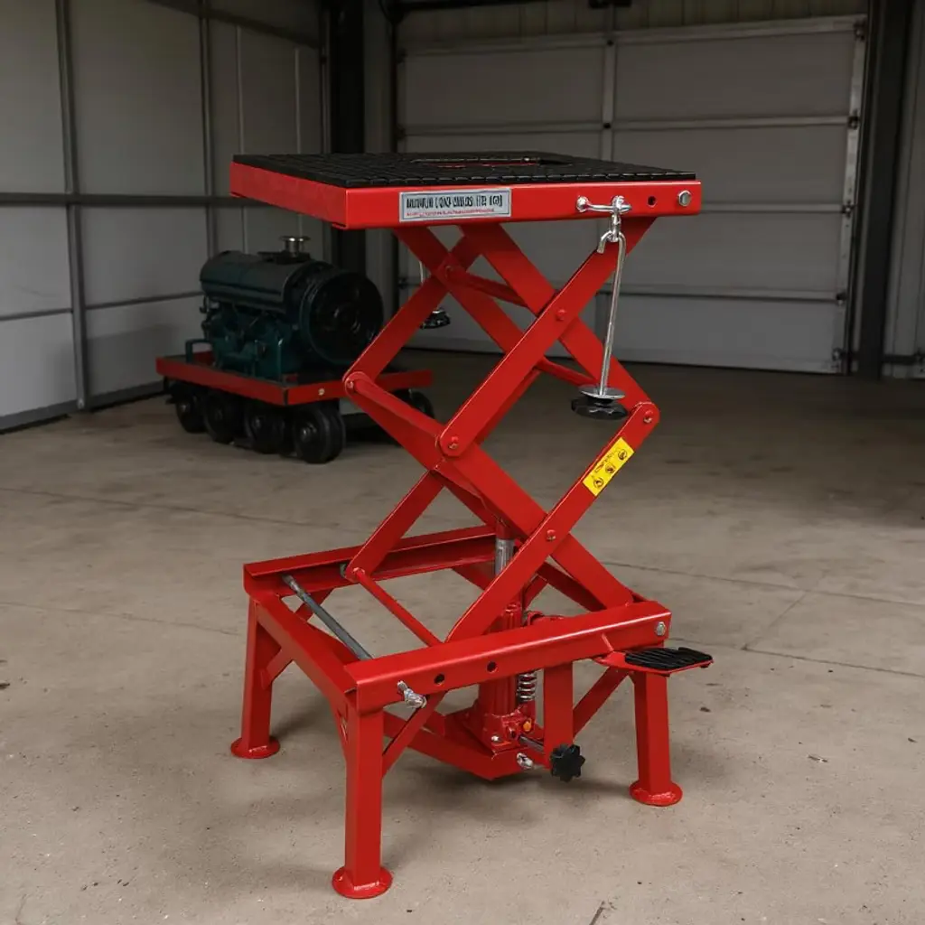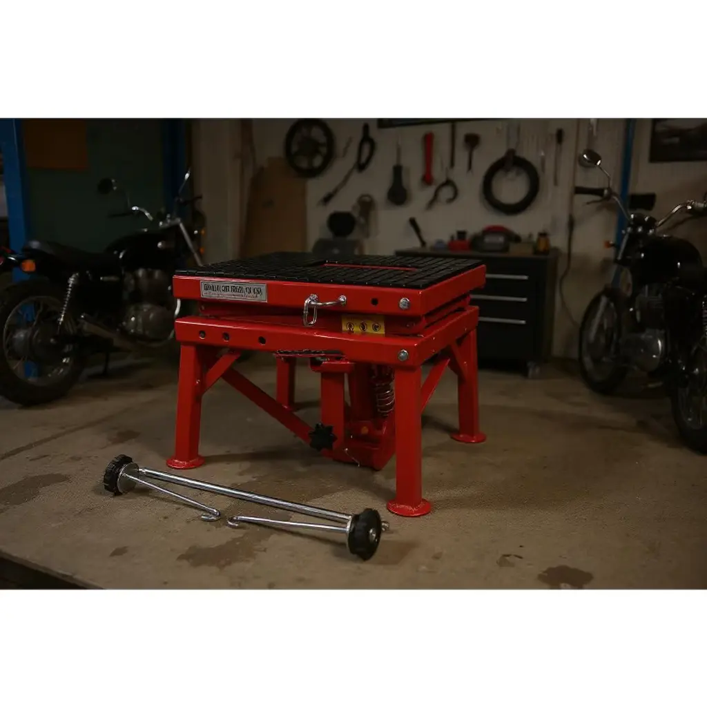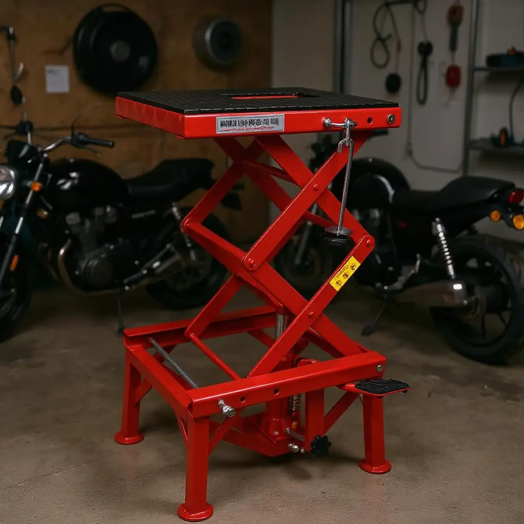 1.300 Lb Heavy-Duty Hydraulic Lift for Bikes & ATVs This motorcycle lift table is engineered to handle heavy loads, supporting up to 300 lbs¡ªperfect for lifting dirt bikes, ATVs, and standard motorcycles with ease. Its robust solid steel scissor lift design ensures stability even under maximum weight, eliminating the risk of bending or collapsing during maintenance. The foot pedal operation adds convenience: no need to strain your back or hands to lift¡ªsimply press the pedal to raise your bike, making tasks like oil changes, tire rotations, or chain adjustments safer and more effortless. Whether you¡¯re a home mechanic in a garage or a professional in a shop, it delivers reliable lifting power for all your two-wheeler or ATV needs. 2.13"-34" Adjustable Height for Optimal Maintenance Access With a wide lifting range from 13 inches to 34 inches, this scissor lift adapts to different vehicle types and maintenance tasks. The low 13-inch starting height makes it easy to roll under bikes with low ground clearance, while the 34-inch maximum height provides ample space to access the undercarriage, engine, or wheels¡ªno more hunching over or kneeling on the floor. This adjustability is especially useful for off-road motorcycles and ATVs (which often have higher ground clearance), letting you set the perfect height for precise work, whether you¡¯re inspecting components, replacing parts, or cleaning hard-to-reach areas. 3.Durable Rust-Resistant Build & Non-Slip Surface Crafted from heavy-duty solid steel, the lift table is built to withstand the wear and tear of garage/shop use¡ªincluding exposure to oil, grease, and moisture. Its red powder-coated finish adds a protective layer that resists rust and corrosion, ensuring long-lasting performance and easy cleanup (just wipe away spills with a rag). The top deck features a thick rubber pad with textured stripes: the texture prevents your bike from slipping during lifting or maintenance, while the rubber material protects the bike¡¯s frame and body from scratches, dents, or paint damage¡ªpreserving the condition of your vehicle. 4.Smooth Mobility with 4 Casters (2 Lockable) Equipped with four casters (2 swivel, 2 locking), the lift table offers exceptional mobility to navigate your workspace. The swivel casters let you easily roll the lift under your bike, even in tight garage corners or crowded shop floors, while the locking casters secure the table firmly in place once positioned. This stability is critical during maintenance¡ªyou won¡¯t have to worry about the lift shifting or sliding while you¡¯re working on your bike. When the job is done, simply unlock the casters to move the lift out of the way for storage, making it a space-saving solution for small garages. 5.Safety-Centric Design with Pin Lock & J-Hooks Safety is prioritized with two key features: a safety pin and included J-hooks. The safety pin locks the lift securely at your desired height, preventing accidental lowering even if the hydraulic system fails¡ªkeeping you and your bike protected. The J-hooks attach to the lift table¡¯s frame and wrap around your bike¡¯s handlebars or frame, adding extra stability by reducing shaking or tipping during maintenance. Together, these features eliminate common risks associated with bike lifting, letting you work with confidence, whether you¡¯re a beginner or an experienced mechanic.