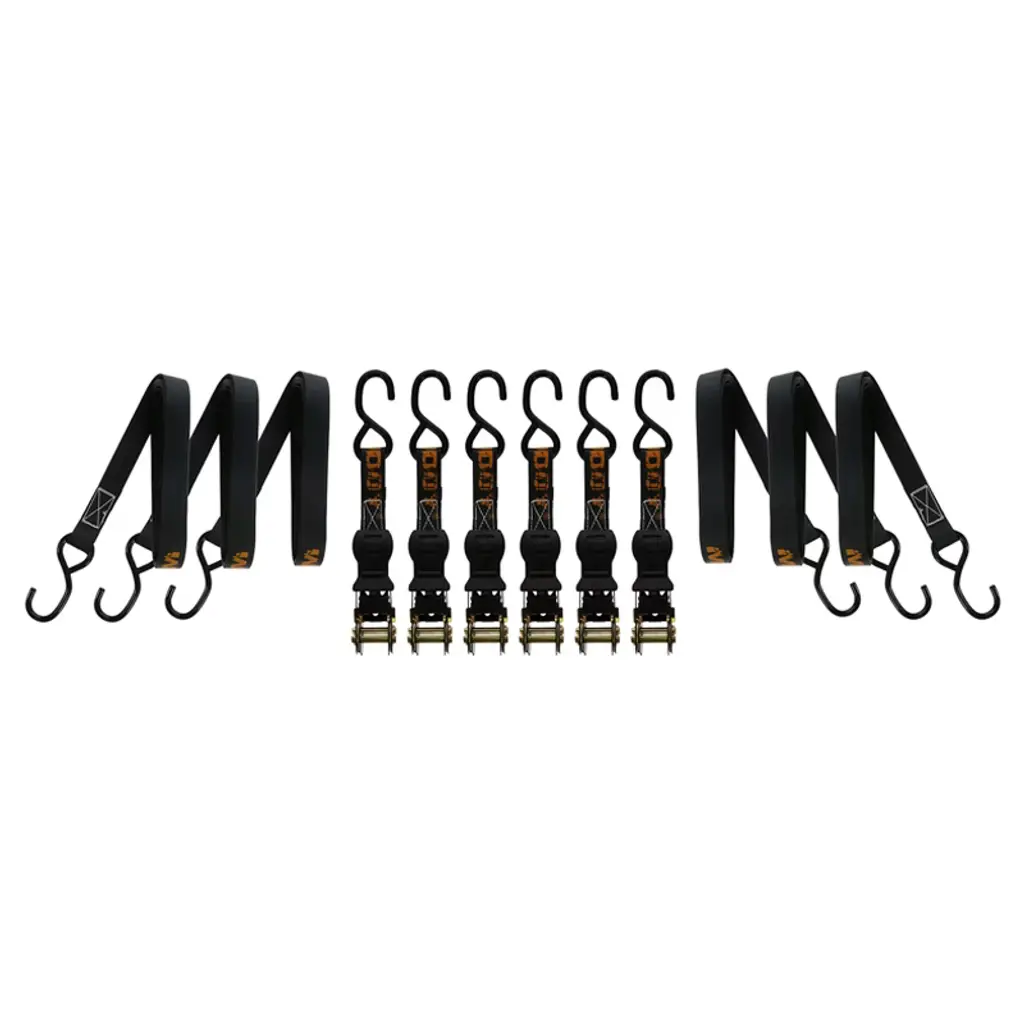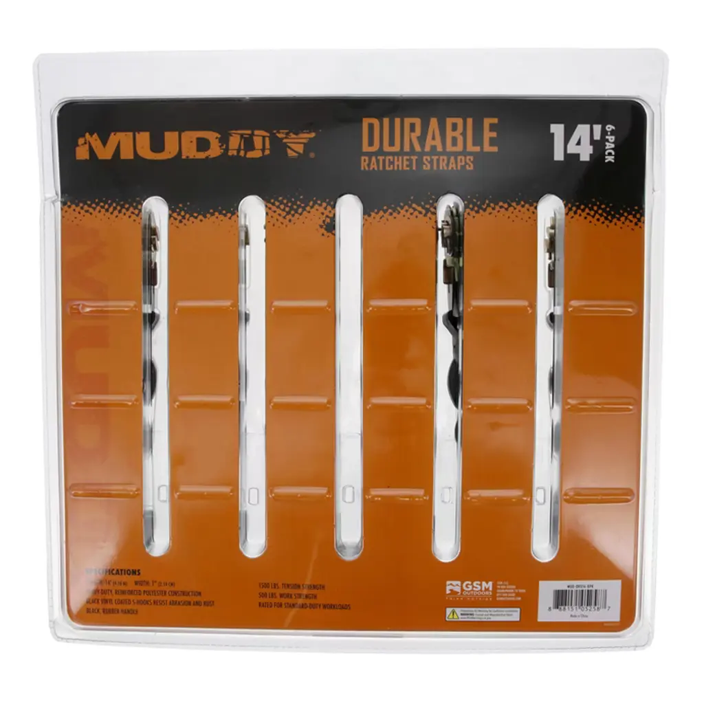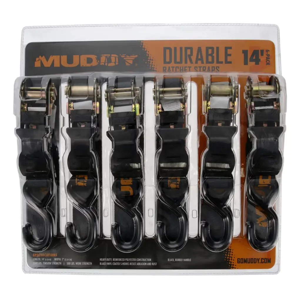 Keep your cargo secure with this 6 pack of durable Ratchet Straps from Muddy. With 1,500-lb. breaking strength, these 1 in. x 14-ft. long straps provide you with the confidence you need so you won’t have to worry about your cargo going anywhere. Coated hooks help secure the cargo in place. Get peace of mind. Get Muddy Ratchet Straps.