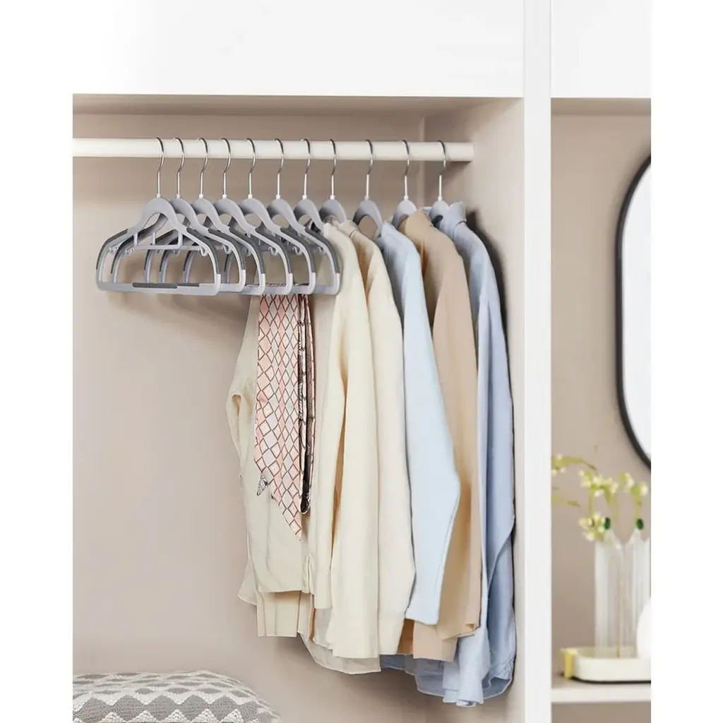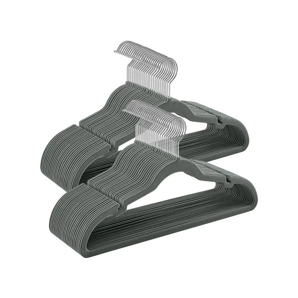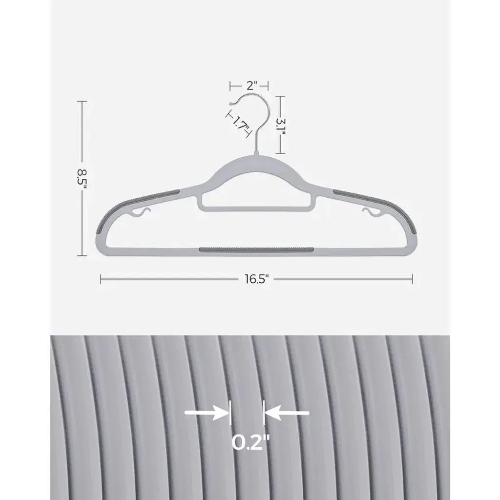 Specifications:Set of 50: Set of 30: Set of 60:Description: This set of 50 or 30 or 60 sleek hangers offers a practical and space-saving solution for organizing your closet. Measuring 16.5 inches long, 0.2 inches wide, and 8.5 inches high, each hanger is equipped with non-slip rubber strips on the shoulders and bottom bars, securely holding delicate items like silk shirts without slipping. The curved design prevents unwanted marks on clothing shoulders, preserving your garments in excellent condition. Featuring 360-degree swivel metal hooks, these hangers make it easy to hang and retrieve clothes. With a slim 0.2-inch profile, they maximize closet space while still supporting a weight of up to 11 lbs each, making them sturdy enough for coats and jackets. The versatile design includes a bottom bar for pants or scarves, a central bar for ties, and side hooks for clothing with thin shoulder straps.Key Features: