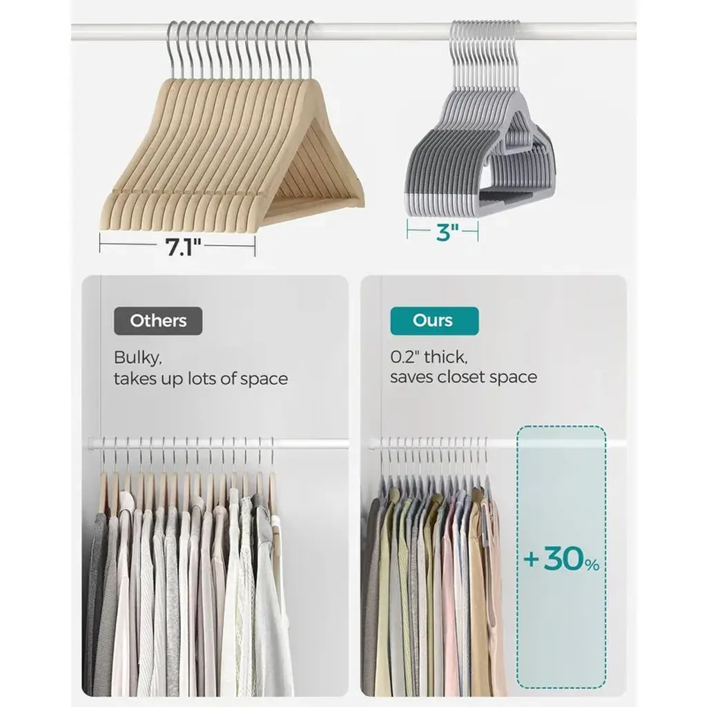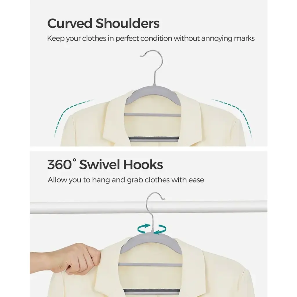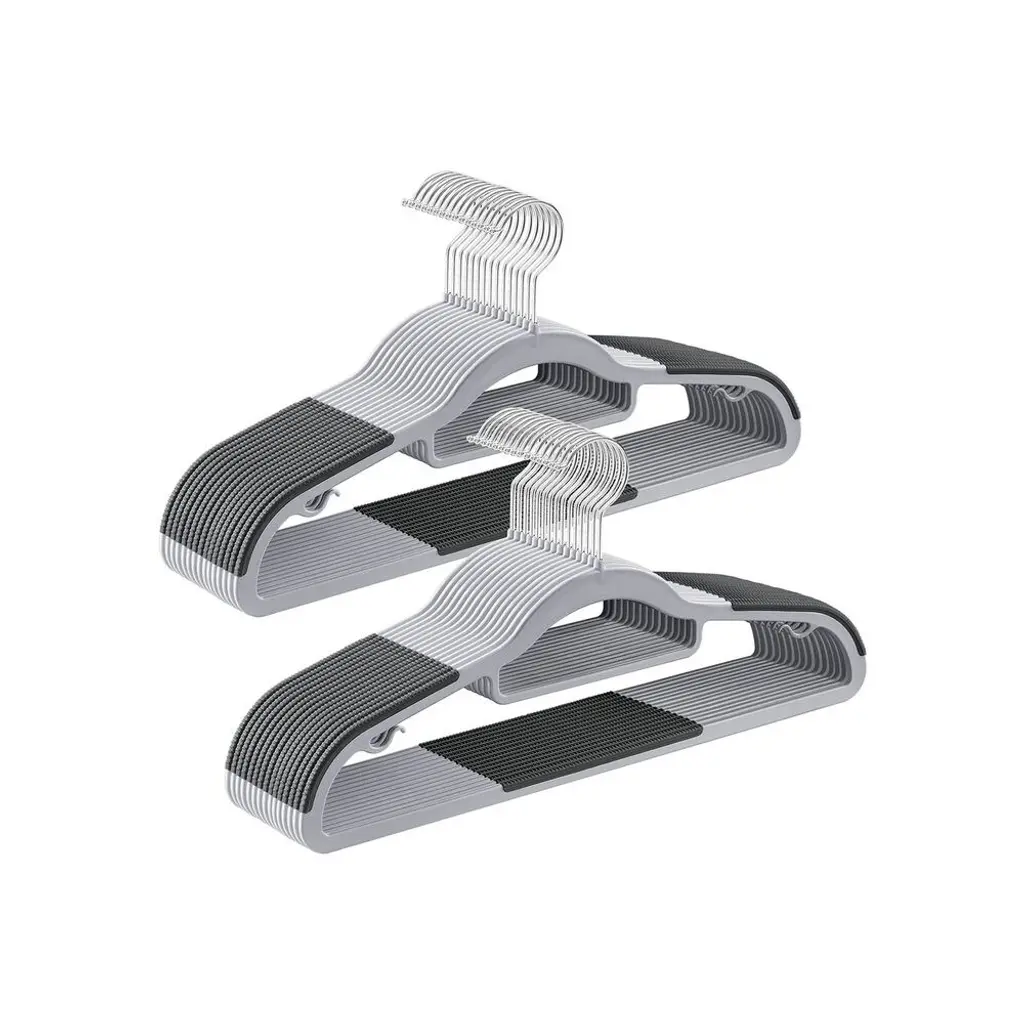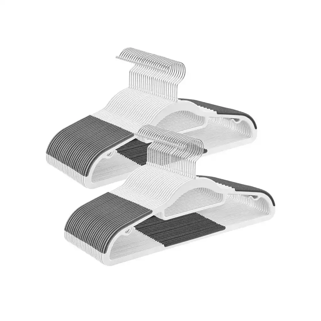 Specifications:Set of 50: Set of 30: Set of 60:Description: This set of 50 or 30 or 60 sleek hangers offers a practical and space-saving solution for organizing your closet. Measuring 16.5 inches long, 0.2 inches wide, and 8.5 inches high, each hanger is equipped with non-slip rubber strips on the shoulders and bottom bars, securely holding delicate items like silk shirts without slipping. The curved design prevents unwanted marks on clothing shoulders, preserving your garments in excellent condition. Featuring 360-degree swivel metal hooks, these hangers make it easy to hang and retrieve clothes. With a slim 0.2-inch profile, they maximize closet space while still supporting a weight of up to 11 lbs each, making them sturdy enough for coats and jackets. The versatile design includes a bottom bar for pants or scarves, a central bar for ties, and side hooks for clothing with thin shoulder straps.Key Features: