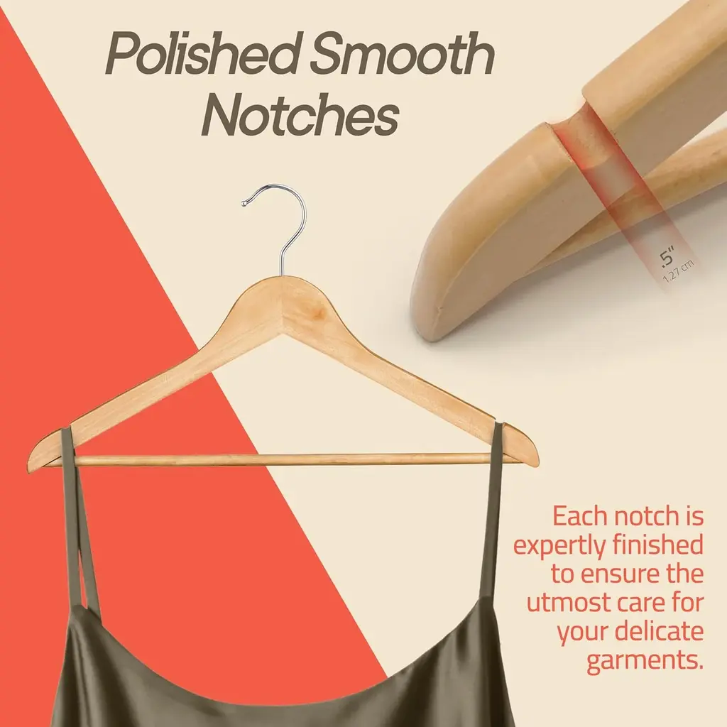 Upgrade your closet with these hangers, premium wooden hangers, designed to keep your clothes looking their best while maximizing space. Made from high-quality solid wood with a natural grain finish, these hangers combine elegance with durability, offering reliable support for everything from lightweight blouses to heavy coats and suits. The contoured shoulder design preserves the shape of your garments, preventing awkward bumps and ensuring your jackets, shirts, and dresses stay in perfect condition.For added convenience, these clothes hangers feature precisely cut notches on each side, securely holding camisoles, dresses, and other strappy clothing without slipping. The sturdy non-slip pants bar allows for effortless hanging of trousers, jeans, and skirts, keeping them wrinkle-free and neatly stored. Finished with a smooth, splinter-free coating, these hangers are gentle on delicate fabrics, preventing snags and damage.Designed for easy access, the 360° swivel chrome hook lets you hang and retrieve clothing from any angle, making organization effortless. Despite their slim 0.47-inch profile, these wooden hangers are strong and space-saving, helping you keep your closet neat and clutter-free. Whether you're organizing everyday essentials or your finest wardrobe pieces, these hangers provide the perfect blend of style, function, and durability.