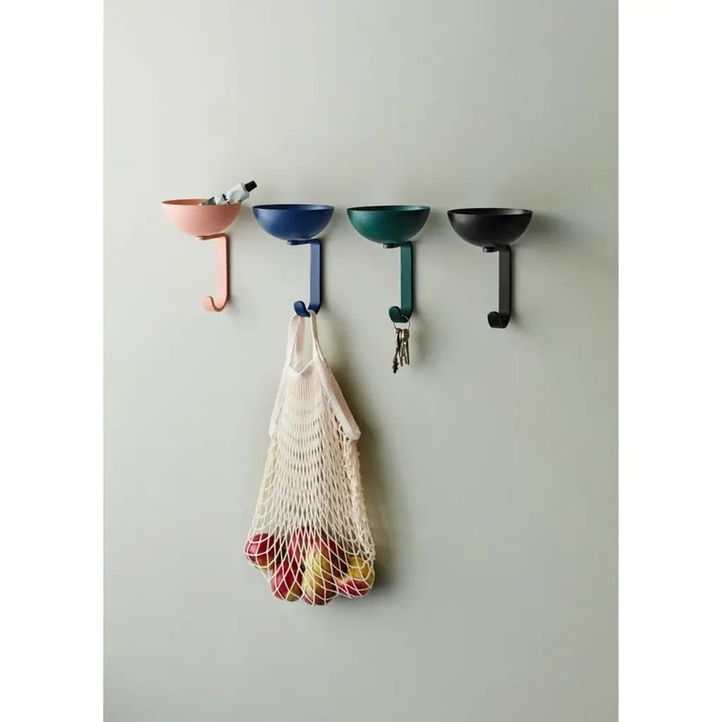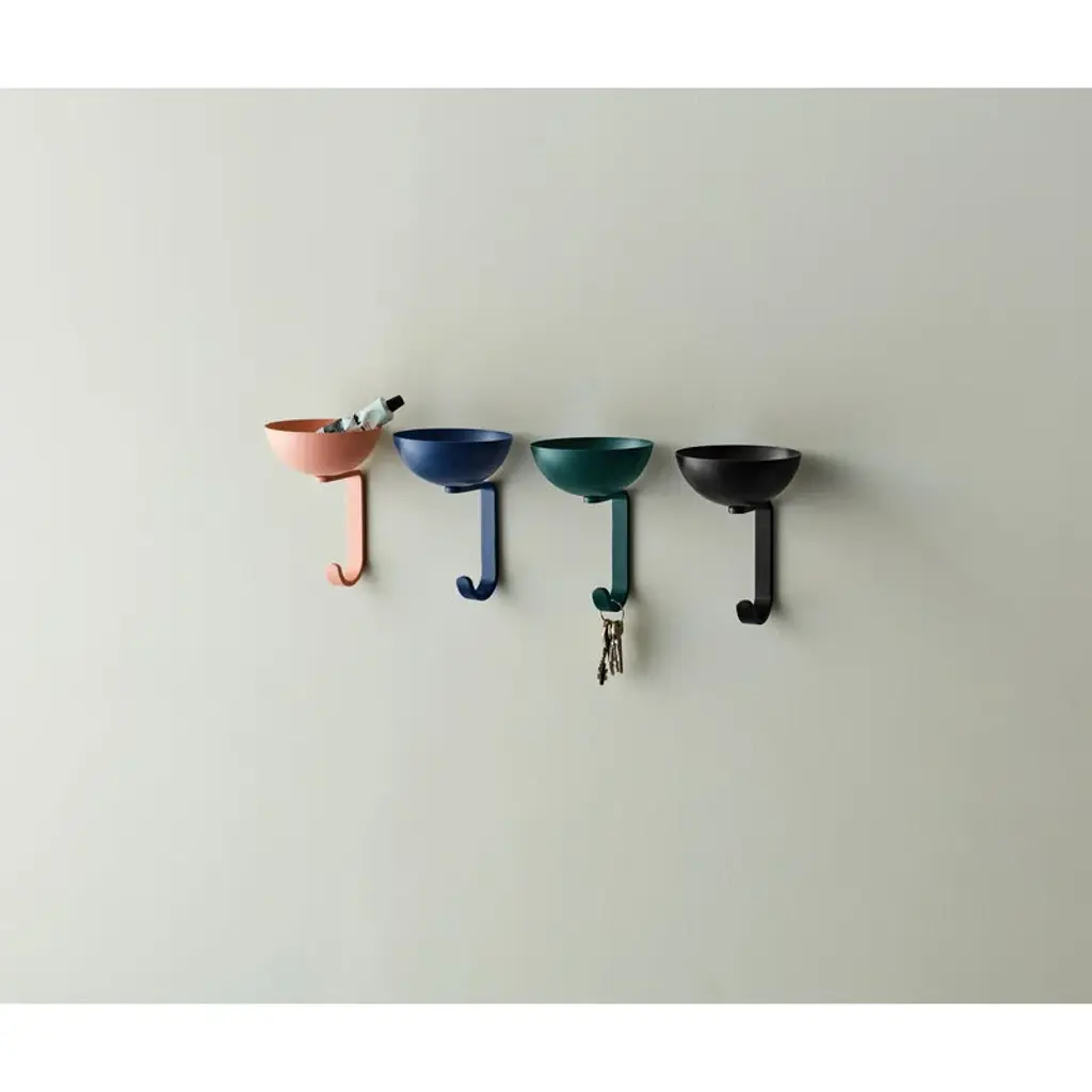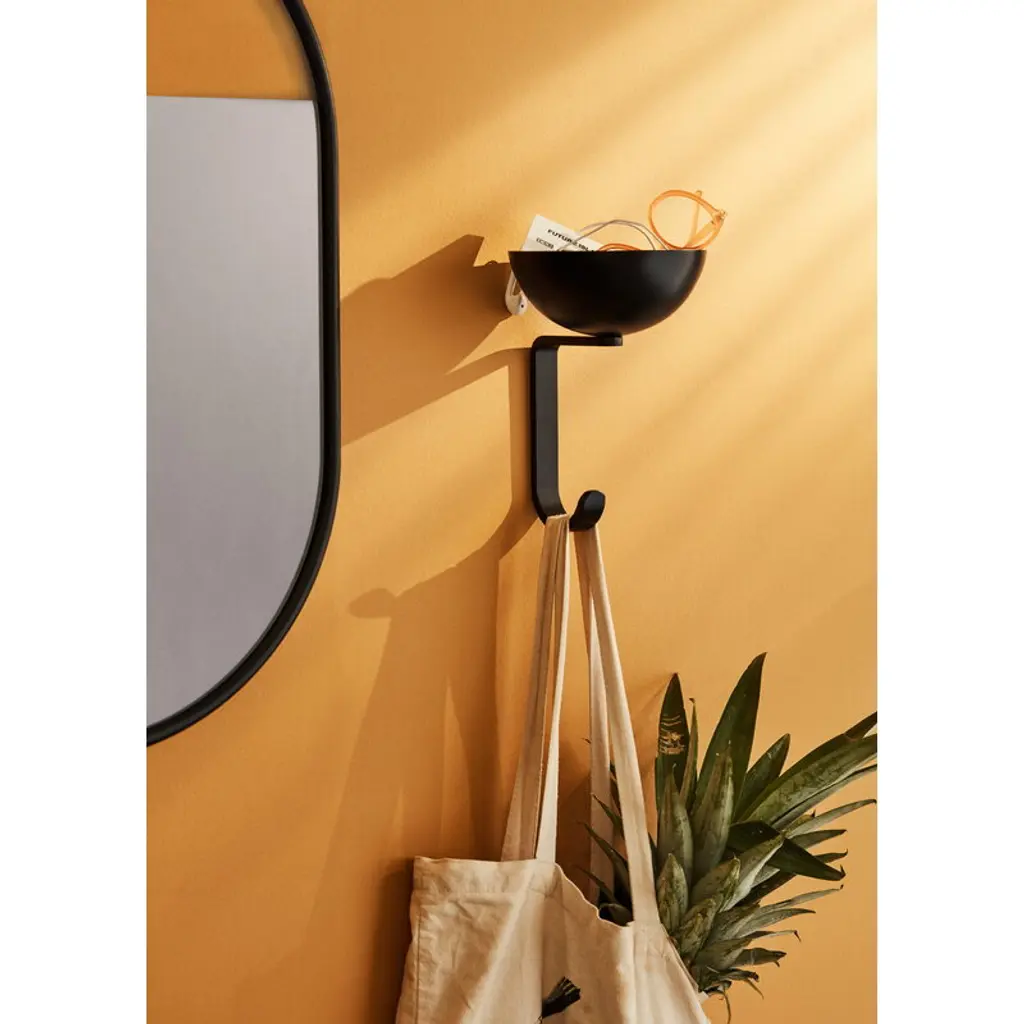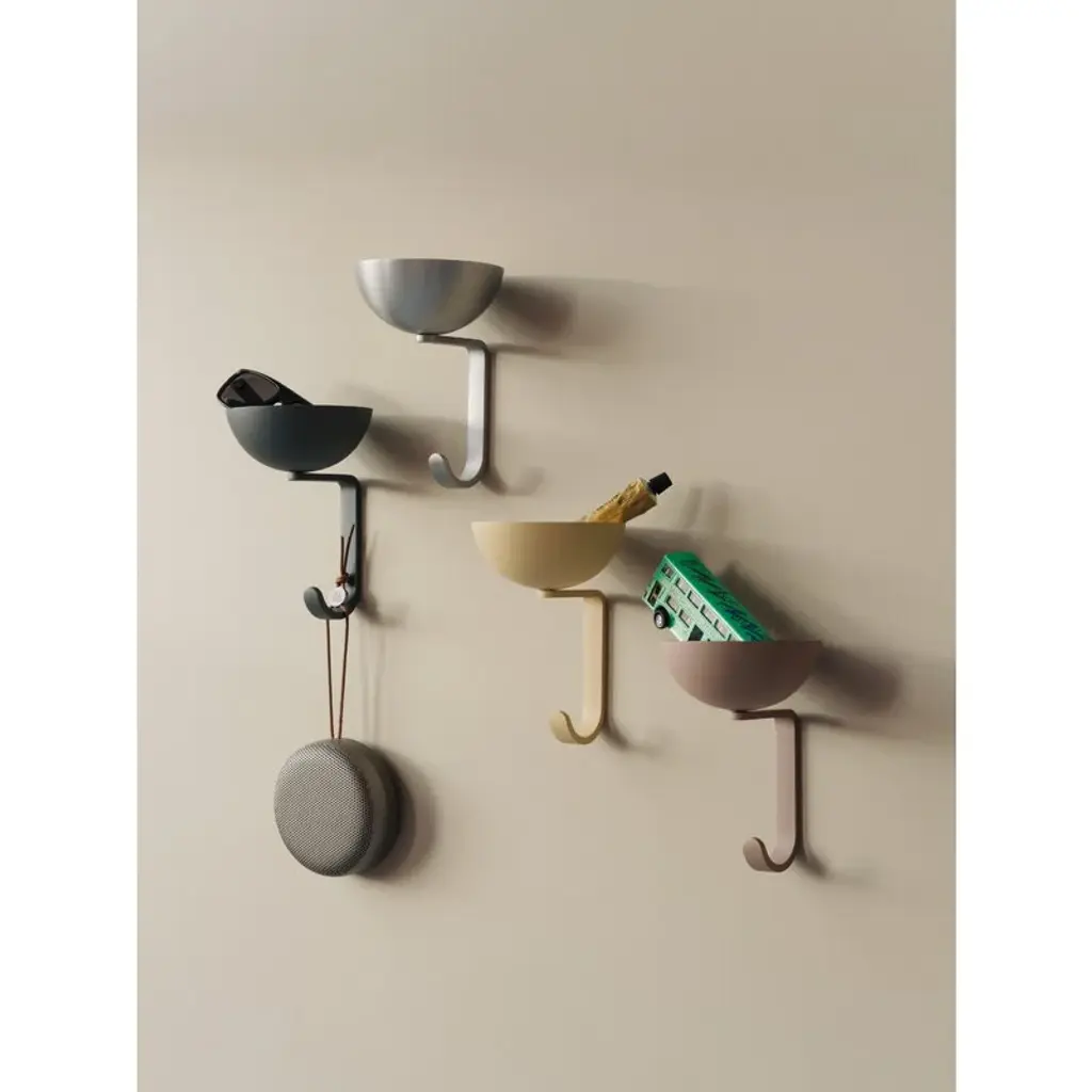 Northern's Nest wall hook is a witty combination of storage and a coat hook. Made of steel, the wall hook consists of a small bowl sized to hold keys, money, cards and other small items, and a strong hook to hang your coats, scarves, and other accessories. The inspiration for this tiny storage space comes from birds: just like birds collect small twigs for their nests, people collect little items in their pockets. The Nest wall hook provides a handy place to store these small everyday essentials.