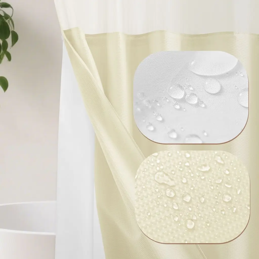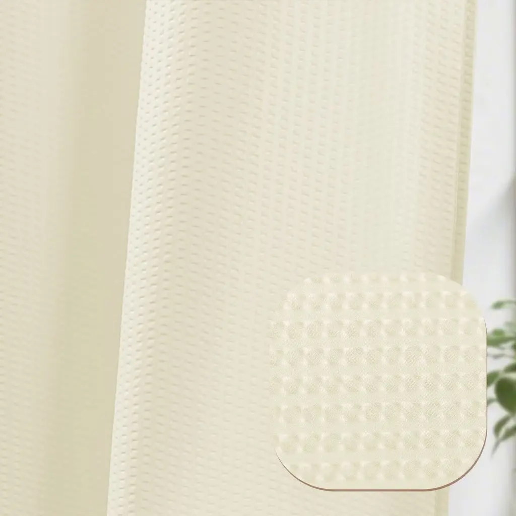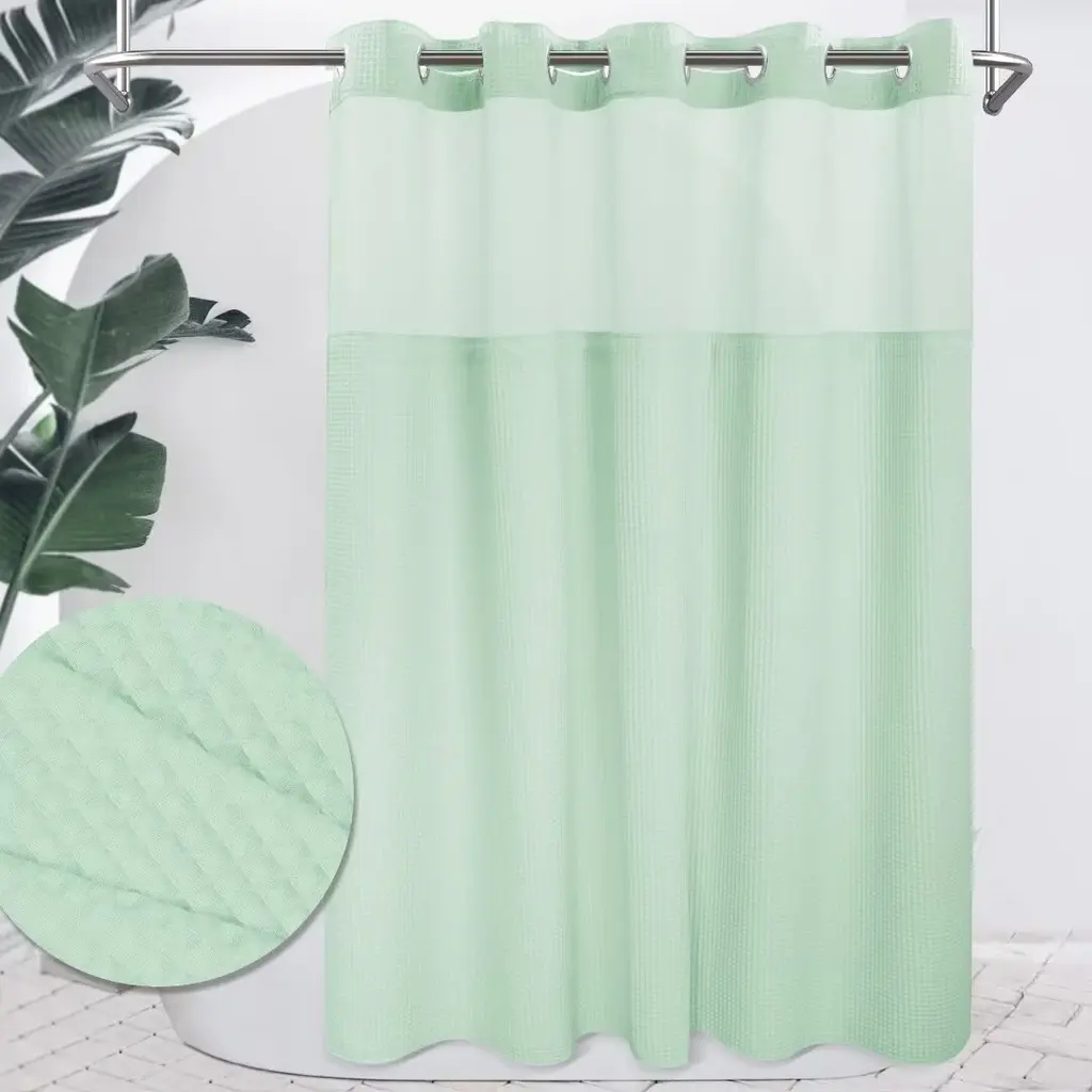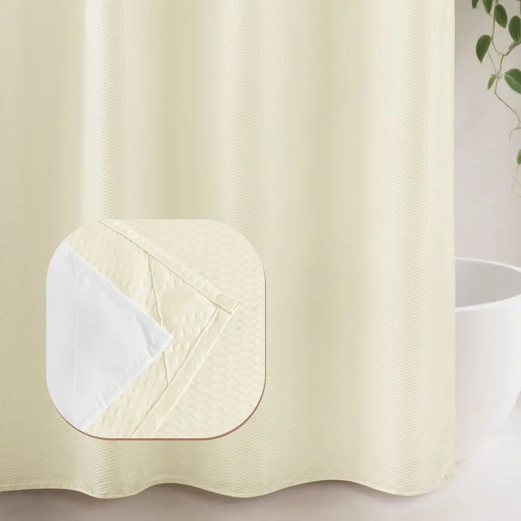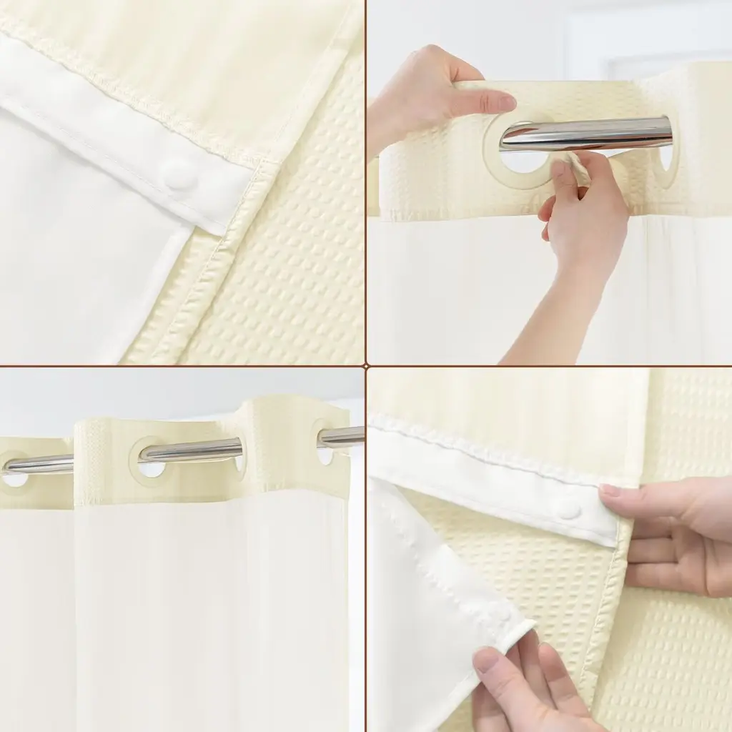 This Embossed Shower Curtain adds texture and timelessly elegance to your bathroom. Built-in split grommets makes it no extra hooks required and easy to hang. Top sheer window allows natural air and light to flow into while maintaining the privacy. Detachable water repellent fabric liner helps prevent water from splashing out and keep your bathroom floor dry, easy to snap on/off for cleaning or replacing. This classic and versatile embossed shower curtain with snap-in liner set is perfect for various bathroom decor styles, providing both aesthetics and functionality. Standard size 71"Wx74"L fits most standard showers and tubs.Features:Dimensions:
