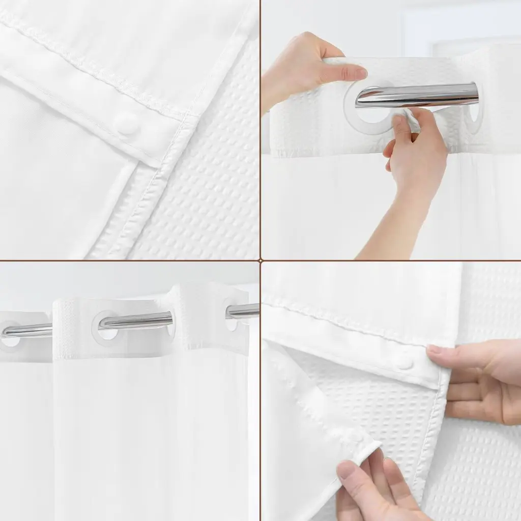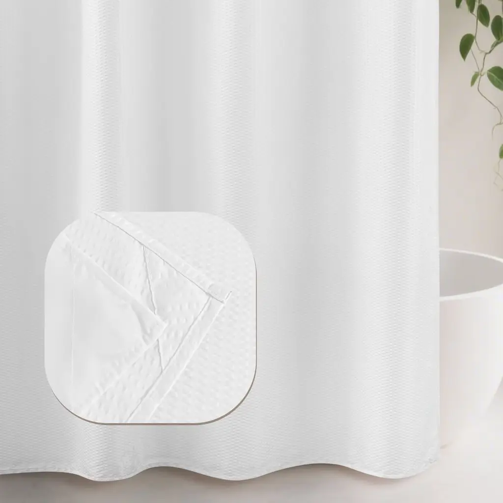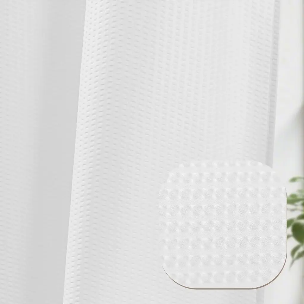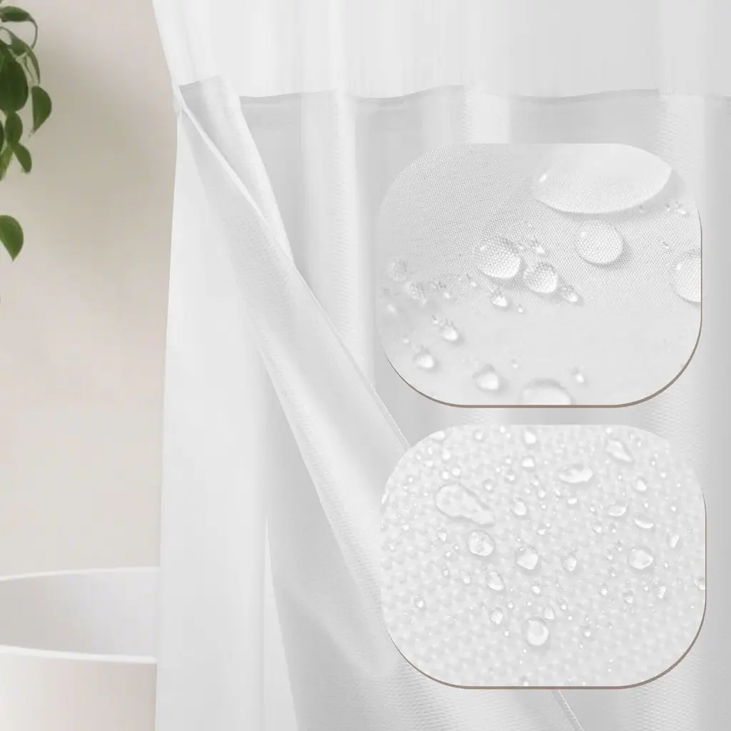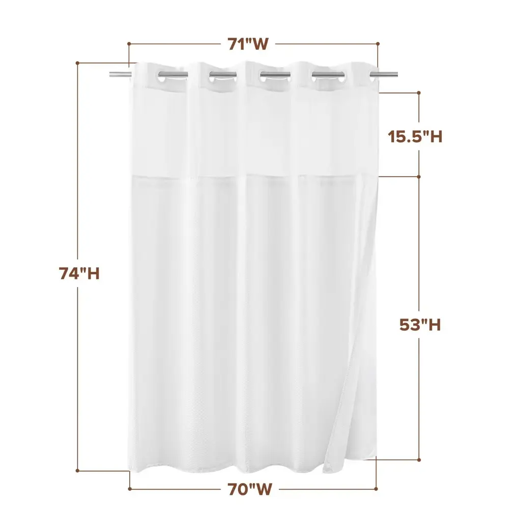 This Embossed Shower Curtain adds texture and timelessly elegance to your bathroom. Built-in split grommets makes it no extra hooks required and easy to hang. Top sheer window allows natural air and light to flow into while maintaining the privacy. Detachable water repellent fabric liner helps prevent water from splashing out and keep your bathroom floor dry, easy to snap on/off for cleaning or replacing. This classic and versatile embossed shower curtain with snap-in liner set is perfect for various bathroom decor styles, providing both aesthetics and functionality. Standard size 71"Wx74"L fits most standard showers and tubs.Features:Dimensions:
