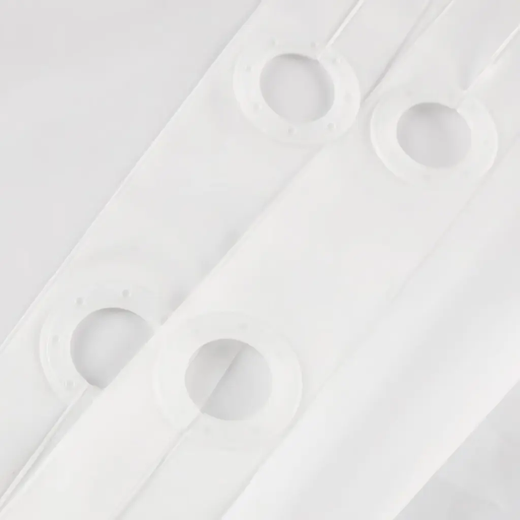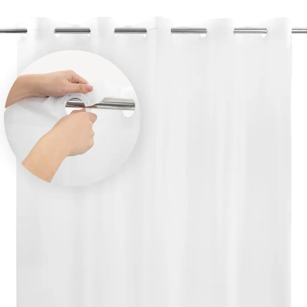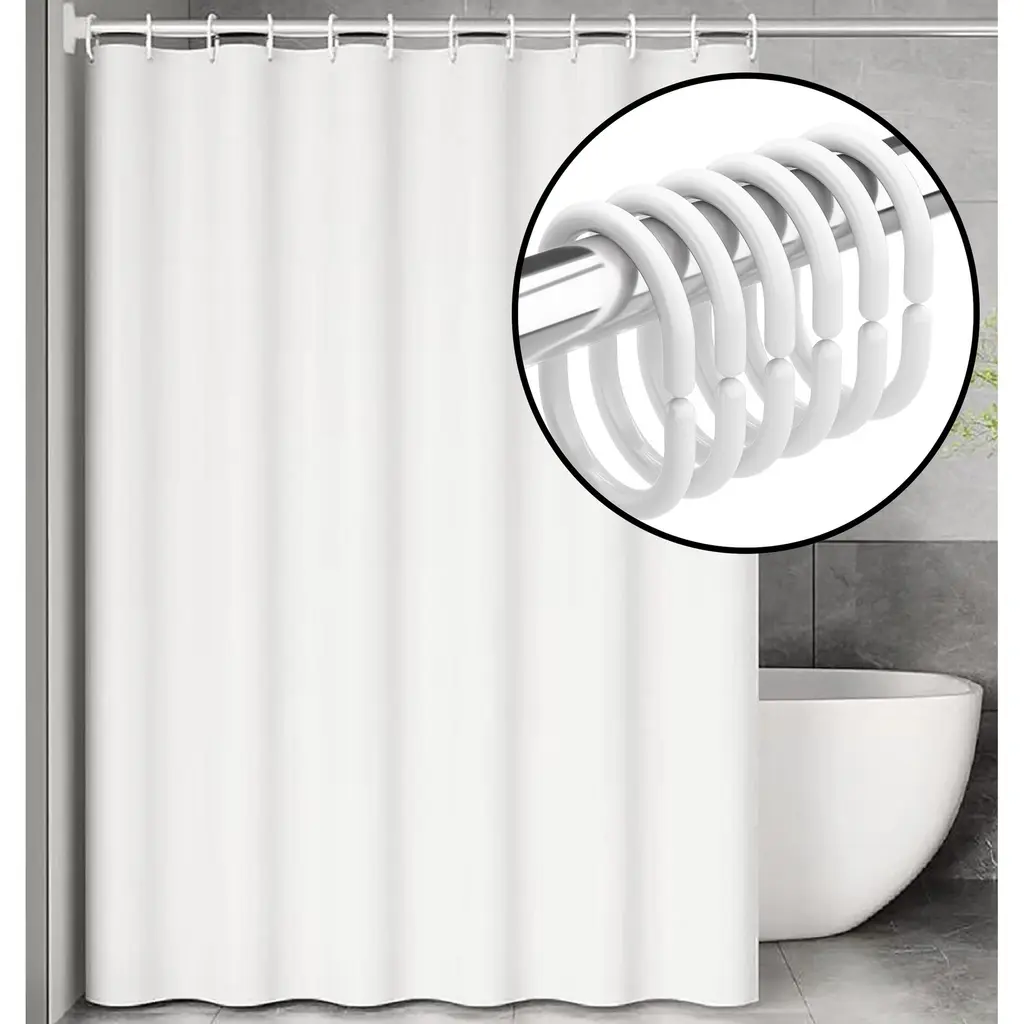 This No Hook heavy duty PEVA shower curtain liner is perfect for adding functionality and style to your bathroom.The built-in split rings make it no extra hooks required for effortless installment.The magnets at bottom keep the liner in place, preventing it from moving during use. This shower curtain liner provides a sleek and modern look to any bathroom. 100% Waterproof, can be used alone or as a liner to protect your favorite curtain. Standard size 71"Wx74"L fits most standard showers or tubs. Features:Dimensions: