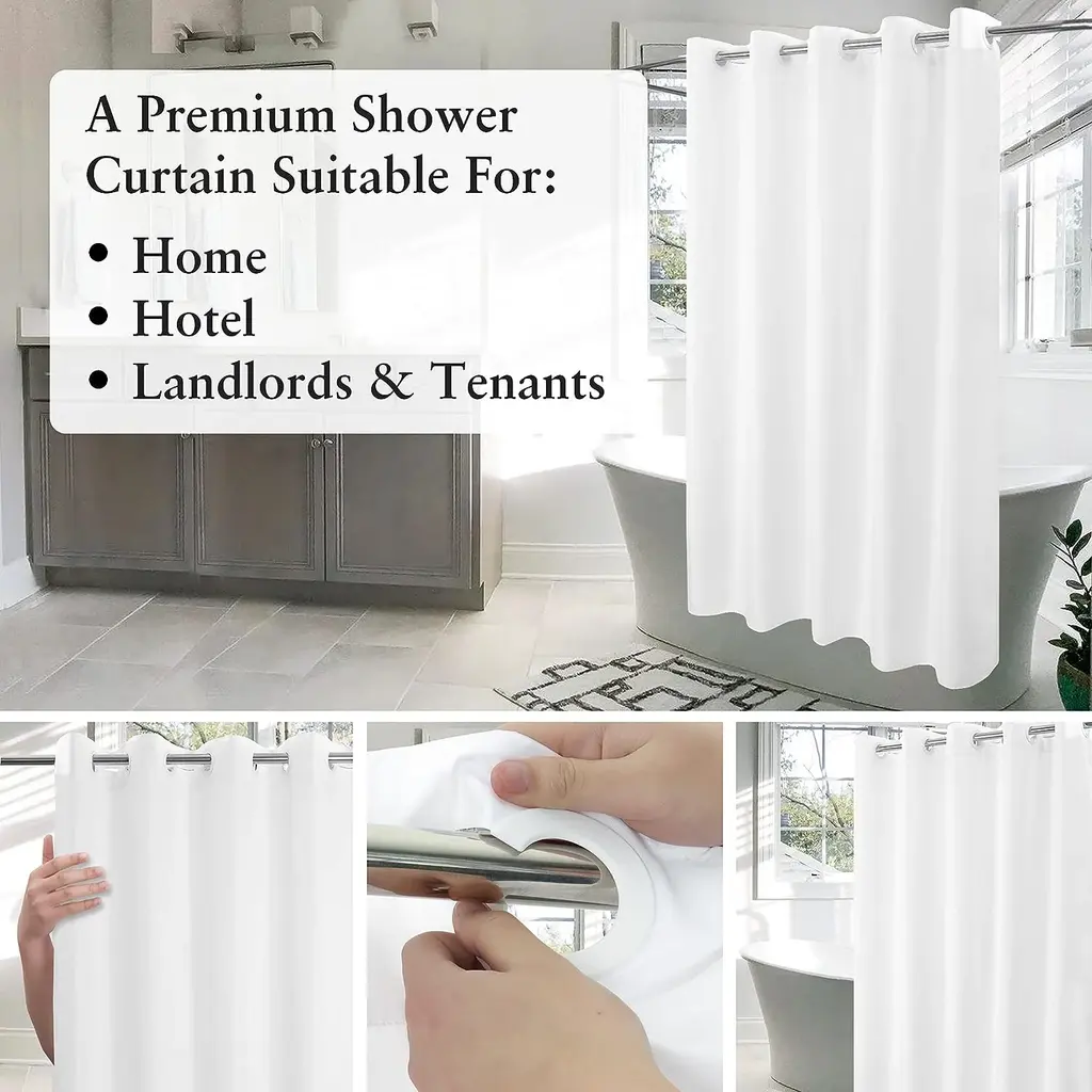 NO HOOKS NEEDED: Designed with built-in "Split Rings" for effortlessly installing & removing within seconds, time saving and no additional hooks needed, 71x74(same size as 71x72 hooked shower curtain) 100% Waterproof: This no hook white fabric shower curtain can resist water with soft feel, quick to dry, can be used a stand-alone curtain or liner Hotel Quality: The plain weave microfiber shower curtain is made of premium fabric with 100gsm, light-weight and no chemical smell like peva/plastic one Easy Care: Machine washable shower curtain with NO HOOK design allows easy installation and removal for cleaning, the standard size fits most of bathrooms Magnetic Hem: This white cloth shower curtain is weighted with 2 corner bottom magnets, help keep it in place and hang naturally