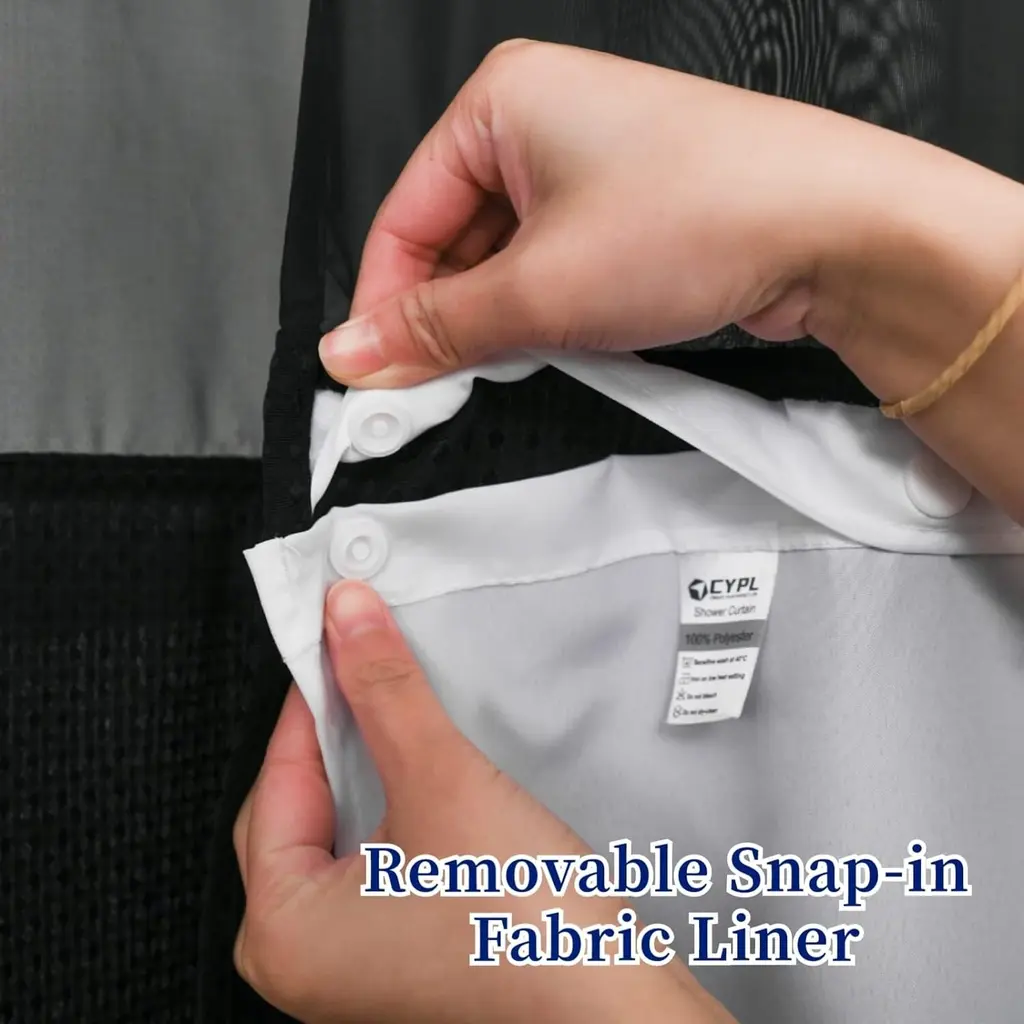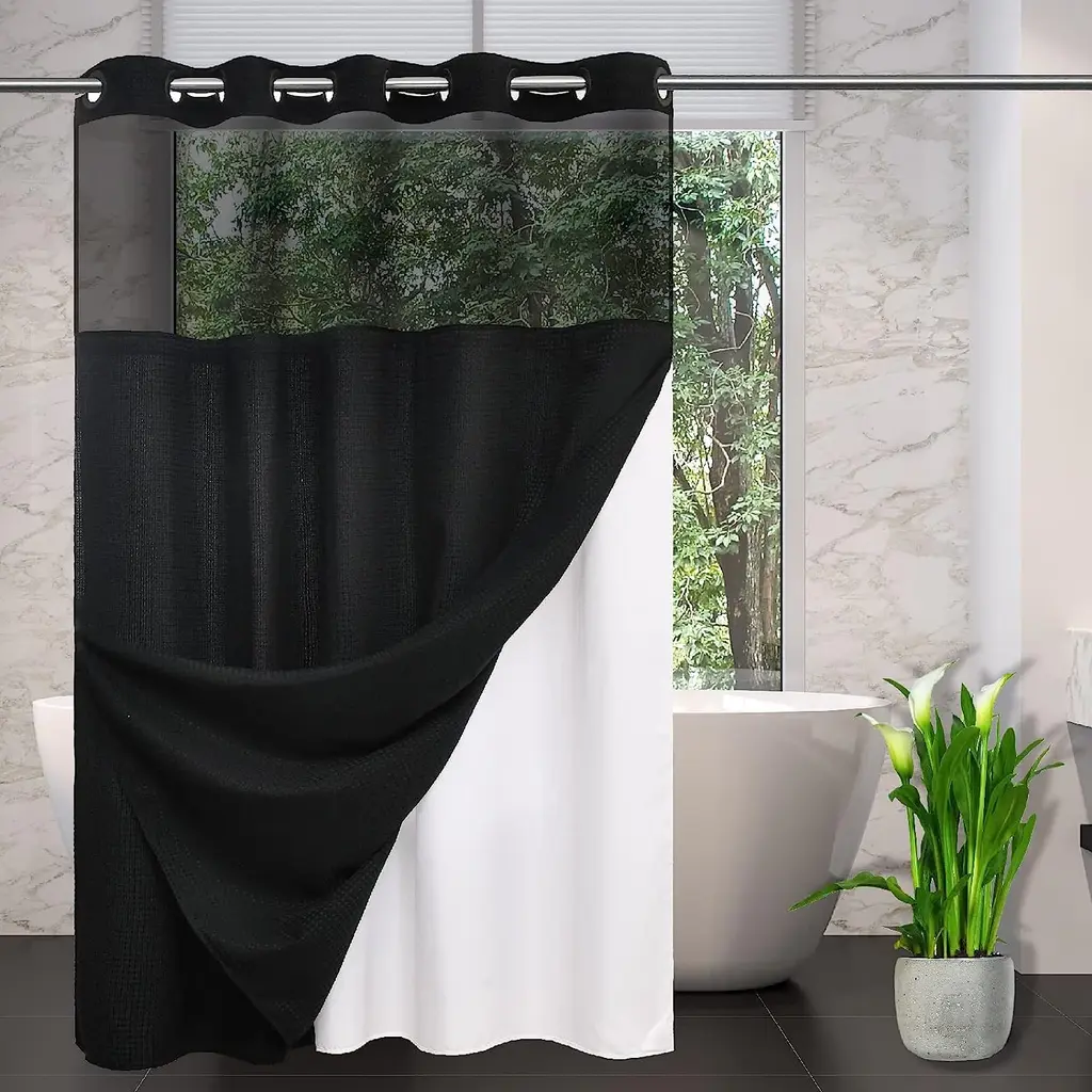 🛁[All-in-one Classic Pattern & Eco Fabric]:This no hook shower curtain with snap in liner contains:230 gsm premium thick heavy weight waffle weave material to keep it in place.100 gsm removable polyester liner,2 bottom magnets on both corners.Let you enjoy your luxury hotel grade bath ✅[ Built in Rings & Super Easy to Install]:Convenience is the key! Smart hook free design,This ringless shower curtain makes it easy to hang your black waffle shower curtain on the rod within seconds! 🛁[Sheer Viewing Window]:Transparent clear vision window above panel allows light in, increases airflow and allows you to see out while maintaining privacy. This gromment snap on shower curtain will give you a hotel brand luxury spa bathing experience 💦[Good Water Resistant]: This shower curtain and liner set are both water repellent ,allowing water to glide off inside bathtub and quick to dry. This solid color textured hotel collection shower curtain always makes your bathroom elegant pretty and clean ⭐️[Easy To Care ]:This textile hotel shower curtain with detachable liner can be easily cared with machine wash or hand wash.This 71W X 74H inch snap shower curtain with 70" W x 54"H attached replacement cloth inner liners fits for any standard size shower, bathtubs ,clawfoot tub ,and straight or curved shower rods