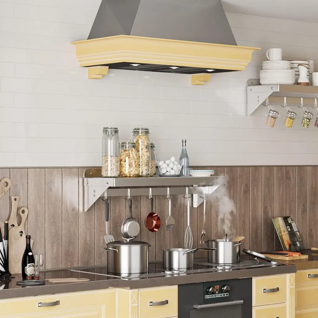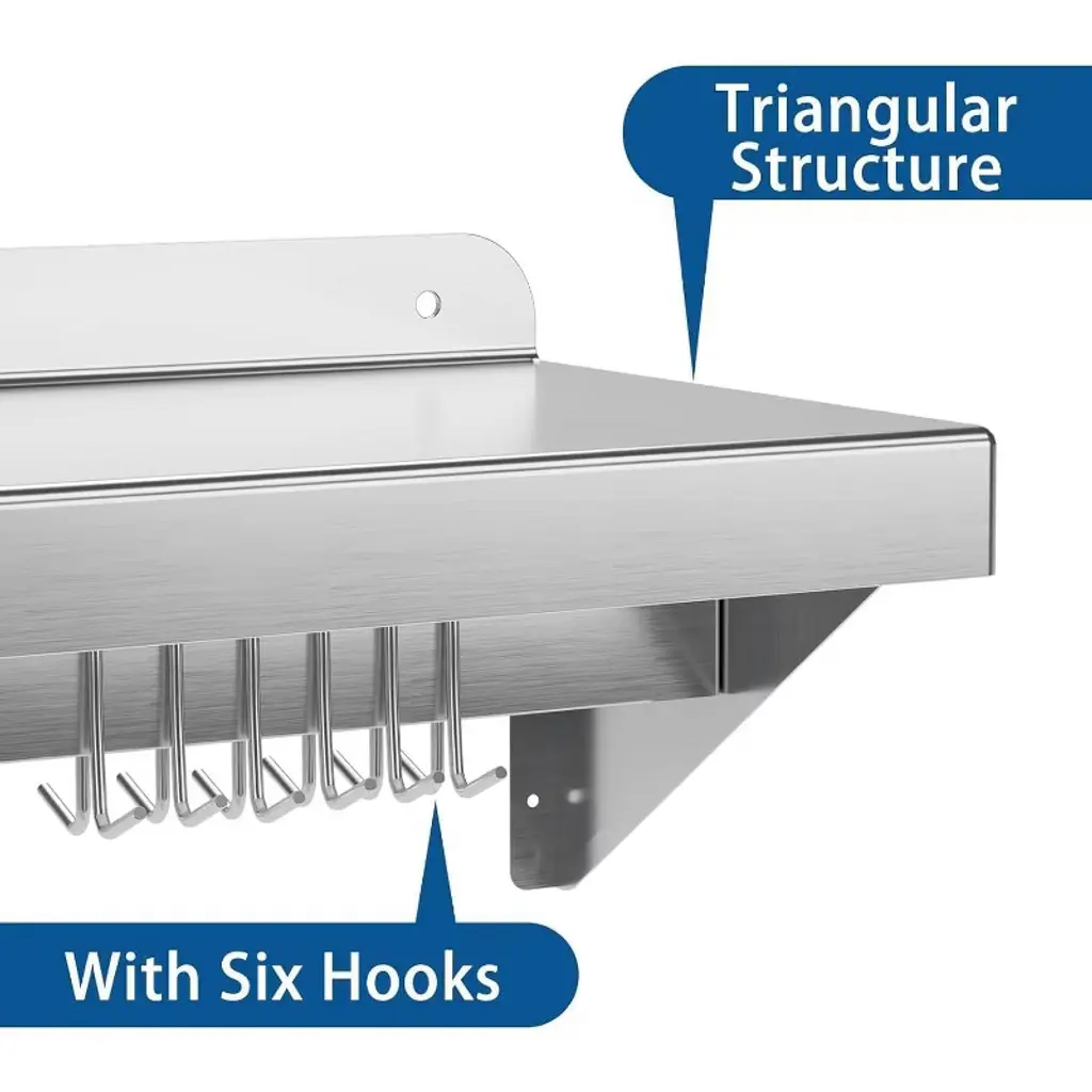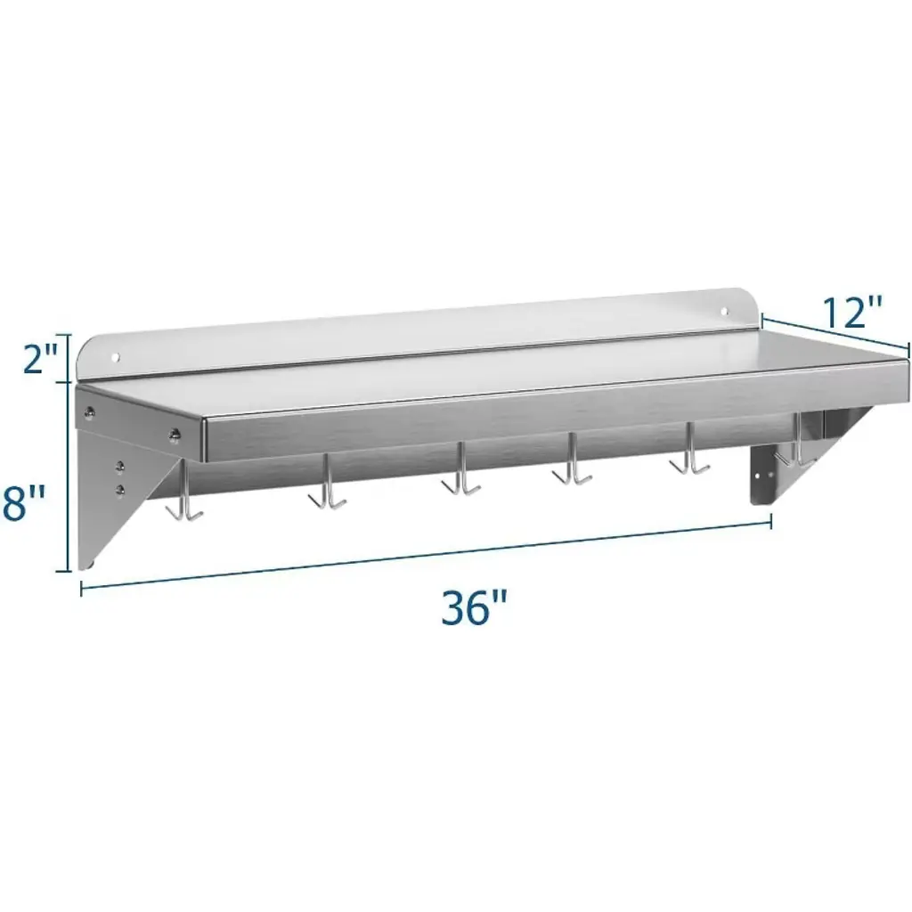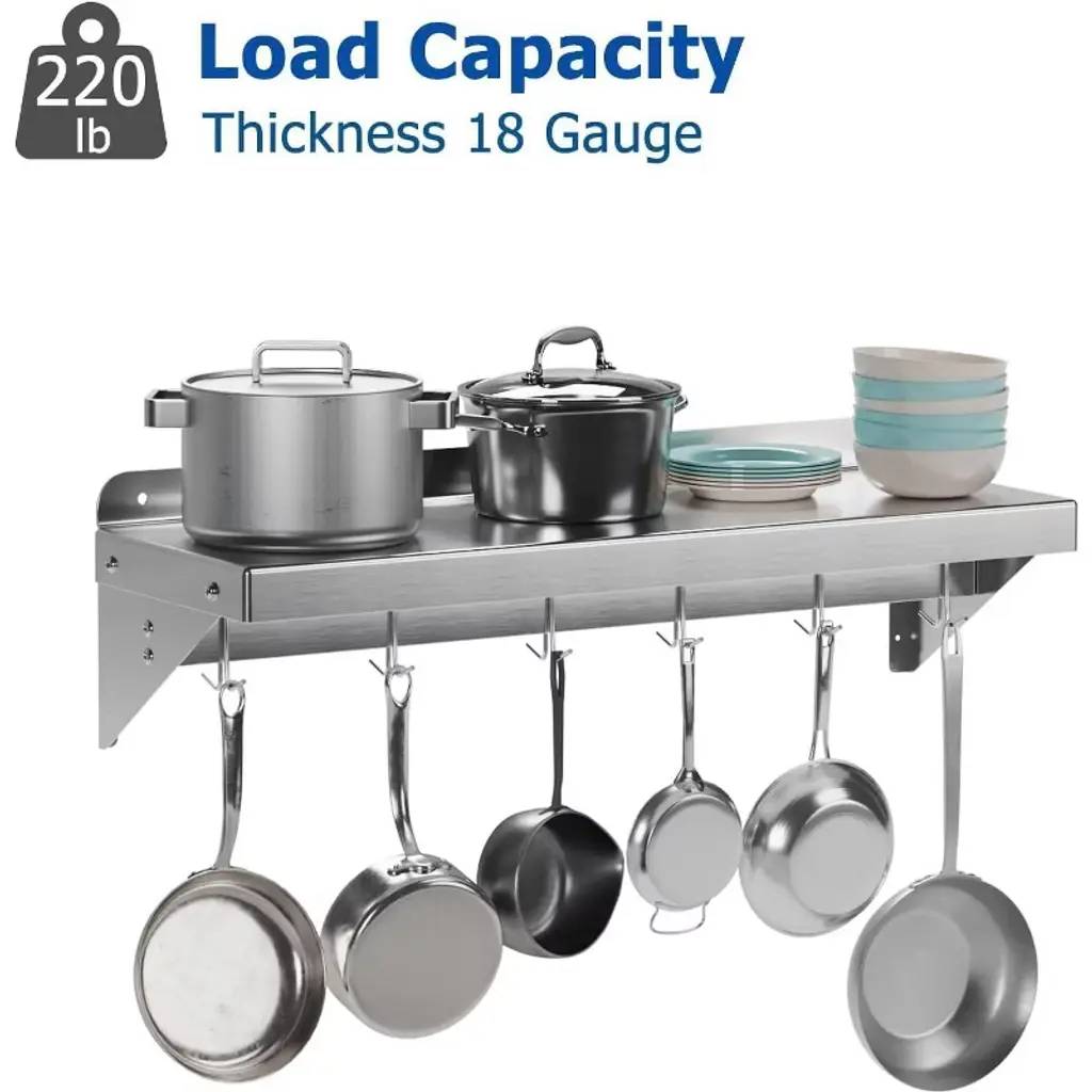 Transform your kitchen organization with this professional stainless steel floating shelf featuring multiple sturdy hooks. Its rust-resistant construction provides lasting durability while creating valuable storage space for frequently used cookware and kitchen essentials. The sleek NSF-certified design combines commercial reliability with home kitchen convenience.