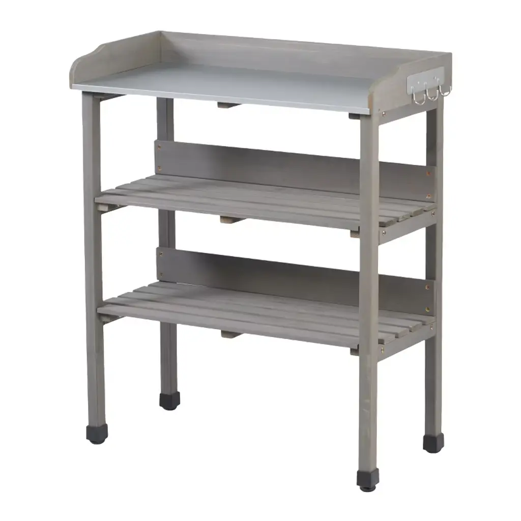 Crafted from durable solid wood with a rust-resistant metal tabletop, this 3-tier potting table offers ample storage and workspace for gardening tasks. Equipped with side hooks for tools and sturdy shelves for pots and supplies, it’s ideal for use in gardens, patios, or garages. The compact design fits small spaces while providing efficient organization and a comfortable working height.