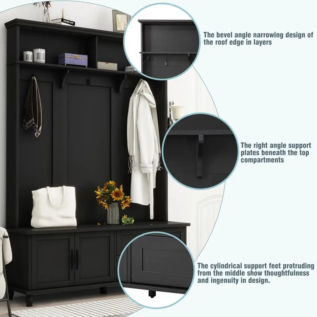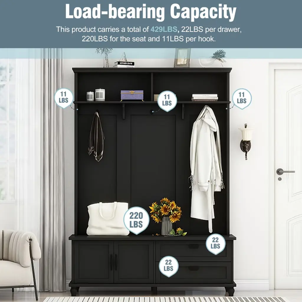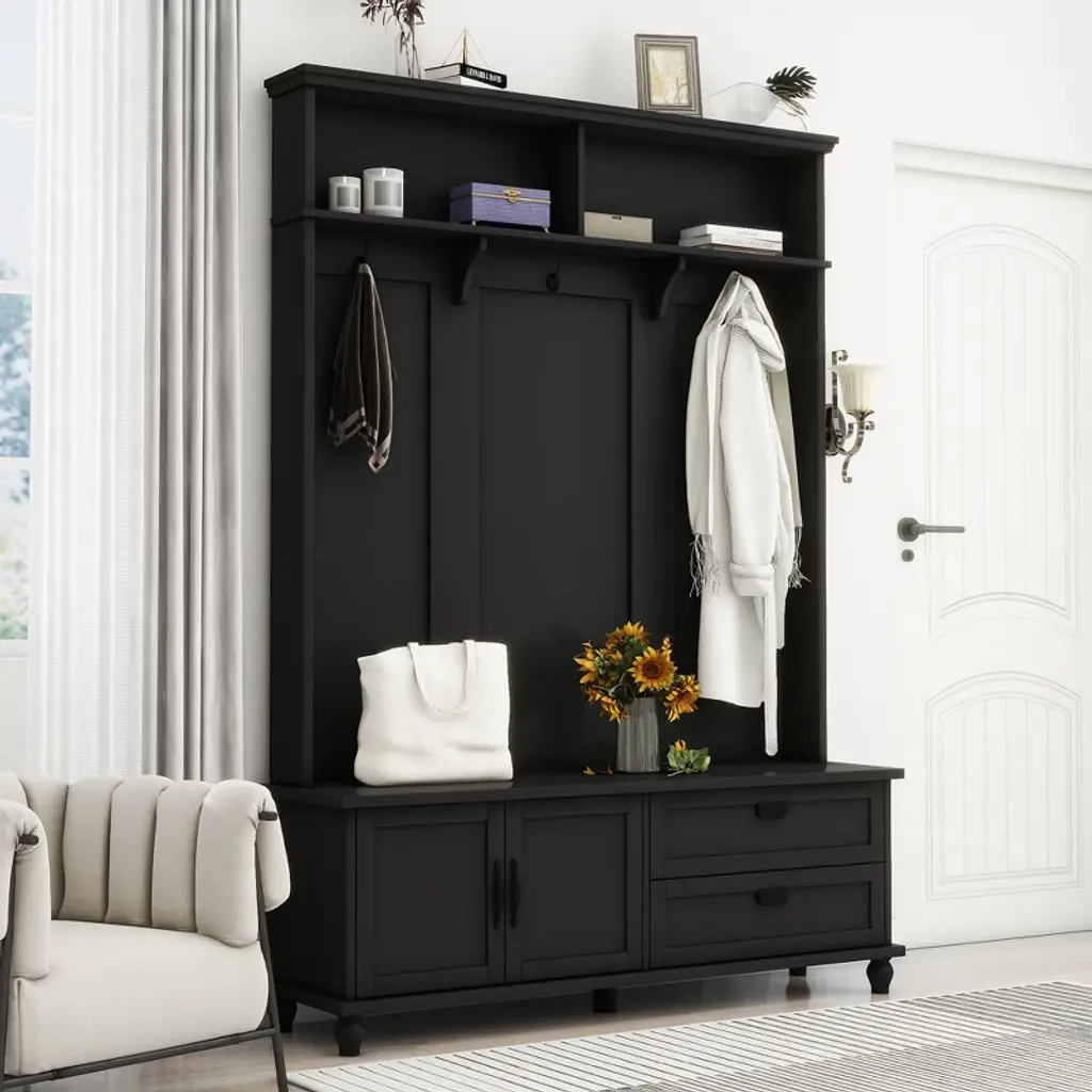 Orrd Modern Hall Tree Bench With Storage | 5-hook Mudroom Organizer & 2-drawer Cabinet | Entryway Furniture,black