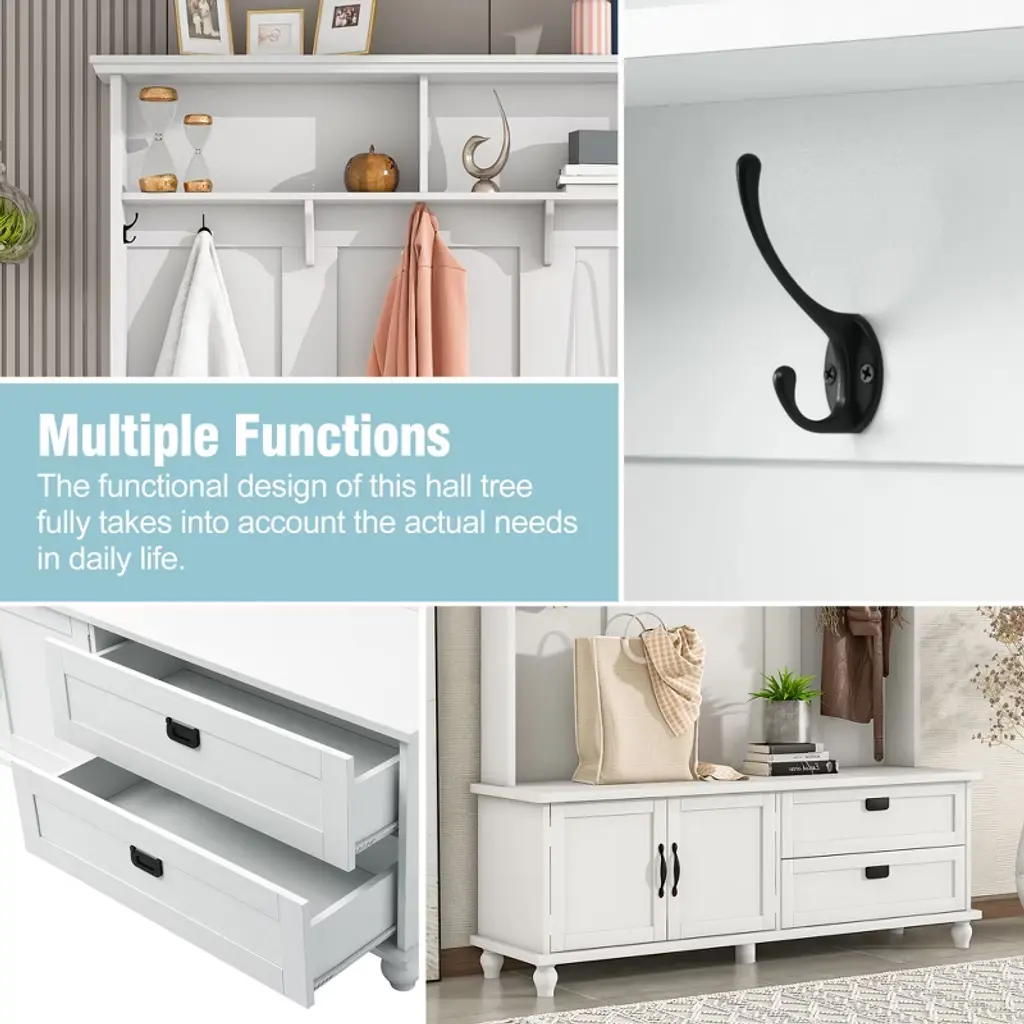 Upgrade your entryway with this multifunctional modern hall tree! Features a sturdy storage cabinet, 2 large drawers, 5 coat hooks, and a wide mudroom bench. Made with superior particle board for durability and stability. Perfect for organizing coats, shoes, and accessories while saving space!