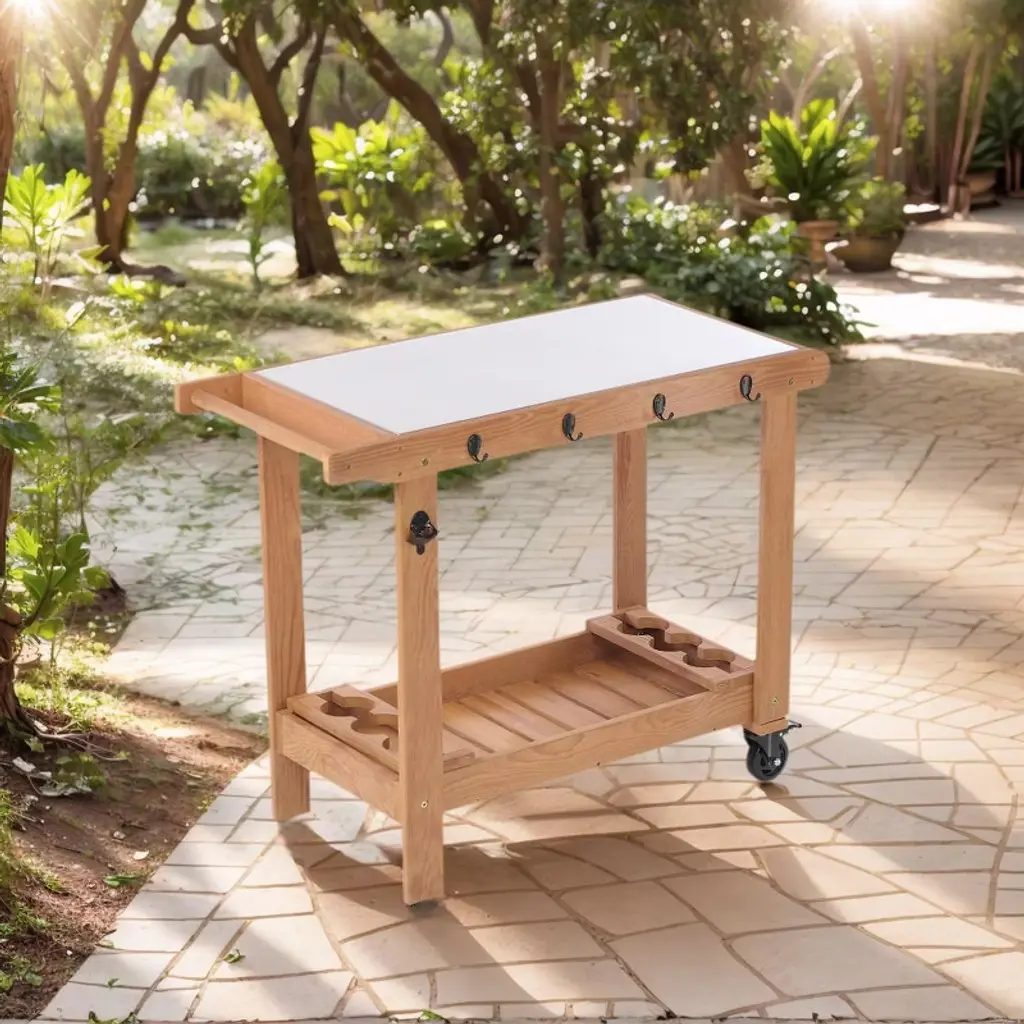 Outdoor Wooden Garden Cart Table With Wheels, Metal Top And Storage Hook, For Patio Backyard Garden