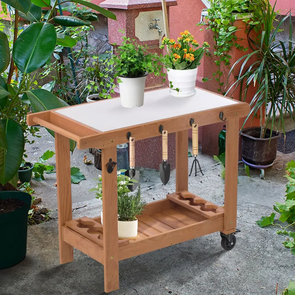 Outdoor Wooden Garden Cart Table with Wheels, Metal Top and Storage Hook, for Patio Backyard Garden