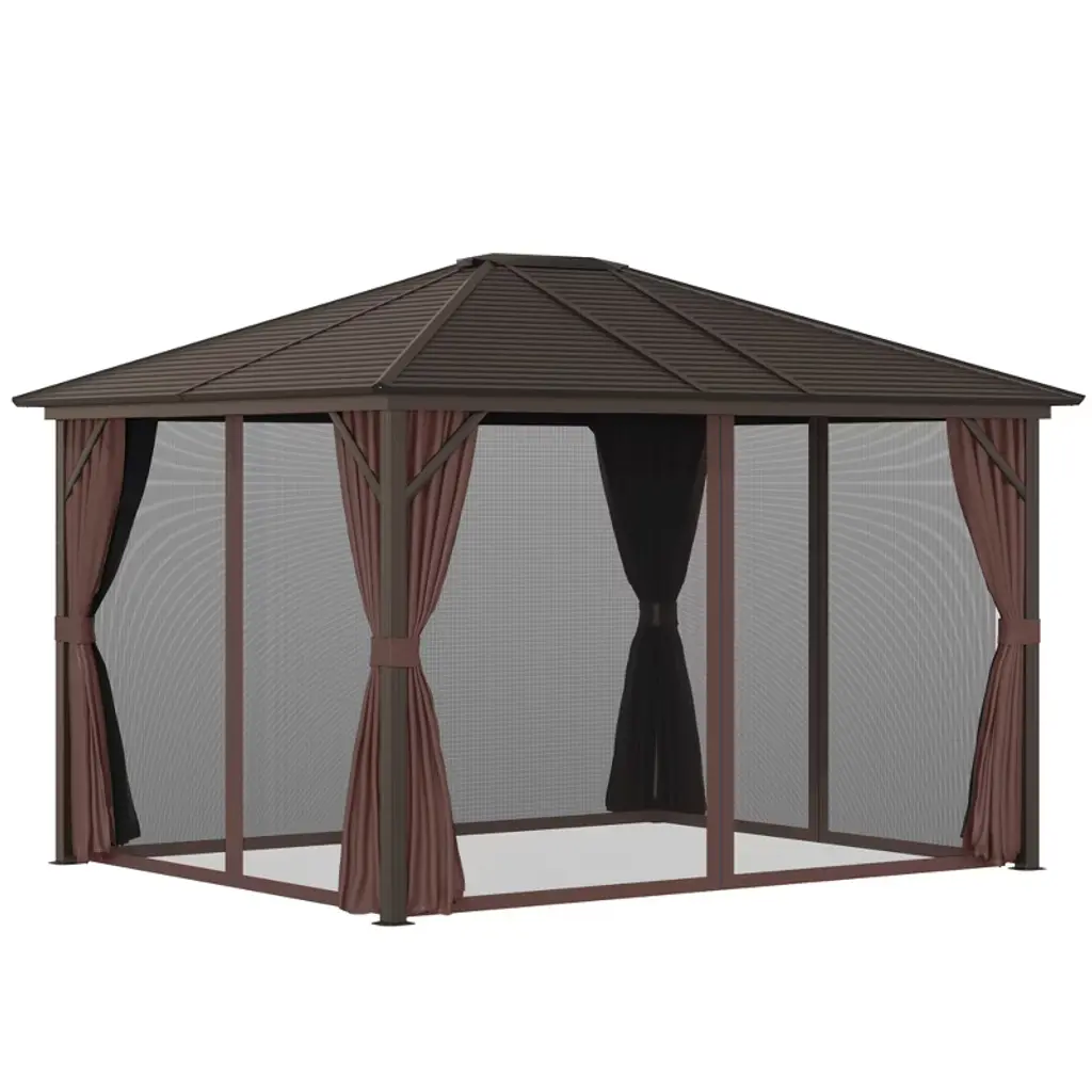 Outsunny 10' X 12' Hardtop Gazebo With Aluminum Frame, Permanent Metal Roof Gazebo Canopy With 2 Hooks, Curtains And Netting For Garden, Brown