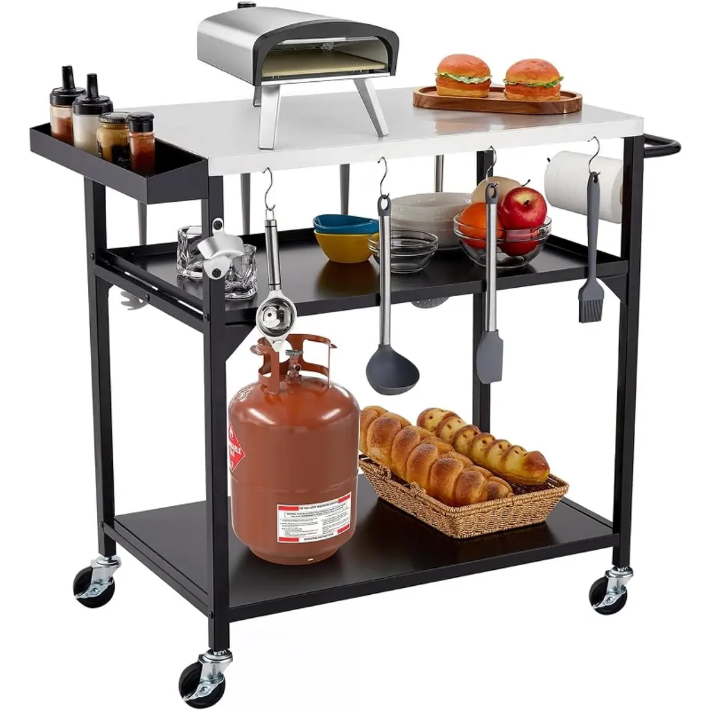 Transform your outdoor cooking with the Outsunny Grill Cart, a robust stainless steel table with wheels designed to withstand high temperatures and resist rust. This versatile outdoor kitchen island features a foldable side table, handy hooks, and smooth-rolling casters for easy mobility, making it great as an outdoor grill table, pizza oven stand, or stylish outdoor bar cart.