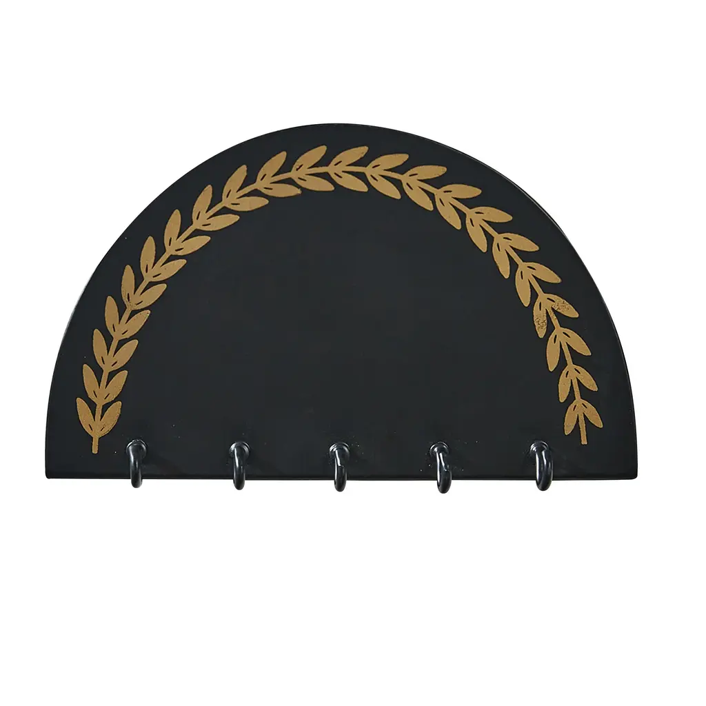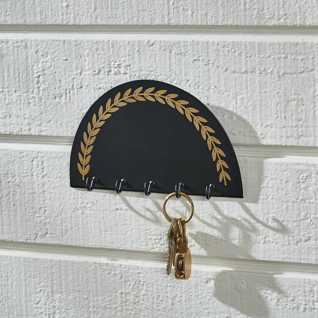 A beautiful golden key hook that is easily installed and features five hooks. Attention to detail, this wall organizer is designed with precision and care. Add some functional style to your space with this five-hook key hook, expertly crafted from a metal construction with an elegant gold leaf motif against a sleek, black ground. The design fits into most home decor trends and makes a thoughtful hostess or birthday gift for someone special, or a perfect addition to any organized home.